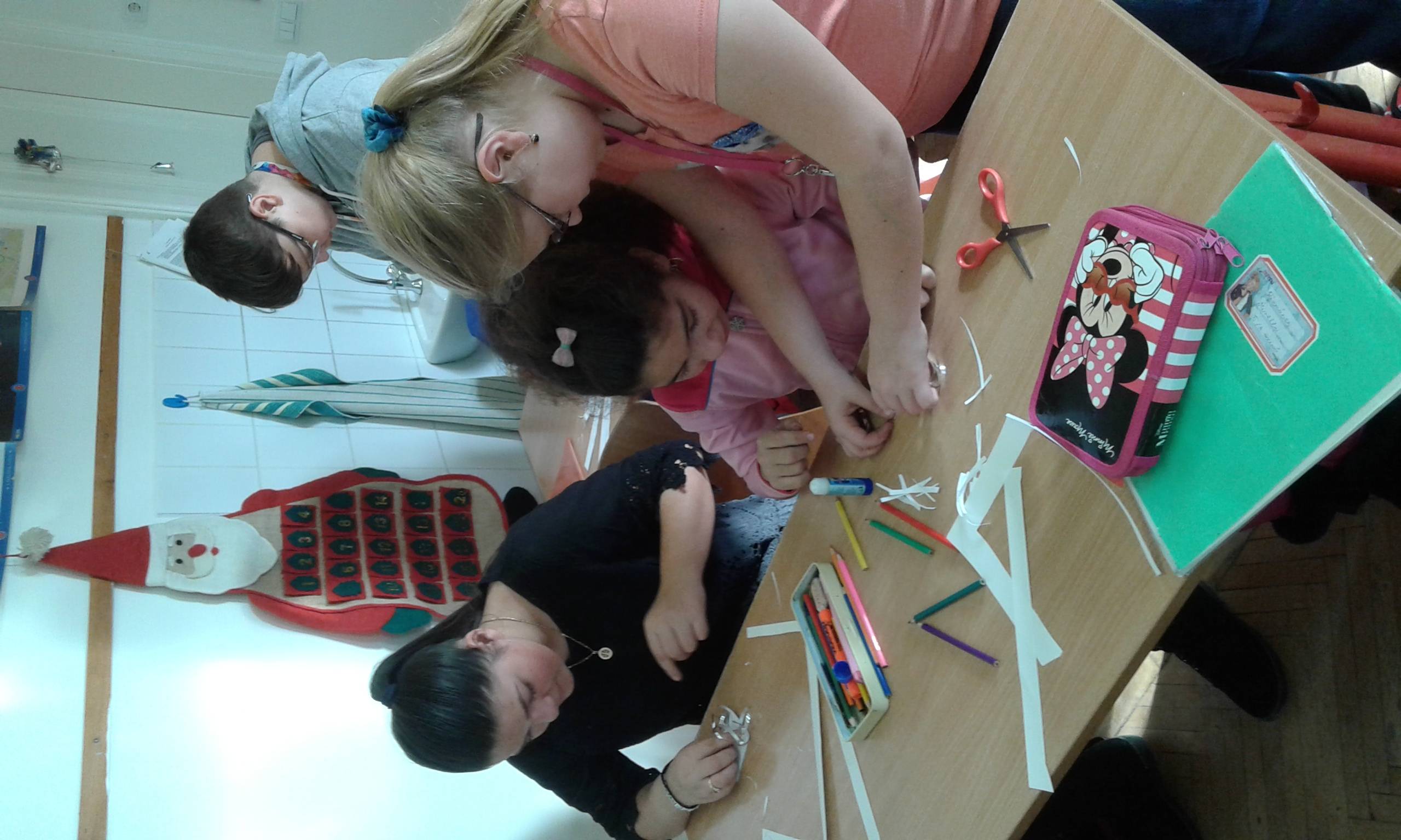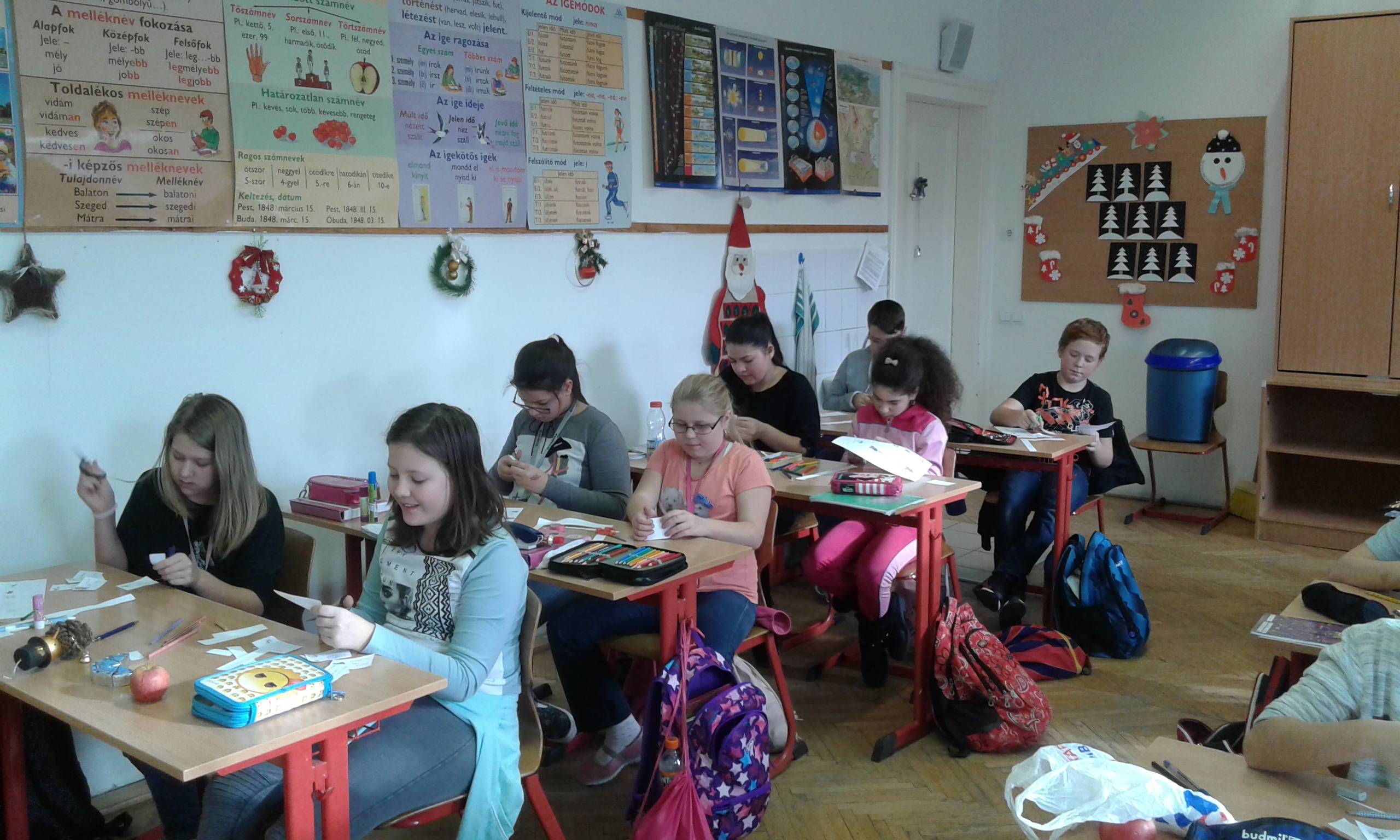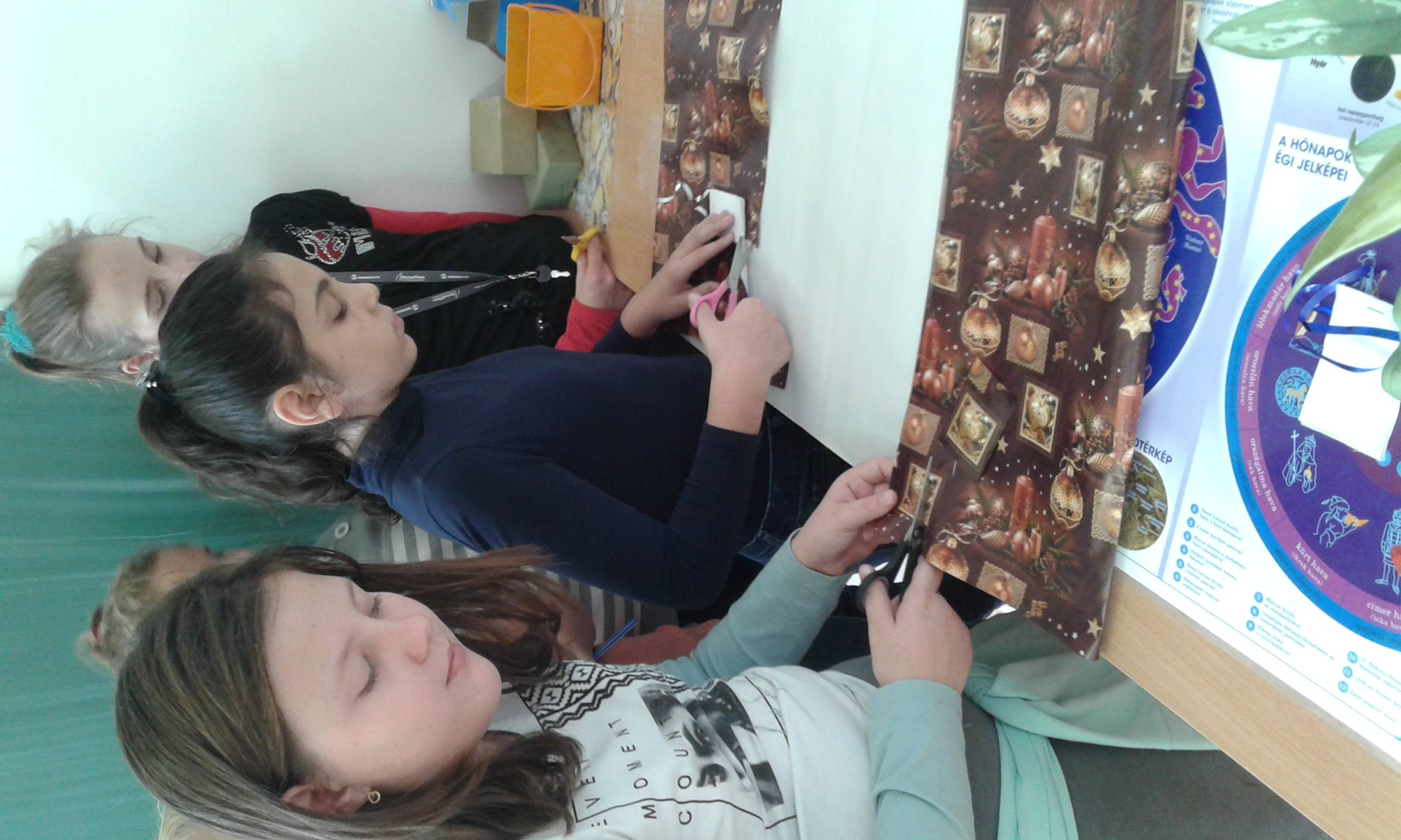 Ajándék készítése az ünnep közeledtével szeretteinknek. Az ajándék egy kuponfüzet, melyen boldogságot okozó cselekedetek vannak(pl.:közös film nézése, masszázs, reggeli az ágyban, egy nagy ölelés,…). Aki kapja minden nap választhat, mit szeretne, hogy teljesüljön a kínálatból. Szükséges eszközök: olló, ragasztó, tűzőgép, A/4-es nyomtatópapír, csomagolópapír, díszszalag. Előzetes feladat: Mivel okozhatunk a másiknak boldogságot? Egy rövid videófilm megnézése után( melyben az idős apuka csak úgy tudja karácsonyra hazahívni gyermekeit, hogy táviratot küld, hogy meghalt.)beszélgettünk, hogyan tudunk örömet, boldogságot okozni szeretteinknek. A gyerekek által hozott ötleteket közösen megvitattuk, majd a legjobbakat kiválasztva, néhány tanuló segítségével egy egységes, tíz cselekedetből álló kártyasorozatot alkottunk. A következő héten készítettük el magát a kuponfüzetet. Munkamenet: kártyák színezése, kinyírása, összetűzése, csomagolása, díszítőszalag felhelyezése.