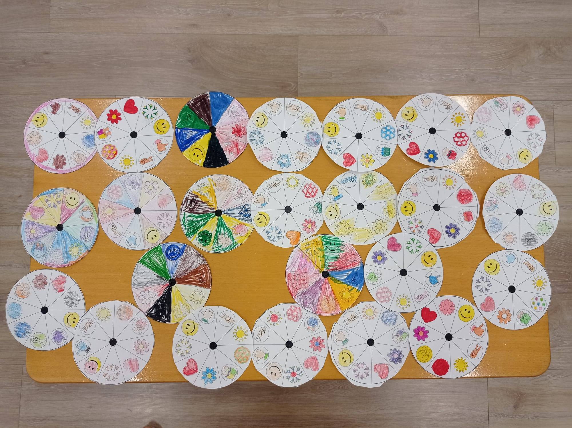 Az idei tanév utolsó boldogságóráján a Boldog erdő- Kerekerdő című mese meghallgatása és mondanivalójának megbeszélése után mindenki elkészítette a saját boldogságkerekét, majd a foglalkozást Öleléslánccal zártuk.