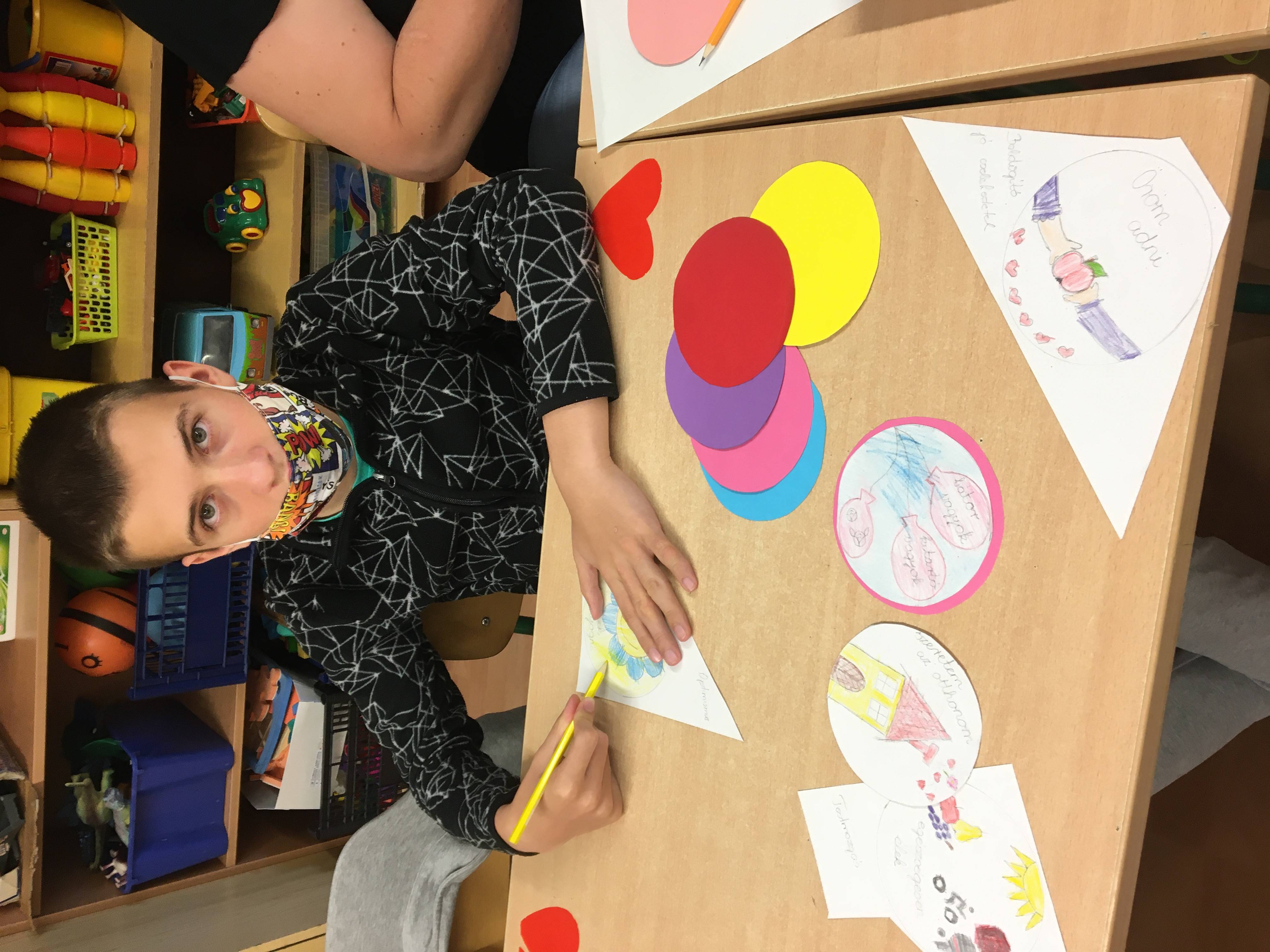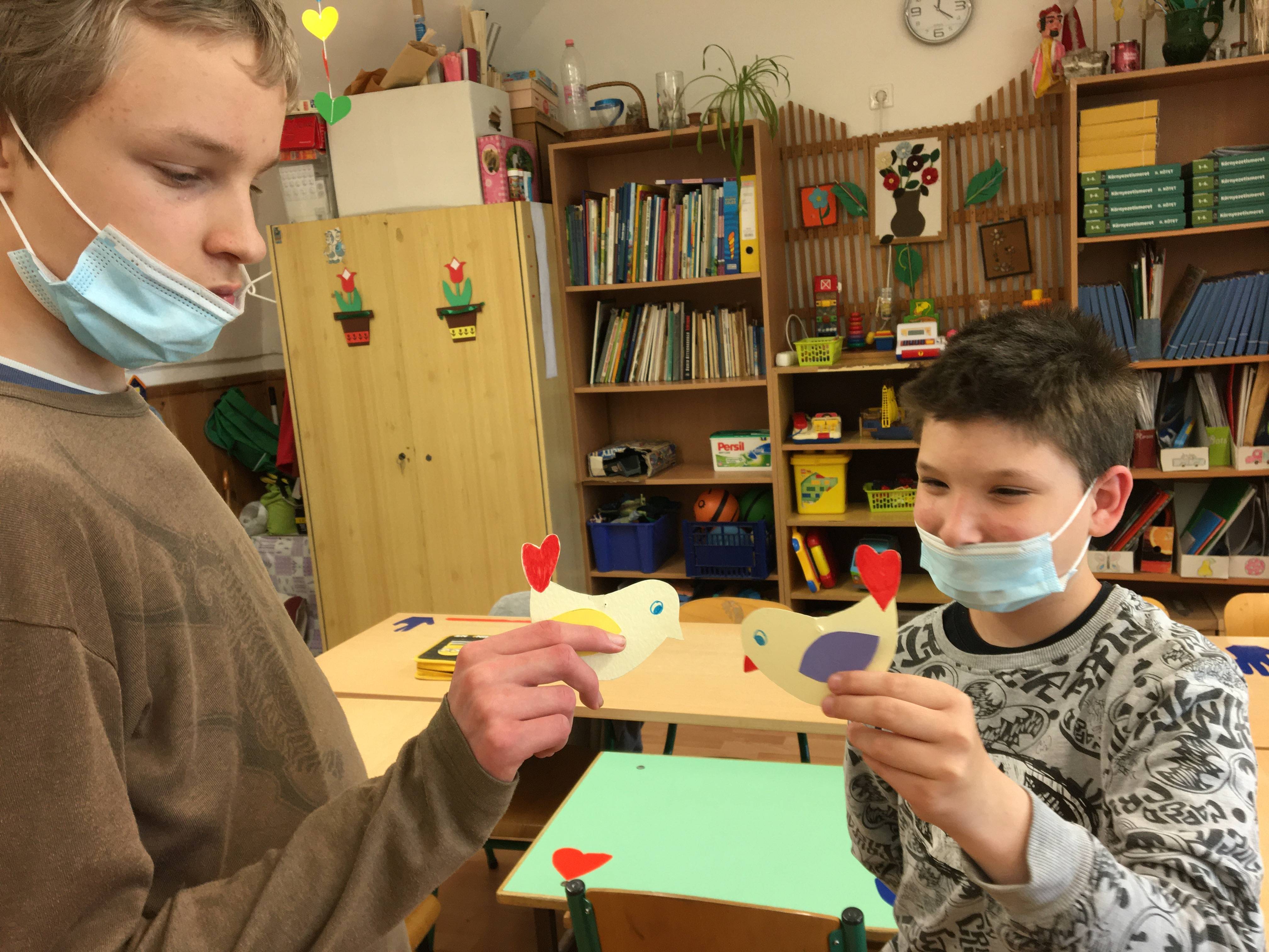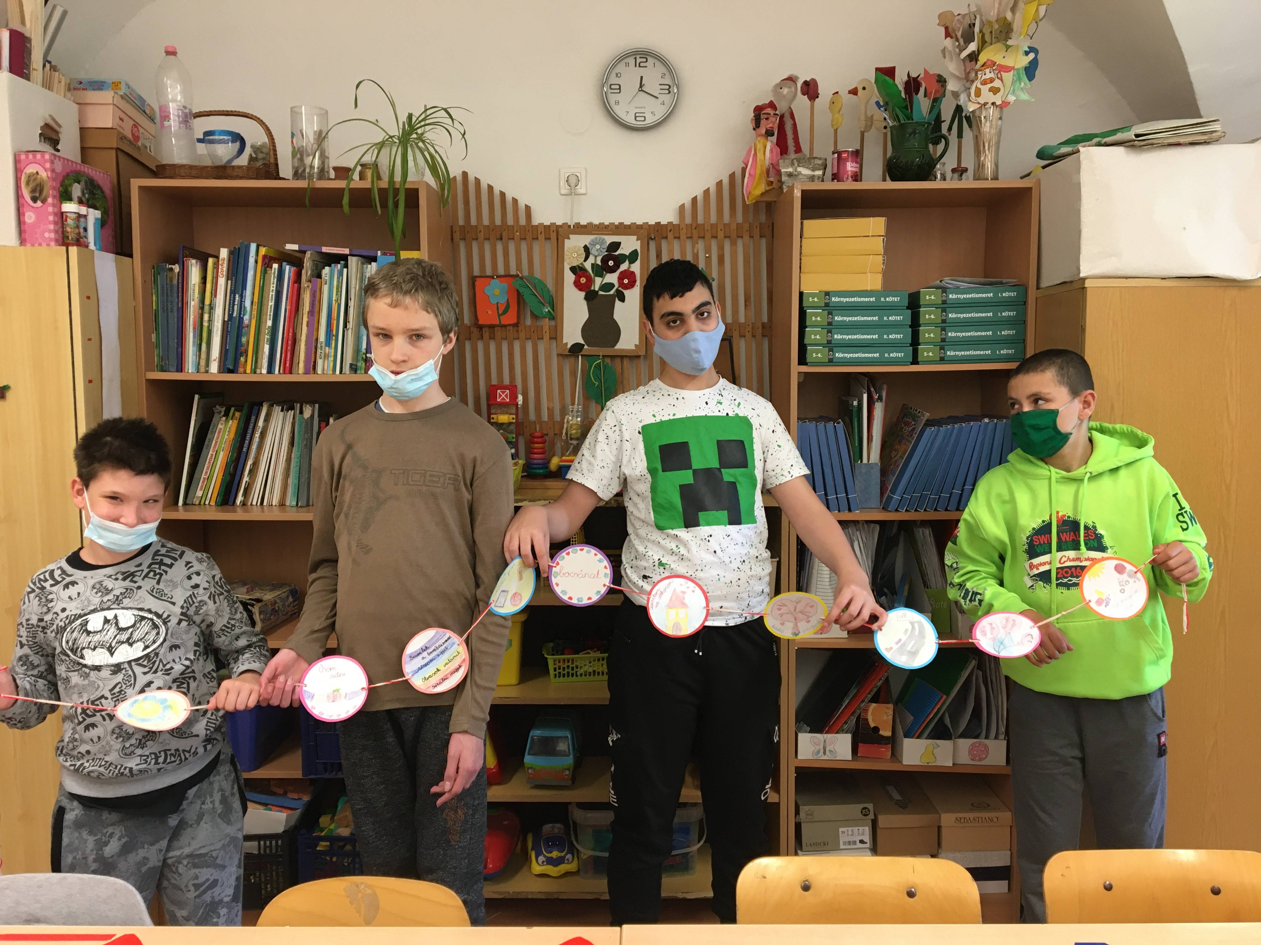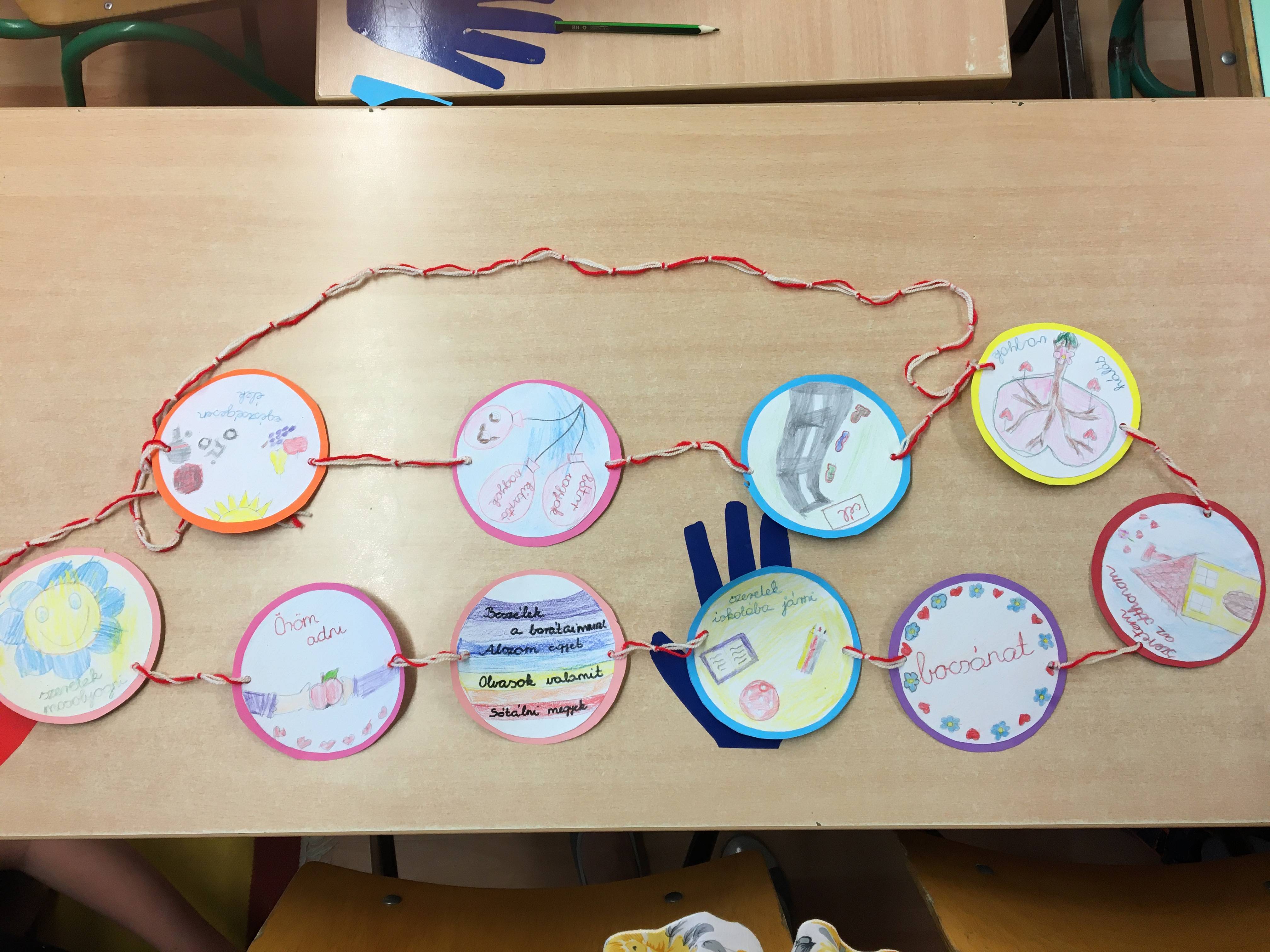 A tanév utolsó boldogságóráját relaxációs gyakorlattal kezdtük a 6. osztály tanulóival. Halk zene mellett kettő kismadarat készítettük papírból, ezek lettek a „boldogság kismadarai”. Ezután elmeséltem az „Út a boldogság országába” című mesét, majd kérdések segítségével feldolgoztuk. Bagdi Bella „Repülj velem” című dalának hallgatása közben elkezdtük a boldogságlánchoz a tanév során szerzett élményeket témák szerint rajzolni és színezni. A rajzokat színes körökre ragasztották a gyerekek, majd a „láncszemeket” egymásba fűzték. Az óra végén körben állva többször ismételve elmondtuk a „Hétfőn tervezgetek” kezdetű versikét, majd öleléslánccal zártuk az órát, amely a többi boldogságórához hasonlóan jó hangulatban telt.
