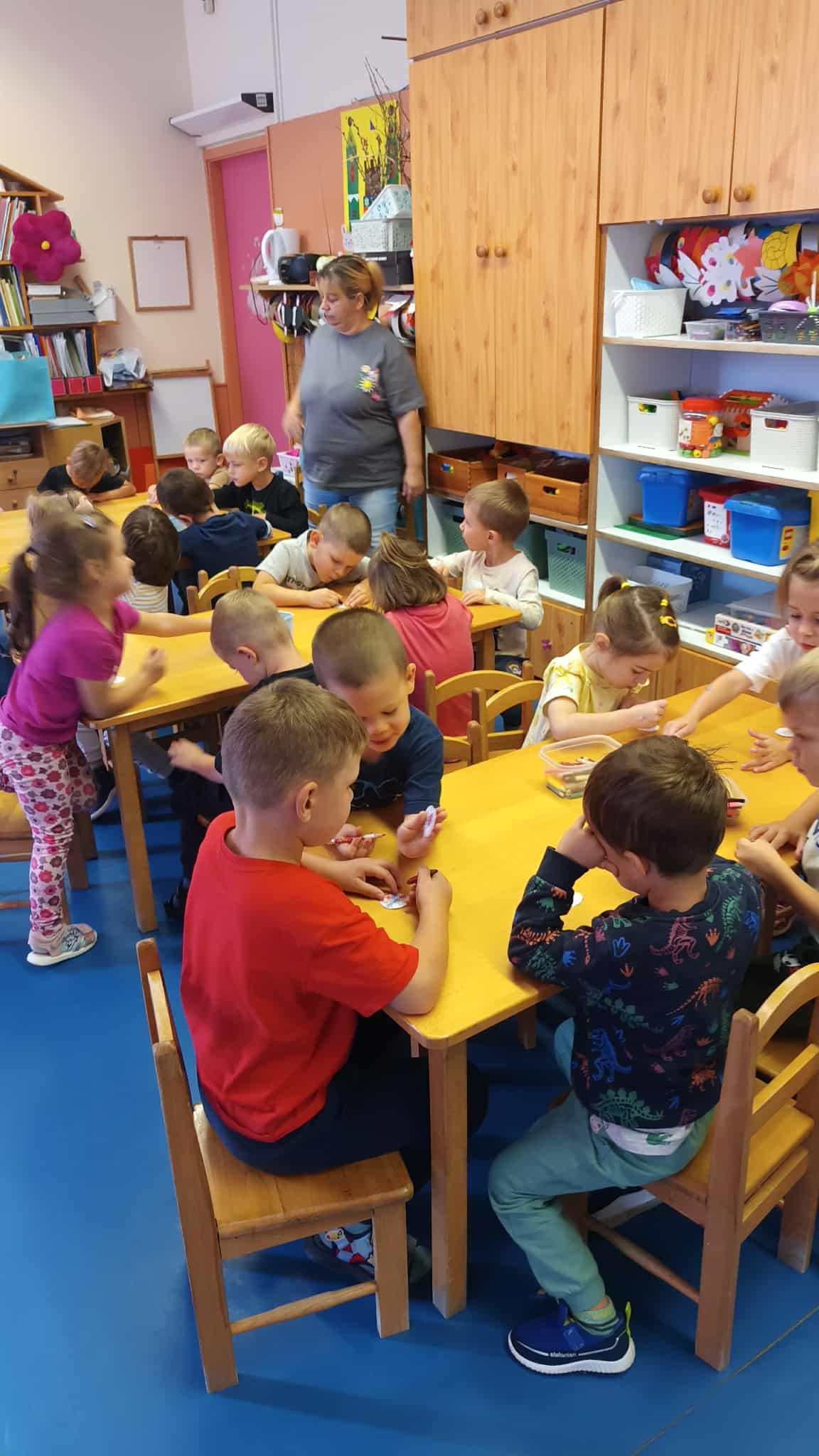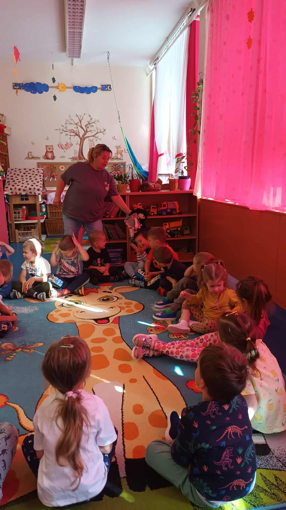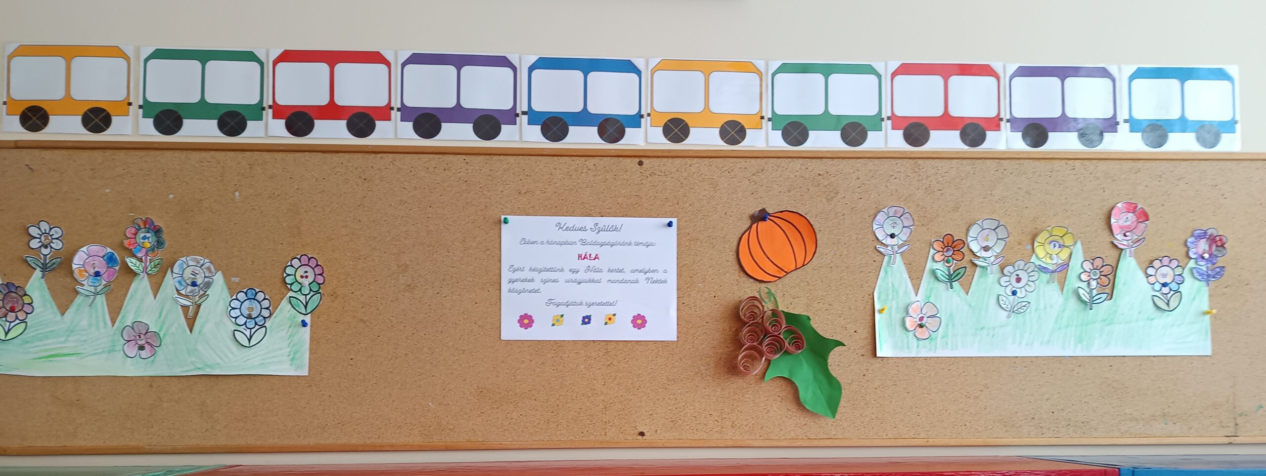 A gyerekek már vár nagyon várták Boldog Dórát, aki hozott nekik finom almát, amit az óra végén meg is ehettek a gyerekek. De előtte még játszottunk egy kicsit Add tovább játékot, ahol az adogatás közben a „Itt a köcsög” mondókat mondogattuk. Miután megláttuk a kibújó Nap sugarát a Napimádás relaxációt játszottuk el és közben a „Nap, nap fényes nap” mondókat mondogattuk. Boldog Dóra a „ Boldog vagyok” dalt hozta el nekünk, amelyre táncoltunk is. Majd megbeszéltük, hogy miért lehettünk hálásak a különböző dolgok közül. Játszottunk a Kire gondoltam játékot, ami után egy ölelés következet. Itt megbeszéltük a barátság fontosságát, amiért szintén hálások lehetünk. A Macis mese után beszélgettünk a hála fontosságáért és kiszíneztük a hála jelét. Majd készítettünk egy hála kertet a szülőknek. A legvégén pedig még táncoltunk a mosolygos smiley alatt.