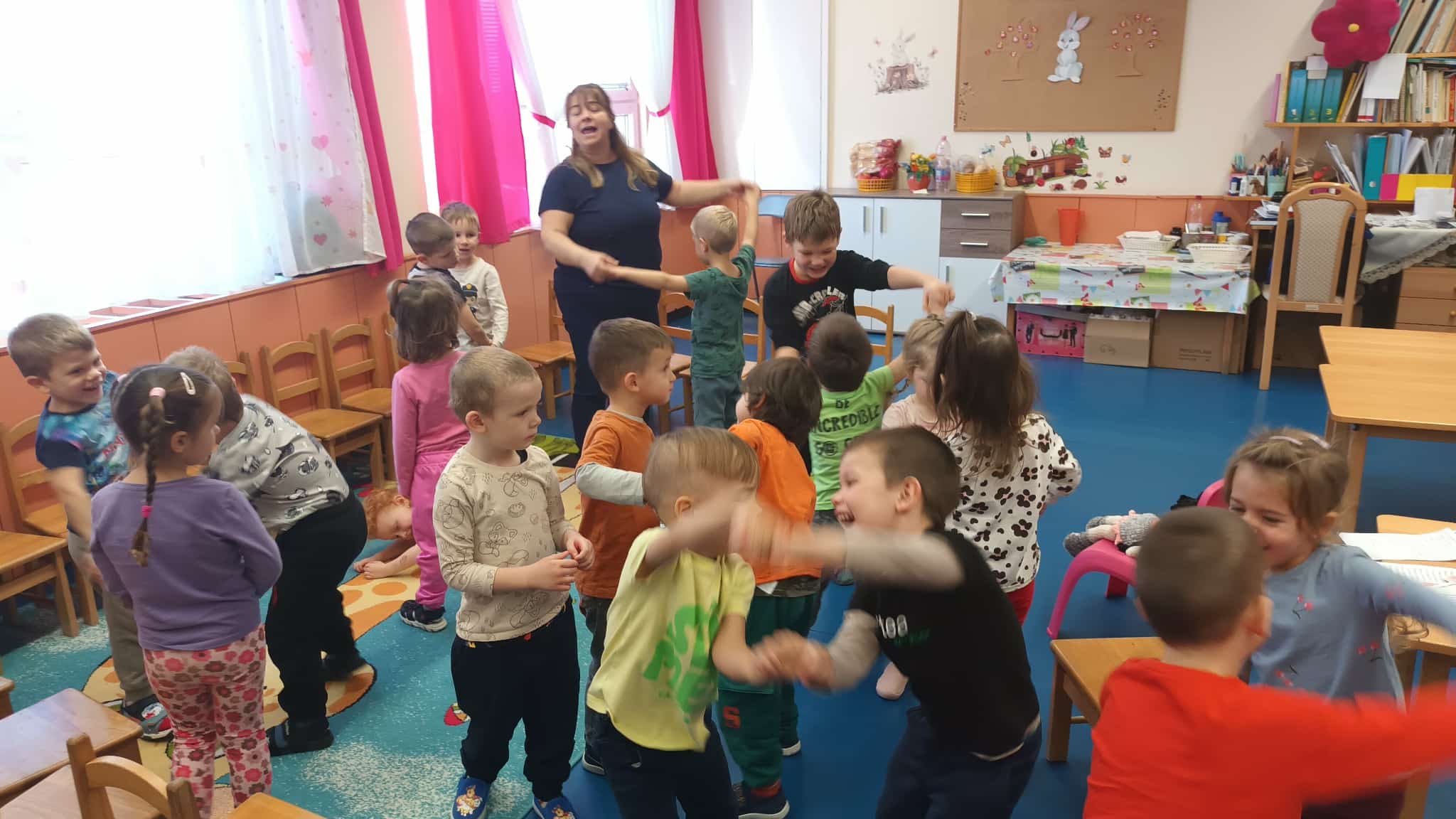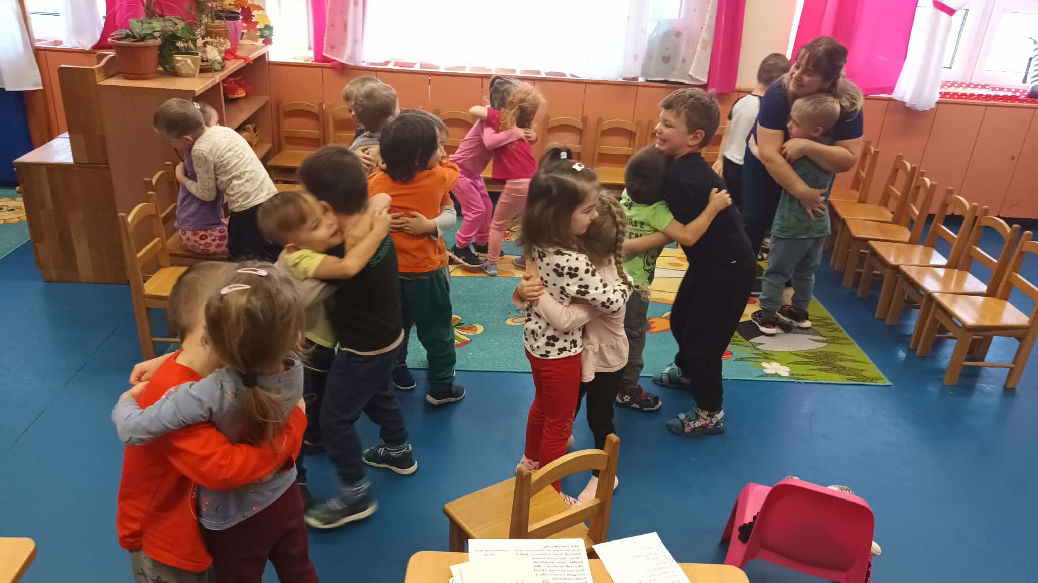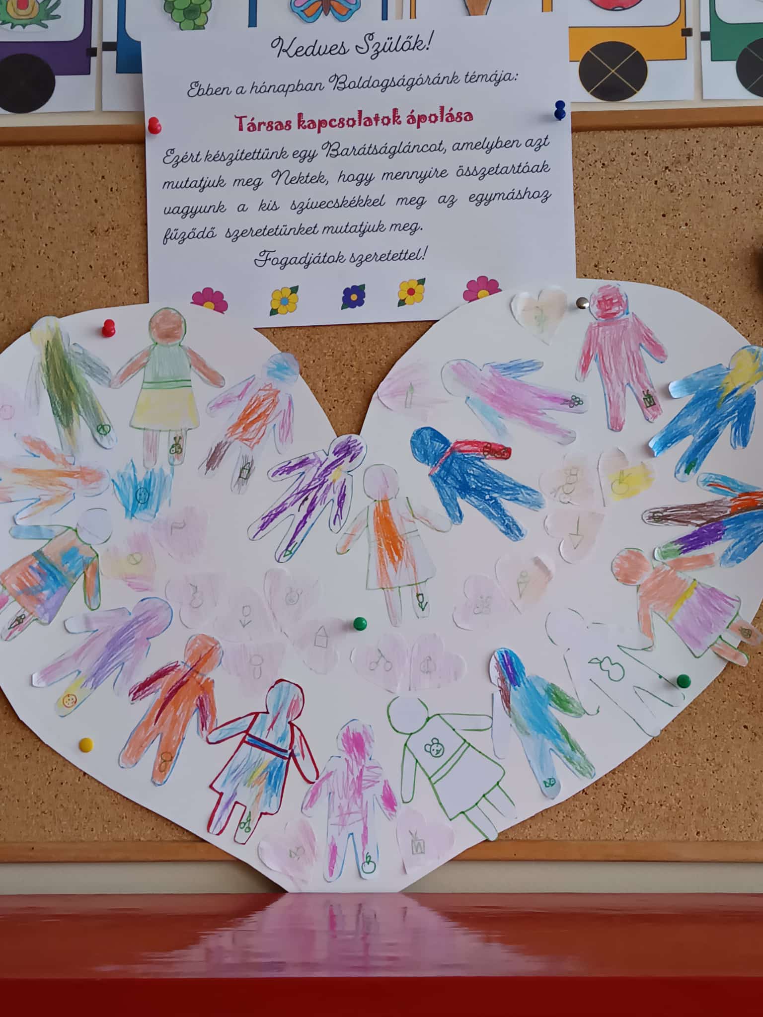 A gyerekek örömmel üdvözölték Boldog Dórát, mint egy barátot. Igy mikor megkérdezte tőlük, hogy „Kis barátom, hogy vagy?” örömmel válaszoltak és egymástól is megkérdezték. Majd a Totyog a liba relaxációs játékkal folytattuk és elénekeltük a Száz liba egy sorba dalt is. Aztán táncoltunk „Ha boldog vagy című énekre, ahol kiteljesedhettünk. Majd a barátságról beszélgettünk. Először is mindenki elmondhatja, hogy ki a barátja. Majd miért szeretünk együtt lenni? Mit csinálhatunk együtt? Miért fontos a barátság? Mihez hasonlíthatjuk? Majd miután mindezeket megbeszéltük, tanultunk meg aranyos ujj mondókát a barátságról. Aztán egy nagyon kedves mesét kaptunk Boldog Dórától: Visszajött a répa, amelyben megtapasztalhattuk, hogy miért is jó, hogy vannak barátaink. Sokat beszélgettünk róla. Végül kiszíneztük a barátság jelét és készítettünk egy barátságláncot a faliújságra a szülőknek. Mindezek közben a barátságról hallgattunk egy dalt és végül mindenki jelezhette, hogy érezte magát a foglalkozáson smilyval.