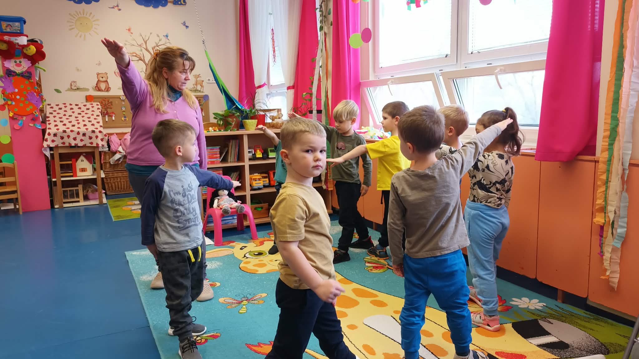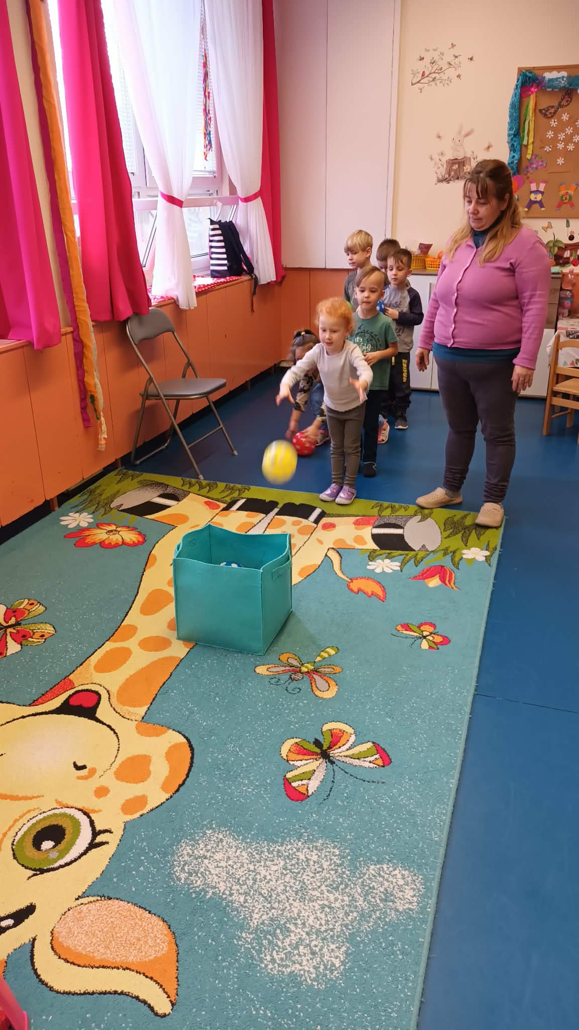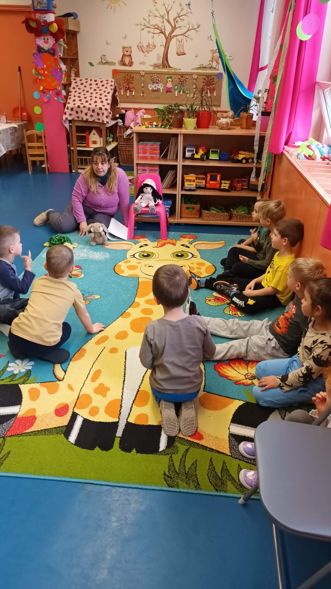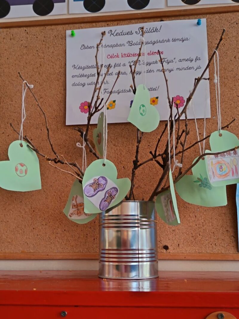 Relaxációs gyakorlatunk az „Összehangoló” volt jól ismert mondókára meneteltünk. Majd célba dobtunk és megbeszéltük a képek segítségével, hogy milyen céljaink lehetnének, amit elérhetnénk. Megbeszéltük, hogy sosem szabad feladni semmit sem. Majd „ A nyúl és a teknős” című mesét meséltem el plüssök segítségével. Amelynek megbeszéltük a tanulságát: A lassú és kitartó munka elnyeri jutalmát! Játszottunk „ Hideg-meleg” játékot ahol a teknős plüsst rejtettük el. Ez nagyon tetszett a gyerekeknek. Kiszíneztük a Célok elérése és kitűzése jelet. Majd közben hallgattuk „ Van nekem egy álmom” dalt. Készítettünk a szülőknek „Vágyak fáját”, ahol mindenki választott egy képet amit elszeretett volna érni és azt kiszínezte, ezeket pedig felakasztottuk egy ágra és kitettük az öltözőbe. A végén pedig egy közös öleléssel körbe vettük Boldog Dórát.