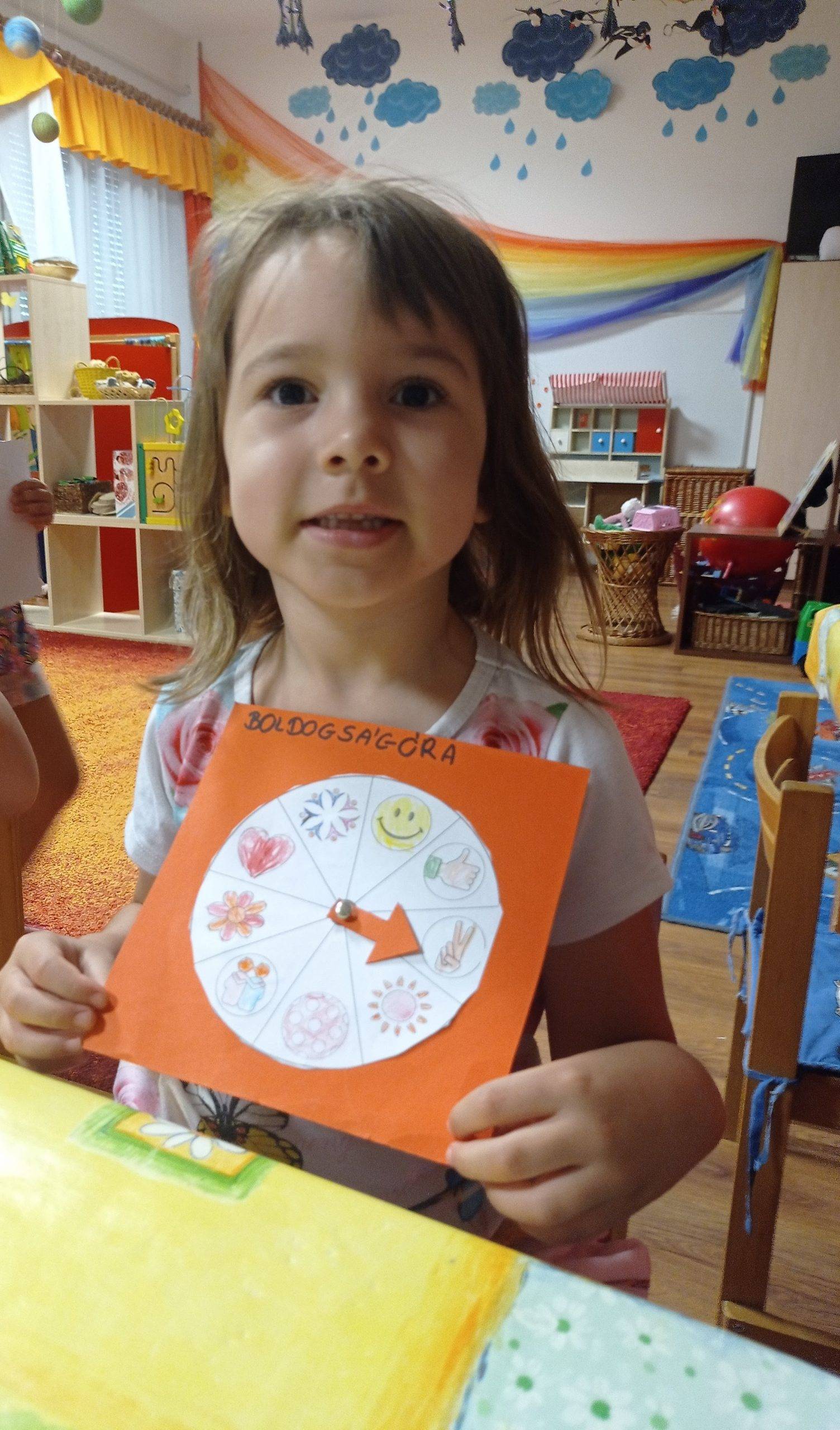 Ezután elmeséltem a Boldog erdő-Kerek erdő mesét, a gyerekek nagyon figyeltek mese közben, ismerős szavakat hallottak. A mese végén felidézték, melyek azok a témák, amelyeket a mesében is hallottak és amikről a Boldogságórákon is beszélgettünk. Felidézték az emlékeket, élményeket. Ezután elővettem a „Boldogságóránkat”, mindenki elmondta, hogy melyik a kedvenc Boldogságóra témája, majd mondott hozzá egy kedves élményt is. Megtanultak egymásra figyelni, csendben hallgatták egymás mondani valóját. Ezután Bagdi Bella-tól hallgattuk, énekeltük, a kedvenc zenéjüket, amely közben táncoltak vagy saját Boldogságórát készítettek.