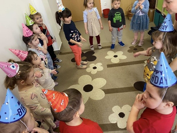 A nevelési év elején a gyermekek még csak ismerkedtek az óvodai élettel, az új környezettel, a társakkal és az óvónénikkel. A csoport létszáma 30 fő így az új helyzet nagyfokú alkalmazkodást igényelt a gyermekektől. A beszoktatás időszaka során különösen fontos volt, hogy biztonságos, szeretetteljes légkört alakítsunk ki számukra, amelyben megélhetik az elfogadást, a figyelmet és az érzelmi támogatást. A boldogságórák ebben is sokat segítettek. A kicsik nyitottan és érdeklődve fordultak a foglalkozások felé. A bábok világa különösen nagy hatással volt rájuk, segítségükkel könnyebben felkeltettük a figyelmüket, és biztonságos csatornát teremtettünk az érzelmek feldolgozásához. A bábozás mindig örömet és élményt nyújtott számukra, erősítette bennük a fantáziát és az empátiát. A mesék közös meghallgatása után játékos, beszélgető kör kialakításával dolgoztuk fel az irodalmi élményt. A gyermekek, életkoruknak megfelelően, egyre bátrabban osztották meg saját tapasztalataikat, érzéseiket. A foglalkozások során gyakran megjelent a hála, a szeretet, a gondoskodás és a pozitív gondolkodás témaköre, amelyeket a mindennapi helyzetekhez kapcsolva is megerősítettünk. A tartalmi elemeket projektjeinkbe tudatosan terveztük be és valósítottunk meg. Ilyenek voltak: Fújj-fújj, Domborítok, mint a cica, Totyog a liba, Medve vagyok cammogok. Megtanultuk a boldogságmondókát, melyet az év végére ügyesen mondogattak a gyermekek. A hála, a társas kapcsolatok, a jó cselekedetek, az apró örömök, a testmozgás témaköreit életkornak megfelelően feldolgoztuk, az aktualitásainkhoz illesztettük. Boldog vagyok dalt többször meghallgattuk és a gyermekek az év végéhez közeledve önmaguk is kérték azt. Egyszerű példákon keresztül beszélgettünk arról, miért lehetünk hálásak – akár egy mosolyért, egy ölelésért vagy a közösen eltöltött időért. A gyermekekben kialakult az egymásra figyelés képessége, segítségre szoruló társaikra figyeltek, segítettek nekik, vagy segítséget kértek a felnőttektől. Ha valamelyik kisgyermek, aki bátorításra, vigasztalásra szorult támogatták társai. A foglakozások témáit a mindennapok során is alkalmaztuk és az aktuális állapotnak megfelelően egy pozitív jó cselekedetet kiemeltünk ezzel is erősítettük a gyermekek önbizalmát, és a példaértékű, helyes viselkedést ösztönöztük. Közös élményekkel az összetartozást a társas kapcsolatokat erősítettük, mélyítettük. A szülői felajánlással fát ültettünk közösen ezzel is a környezetünket szépítettük. A közösen megélt pillanataink a közösséget erősítették, ilyenek voltak a születés-, és névnapok, Karácsony, Farsang, Húsvét, Anyáknapja, Évzáró. A változatos, játékos tevékenységek segítségével a gyermekek tapasztalatai folyamatosan bővültek, új szavakkal és fogalmakkal ismerkedhettek meg, szókincsük szépen fejlődött. A nevelési év során kiemelt figyelmet fordítottunk arra, hogy már a legkisebb örömöket is észrevegyék a mindennapokban, és megtanuljanak örülni ezeknek. Segítettünk nekik abban is, hogy a koruknak megfelelő módon, fokozatosan elkezdjenek megküzdeni az őket érő kisebb nehézségekkel, legyen szó egy várakozási helyzetről vagy egy kis vita rendezéséről. A Boldogságóra foglalkozásokat a következő nevelési évben is folytatni fogjuk.