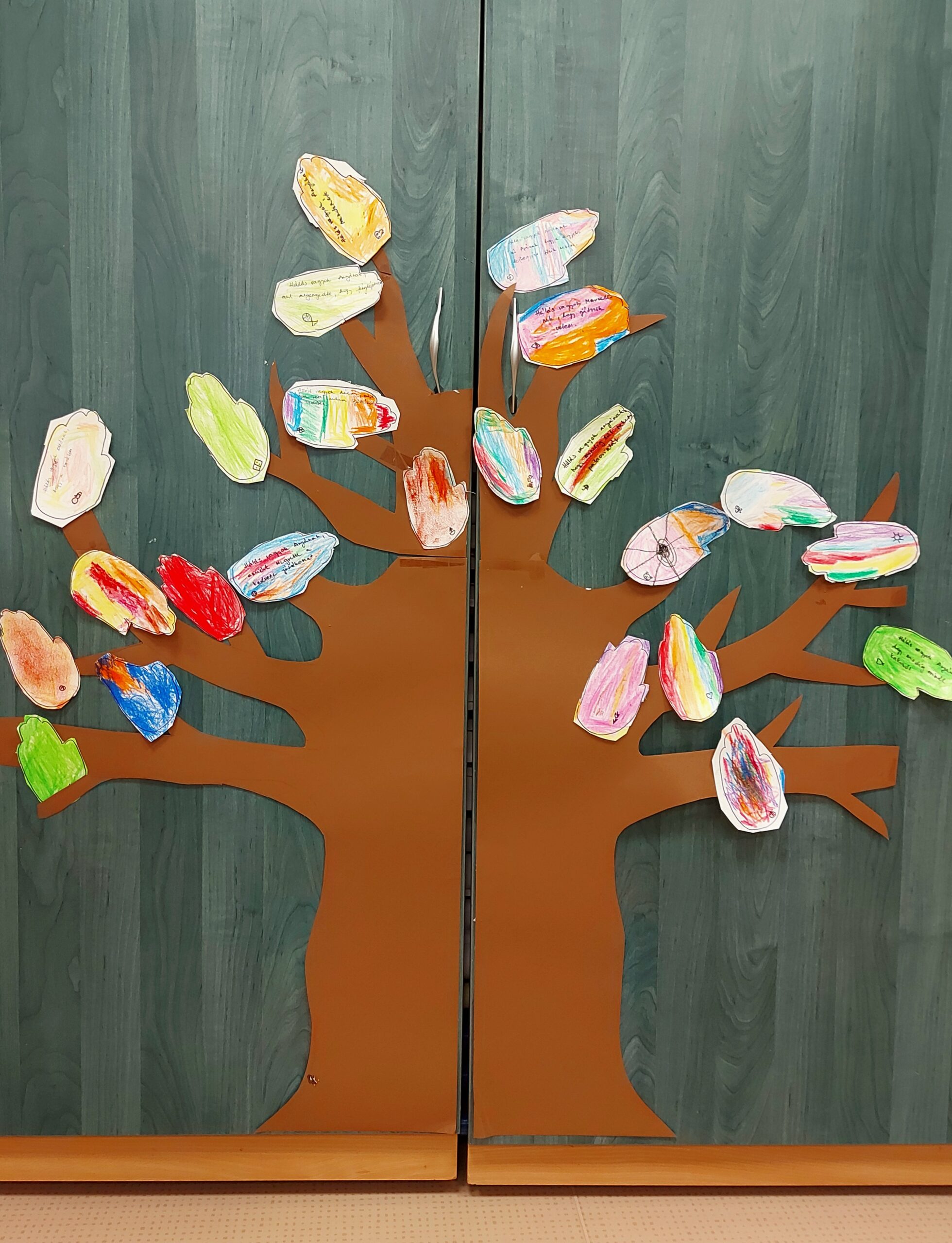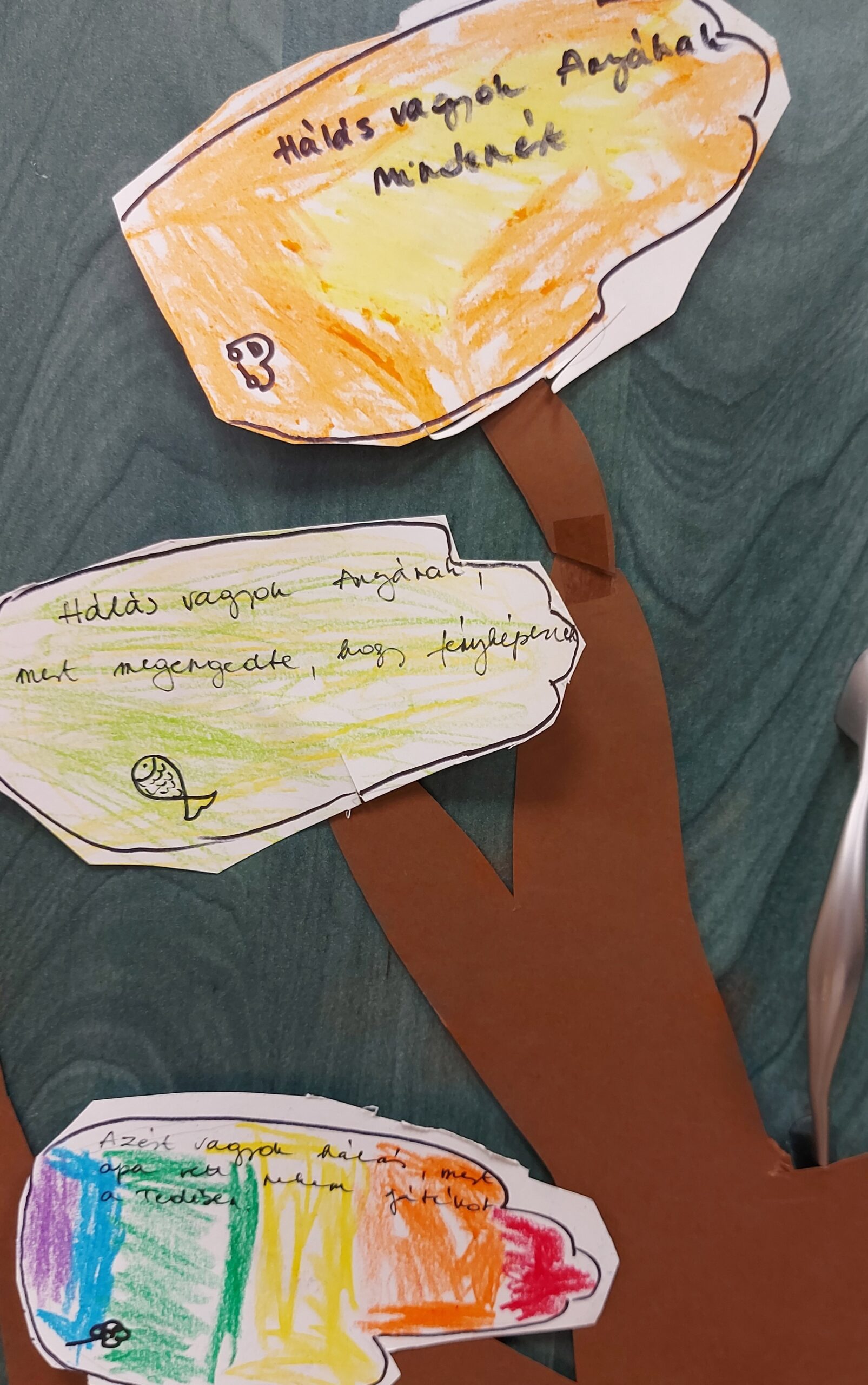 A hála témájának feldolgozását relaxációs gyakorlattal kezdtük, ami megalapozta a foglalkozás hangulatát. A Hálafa történetének elolvasása és feldolgozása segítette a fogalom megértését. Voltak, akik tárgyakért voltak hálásak, sokan a szüleiknek/szüleik gondoskodásáért, az esti mesékért, és olyan is volt, aki a kistestvéréért. Közösen elkészítettük a csoportunk „hálafáját”, a gyerekek őszi faleveleket készítettek rá, melyekre felírtam, hogy ki-miért hálás.