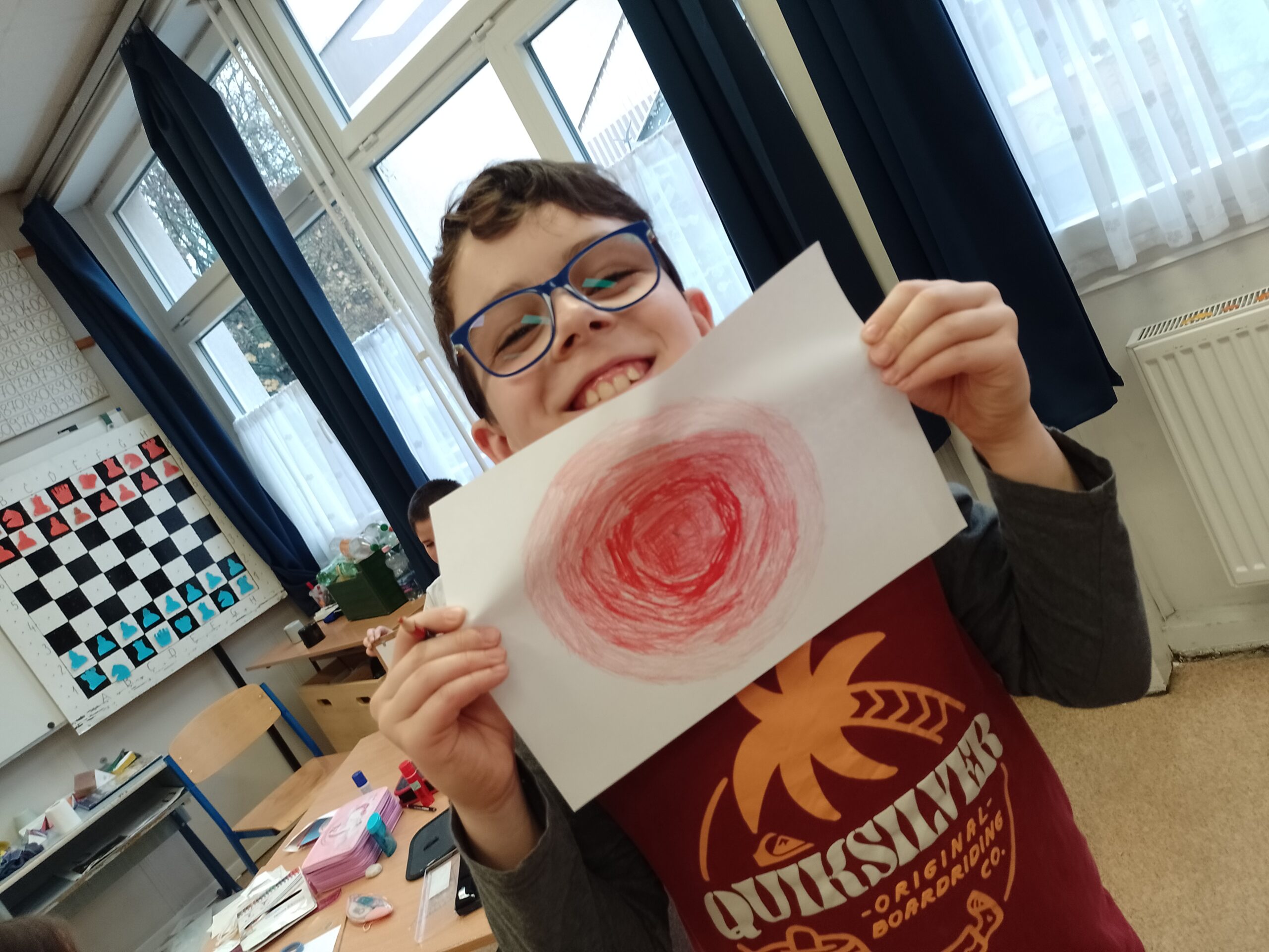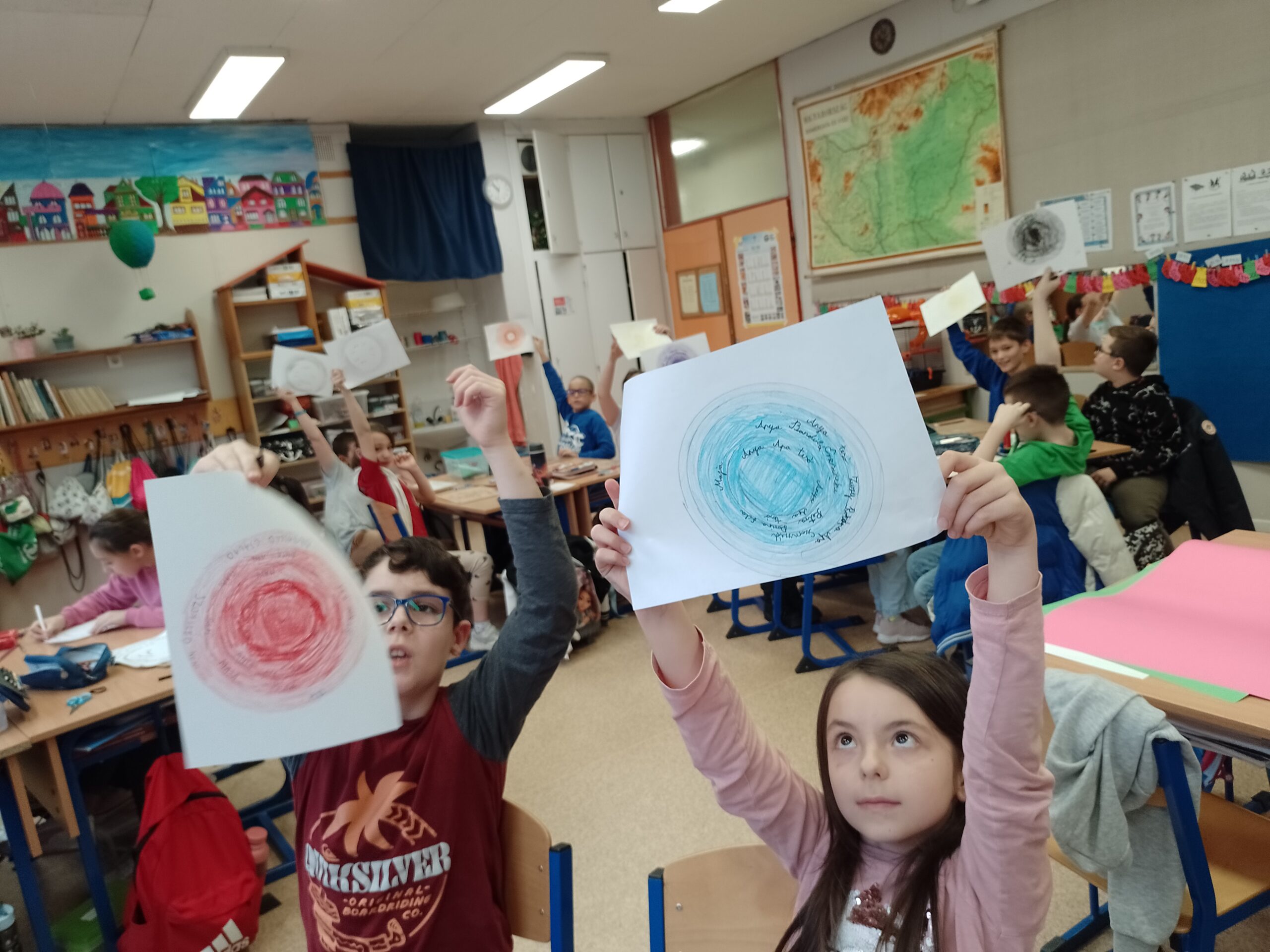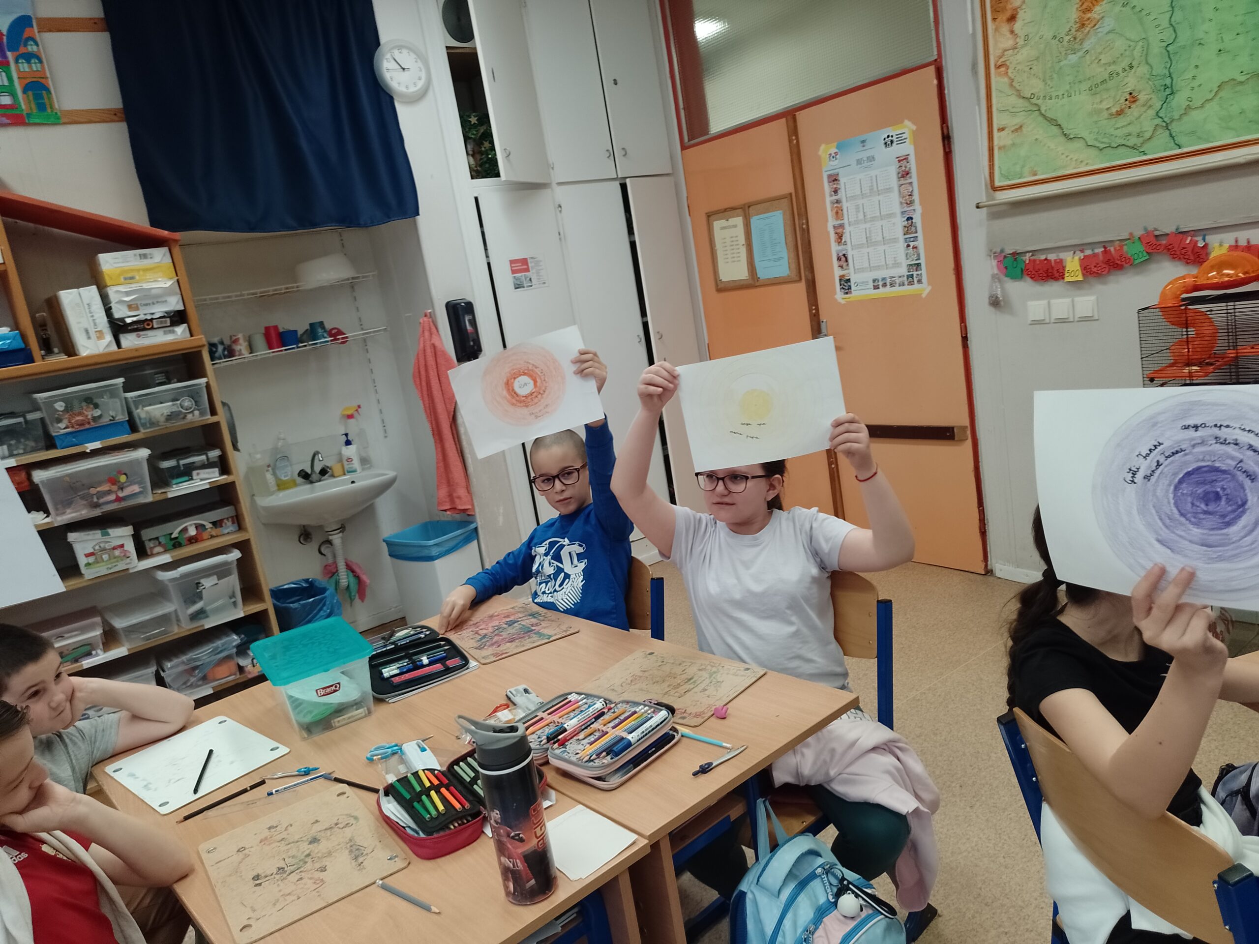 – A kapcsolatokat válogattuk, mérlegeltük és írtuk be a színes körbe, hogy ki áll közelebb és ki távolabb hozzánk. A kört nem a munkafüzetből vettem végül, hanem maguk készítették körzővel és színezték ki. Ez nehezebben ment, leginkább mindenki a közelebbi vagy a távolabbi körben volt, a középmezőnyt nem érzékelik még. A kapcsolatok ápolása, hogy nekik is tenni kell, ez a nézőpont láthatóan új volt számukra, ezt meg is fogalmazták.