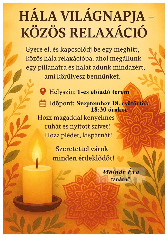 • Szeptember 18-án szintén egy közös kollégiumi programot szerveztem a hála világnapja alkalmából. Bagdy Bella rövid hála előadásának meghallgatása után közös hála relaxációt tartottam, amire több csoportból is érkeztek tanulók. Ehhez a programhoz felhívó plakátot készítettem.