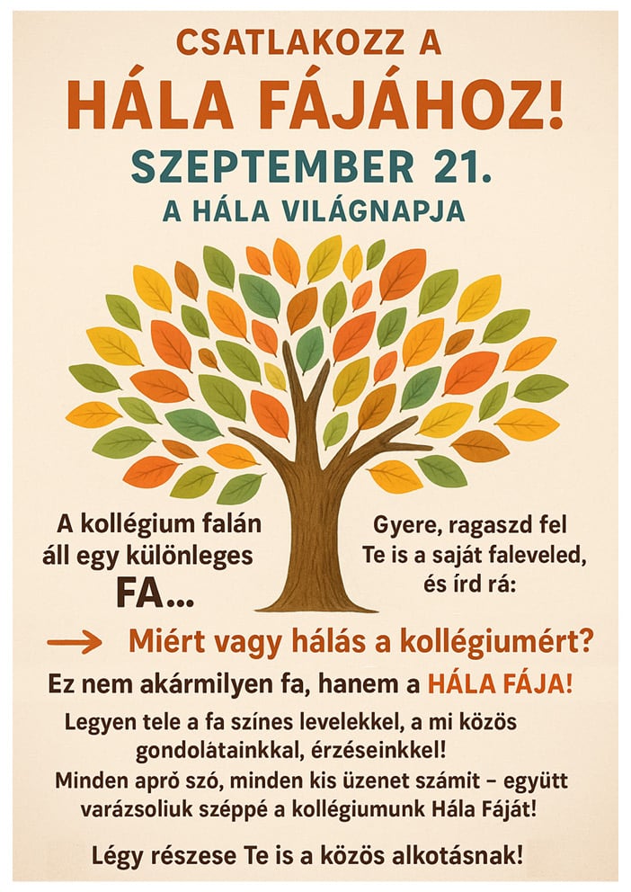 • Szeptember 28-ra elkészült Kollégiumunk közös Hála Fája. Színes leveleken osztották meg diákjaink, hogy miért hálásak a kollégiumért. Így született meg ez a vidám, élettel teli fa. Büszkeséggel tölt el minket, hogy Boldog Kollégium vagyunk!