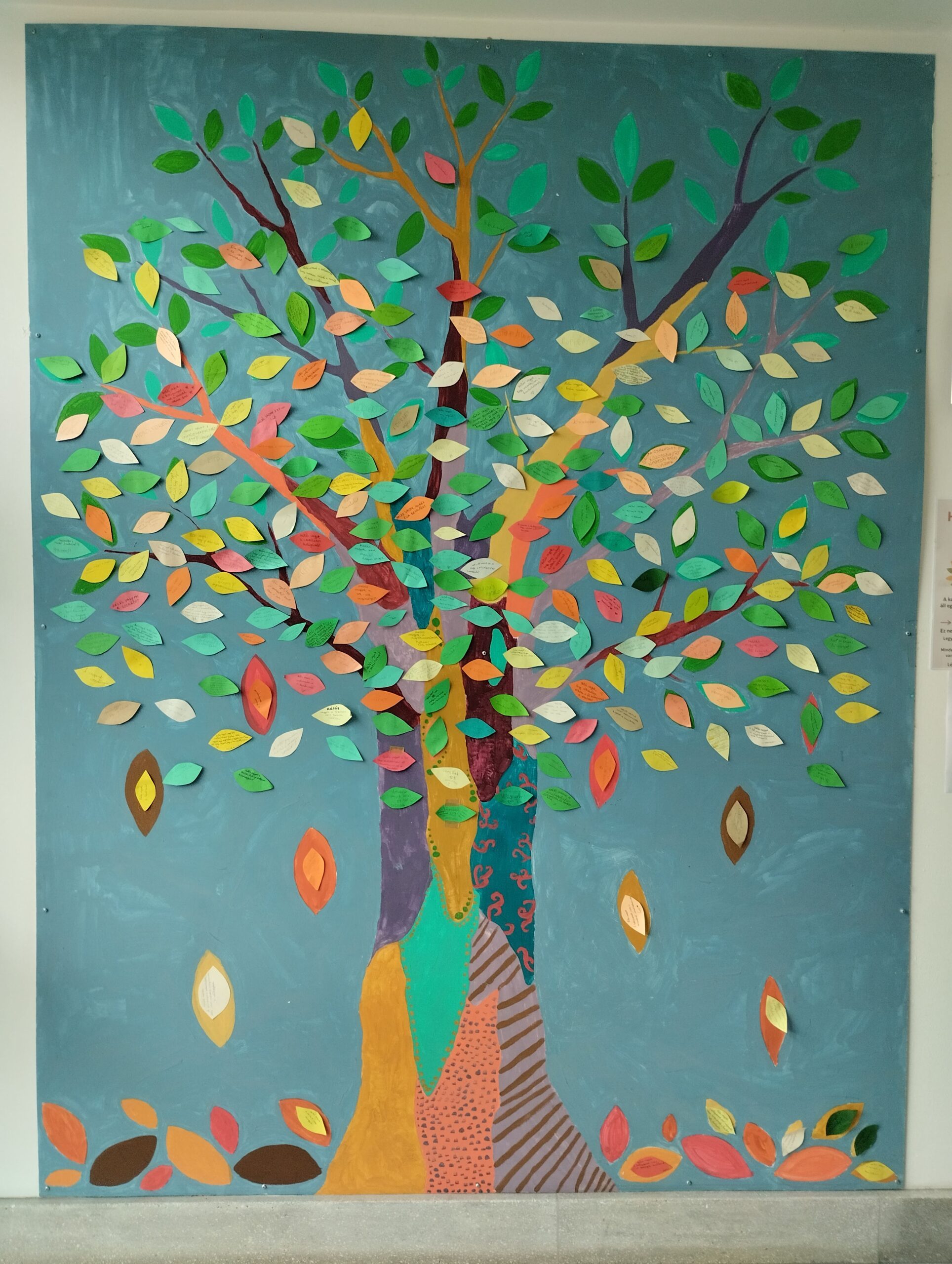 • Szeptember 16. Szerettem volna, hogy nem csak az én csoportom részesül a kollégiumban a hála témájában, ezért azt a kezdeményezést tettem, hogy a kollégium épületében lévő nagy fa festményre hálaleveleket ragaszthat mindenki, hogy miért hálás a kollégiumért. Ehhez felhívó plakátot készítettem, színes leveleket, tollakat, ragasztót tettem a fa közelébe, hogy aki arra jár, megírhassa és felragaszthassa a saját hálalevelét. Csodálatos közös hálafa készült.