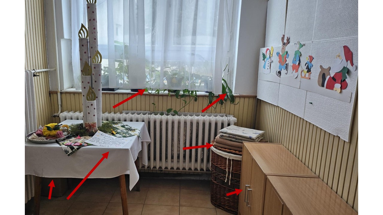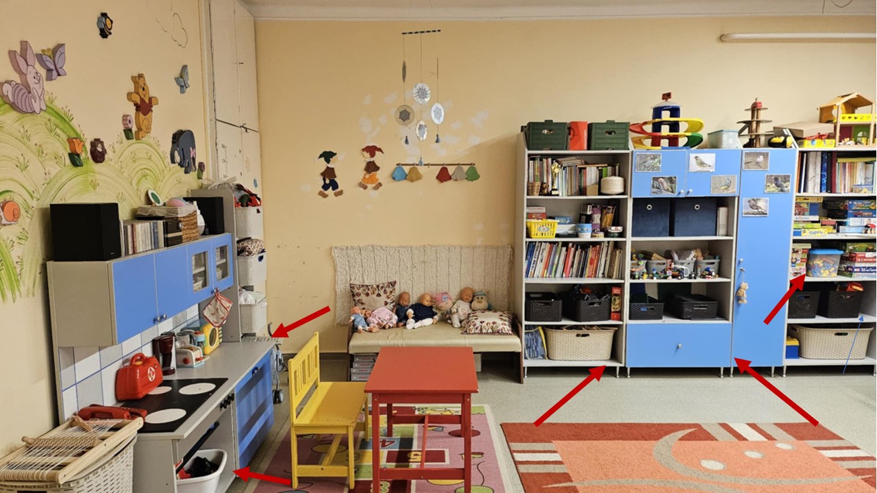A nyilak jelölték az utat, és a csillagok a helyet, ahol a puzzle darabjait rejtettük el, illetve a Dajka néni volt segítségünkre, aki még a gyerekek a reggeli után a mosdóban, majd a meseközben az öltözőben voltak, a megfelelő tárgyak alá helyezte a képdarabokat.