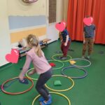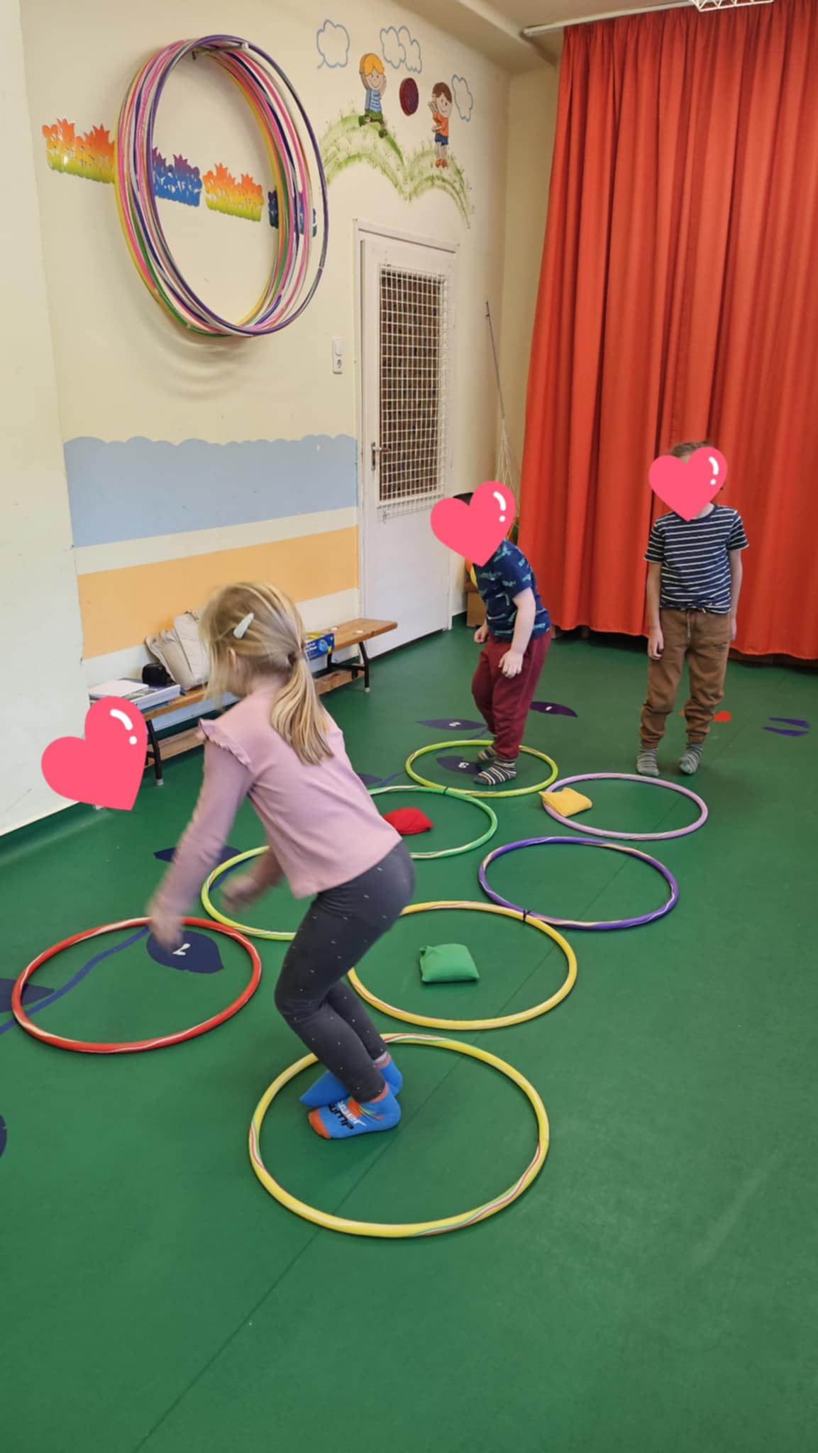 Amikor a mese végére értünk, a célt azzal mutattuk be, hogy a kihelyezett karikákba dobják a babzsákot, az legyen a céljuk, hogy beletaláljanak. Akinek nem sikerült, megvártuk még addig dob, amíg találata lesz. Ezzel szemléltettük, hogy vannak nehézségek, akadályok, mint a mesében, de mindig próbálkozni kell, gyakorolni, és elérik a céljukat. Mindenkinek sikerélménye volt a dobásban, így elégedetten ültek vissza a szőnyegre, várva a következő feladatot.