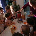 A hét végére még készítettünk egy igazi varázsitalt is…igaziból beletettünk: zöld kiviből bátorságot, narancsszínű narancsból kitartást, sárga banánból türelmet, lila szilvából furfangosságot, piros gyümölcsökből szeretetet. Együtt mostuk, hámoztuk, vagdostuk és turmixoltuk……fantasztikusan finom lett.