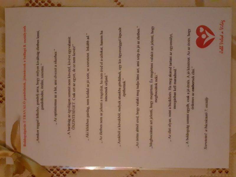 Ballagtató hetedikesekként testhezálló feladatot választottunk: a ballagó 8.osztály tarisznyájába Útravaló Boldogságórás gondolatokat, jótanácsokat tartalmazó emléklapot készítettünk. Emellett ünnepi díszbe is öltöztettük az osztálytermüket, az iskolát, és az udvart.