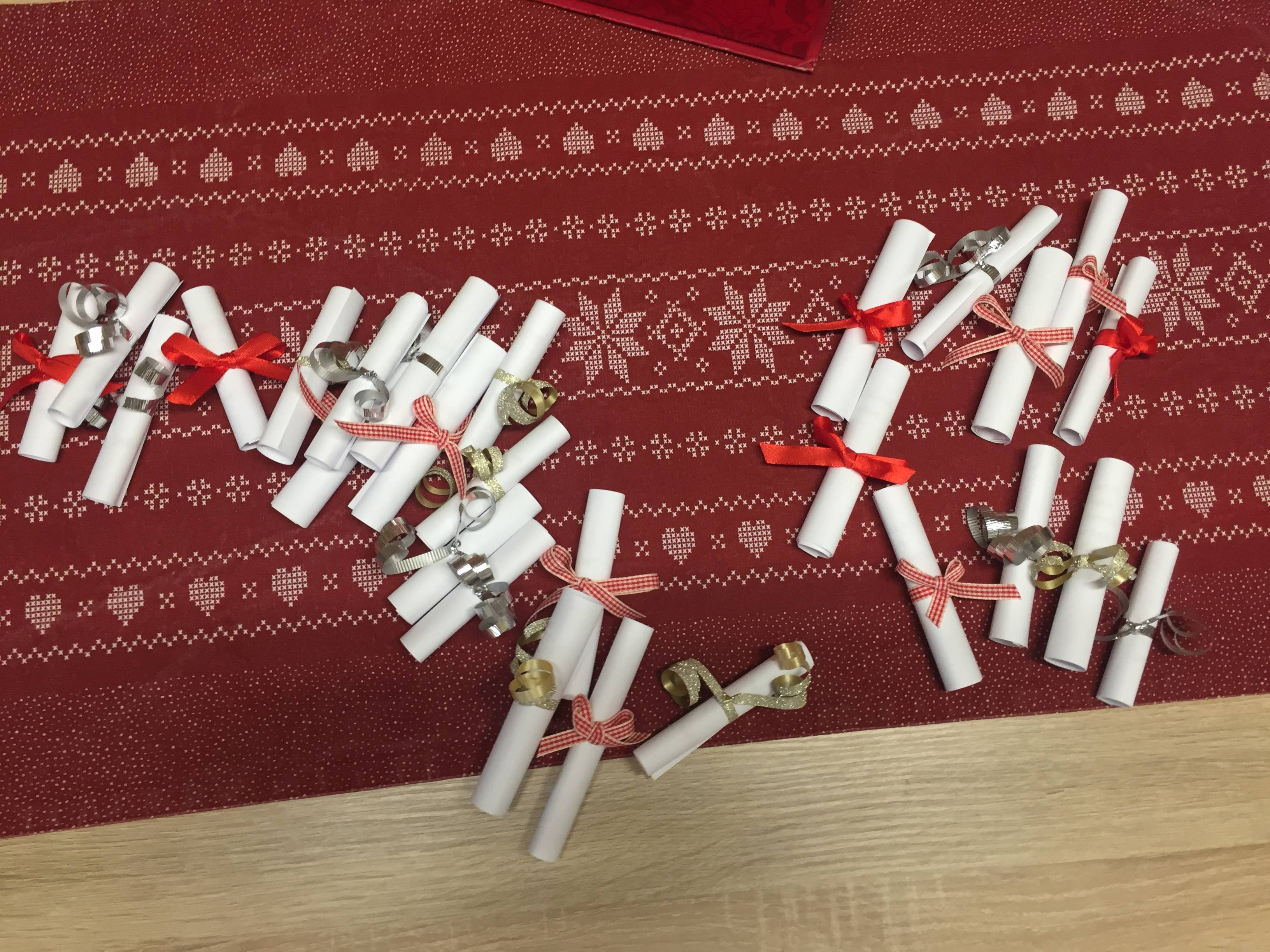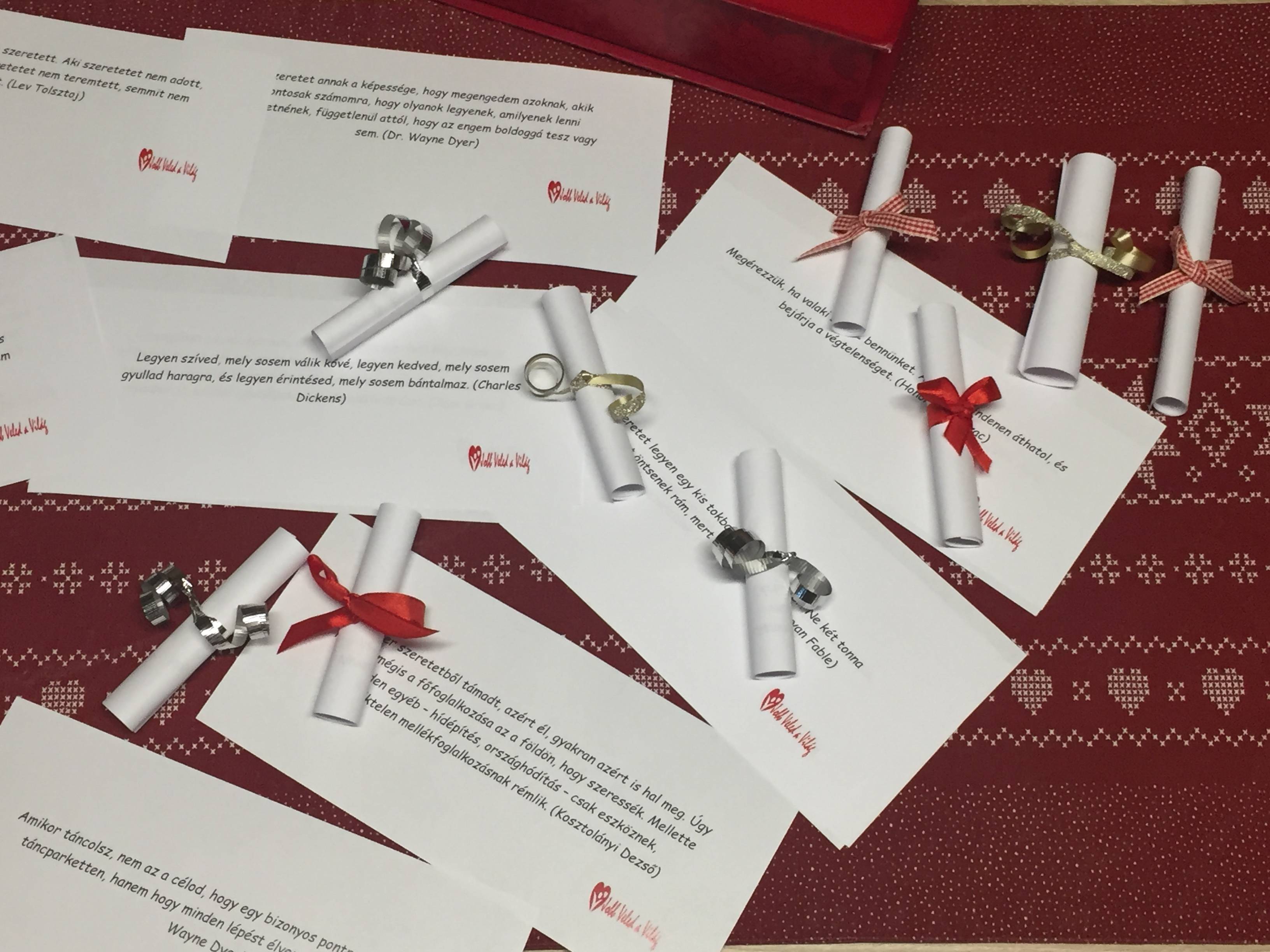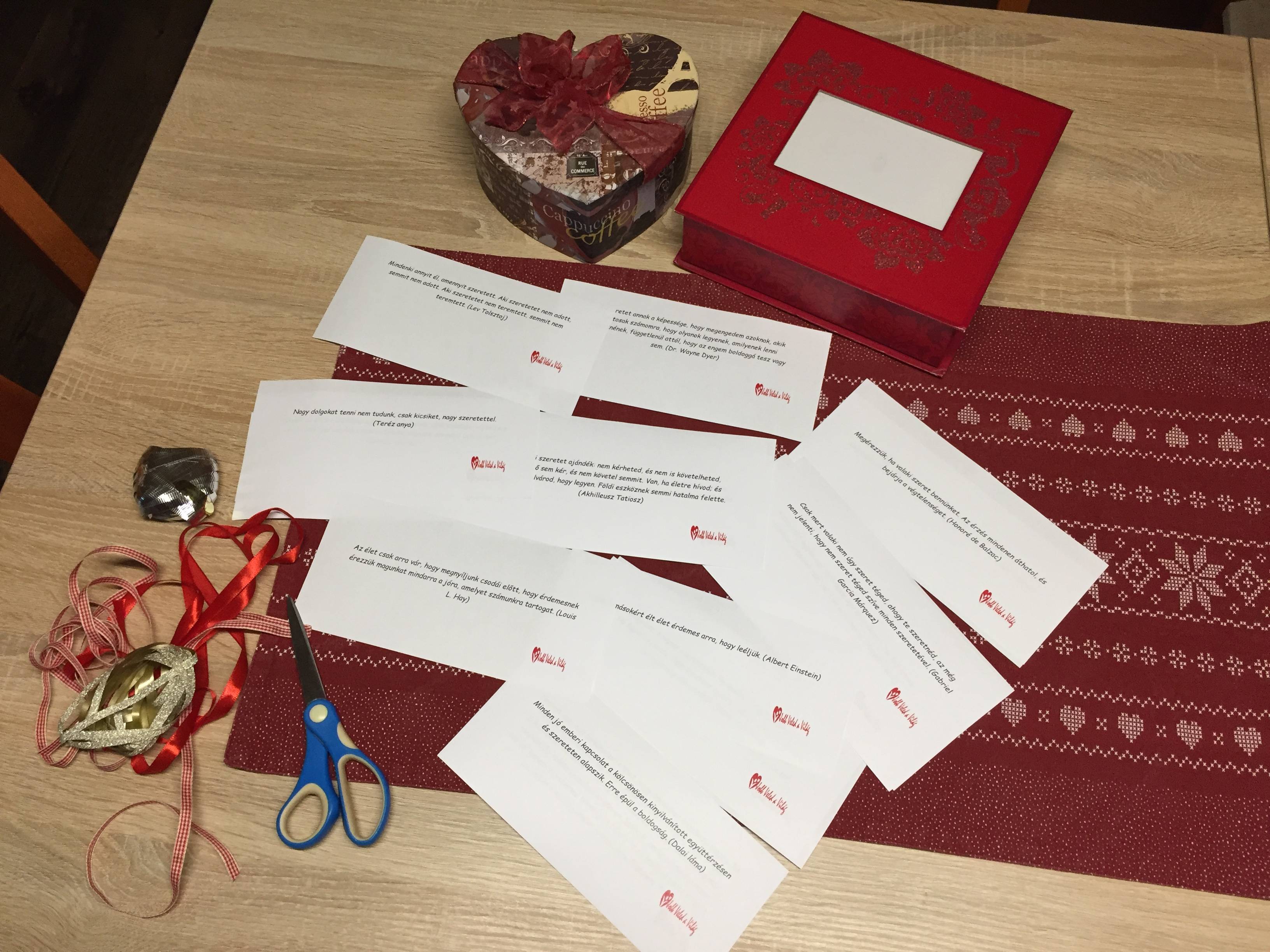Ballagóink számára sok-sok szeretettel, boldogsággal kapcsolatos idézetet nyomtattunk ki. Ezeket feltekertük, díszes szalaggal átkötöttük, majd egy szép dobozba tettük. A ballagás után végzős diákjaink valamennyien húztak egyet a sok közül. Így mindenkihez pont az az üzenet került, ami ott és akkor neki szólt. Örültek a kedves ajándéknak, mosolyt csalt az arcukra.