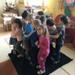 A nyuszi csoport komoly feladat elé nézett. Cápatámadást kellett kivédeniük a gyermekeknek. A szőnyeg jelentette a tengert, a fekete anyag pedig a hajójukat. Zenére mindenkinek el kellett helyezkedni a szőnyegen. Amikor elhallgatott a zene egyet hajtottunk a fekete anyagon és így kellett tovább utazni a tengeren.
