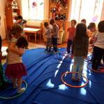 A földre terítettünk a gyerekekkel közösen egy nagy kék lepedőt, amely szimbolikusan a vizet jelentette nekik. A lerakott karikák voltak a hajók, egy hajóba több kisgyermek is belefért. Cápatámadás idején új hajót kerestek maguknak. Nagyon élvezték az új játékot.