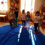 A földre terítettünk a gyerekekkel közösen egy nagy kék lepedőt, amely szimbolikusan a vizet jelentette nekik. A lerakott karikák voltak a hajók, egy hajóba több kisgyermek is belefért. Cápatámadás idején új hajót kerestek maguknak. Nagyon élvezték az új játékot.
