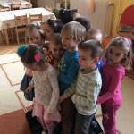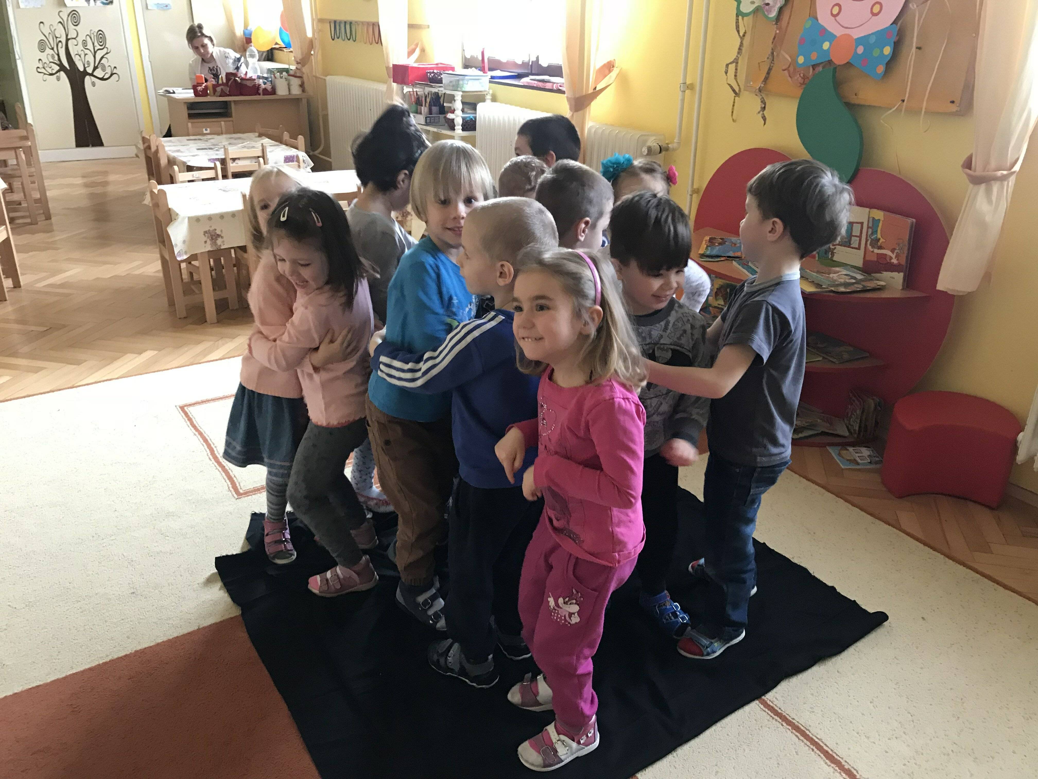 A nyuszi csoport komoly feladat elé nézett. Cápatámadást kellett kivédeniük a gyermekeknek. A szőnyeg jelentette a tengert, a fekete anyag pedig a hajójukat. Zenére mindenkinek el kellett helyezkedni a szőnyegen. Amikor elhallgatott a zene egyet hajtottunk a fekete anyagon és így kellett tovább utazni a tengeren.