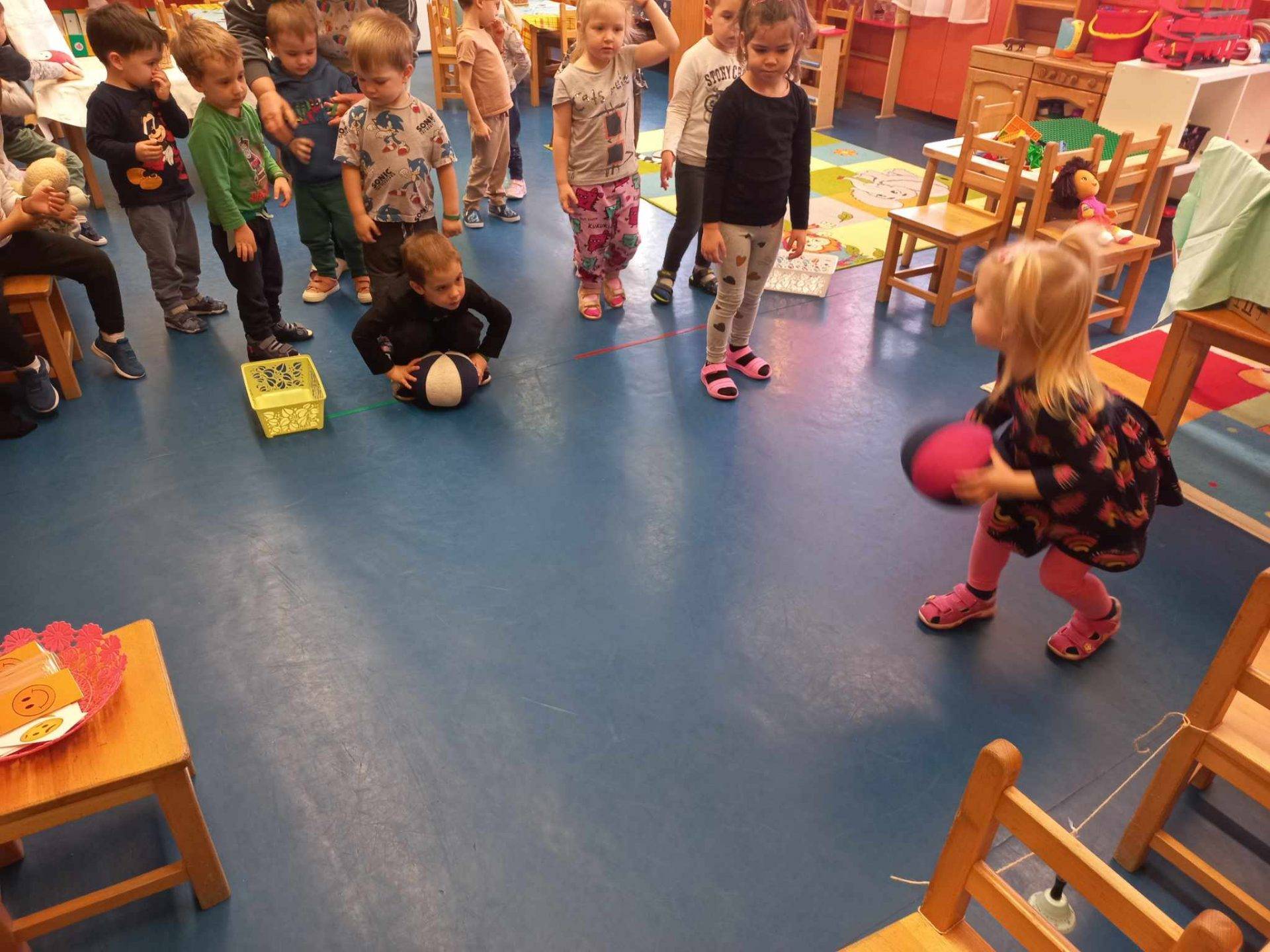 A kisnyúl a csengőjét szerette volna visszakapni, ehhez kapcsolódóan egy célba gurítós játékot terveztem, hogy melyik csapat tudja többször is megszólaltatni a labda gurításával a két szék közé kifeszített csengőt.