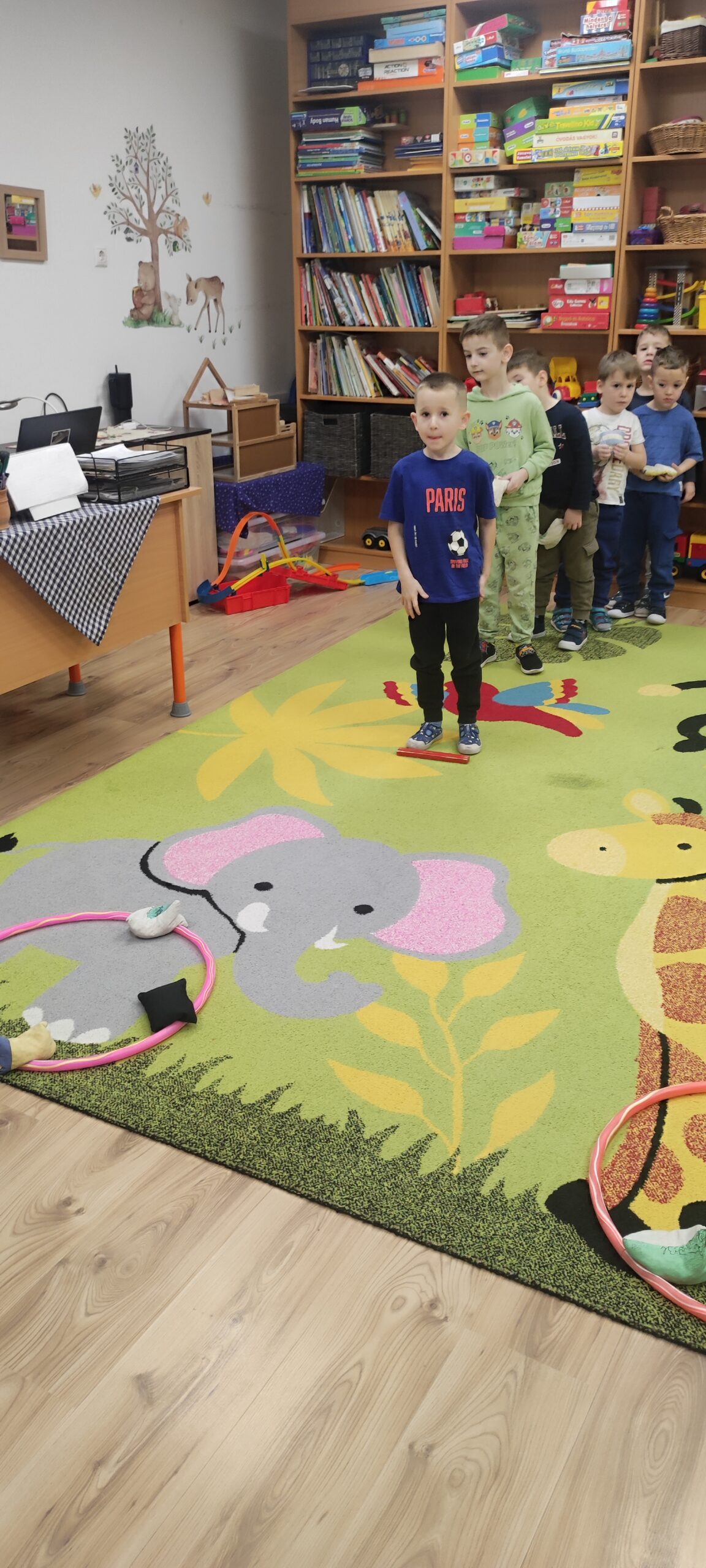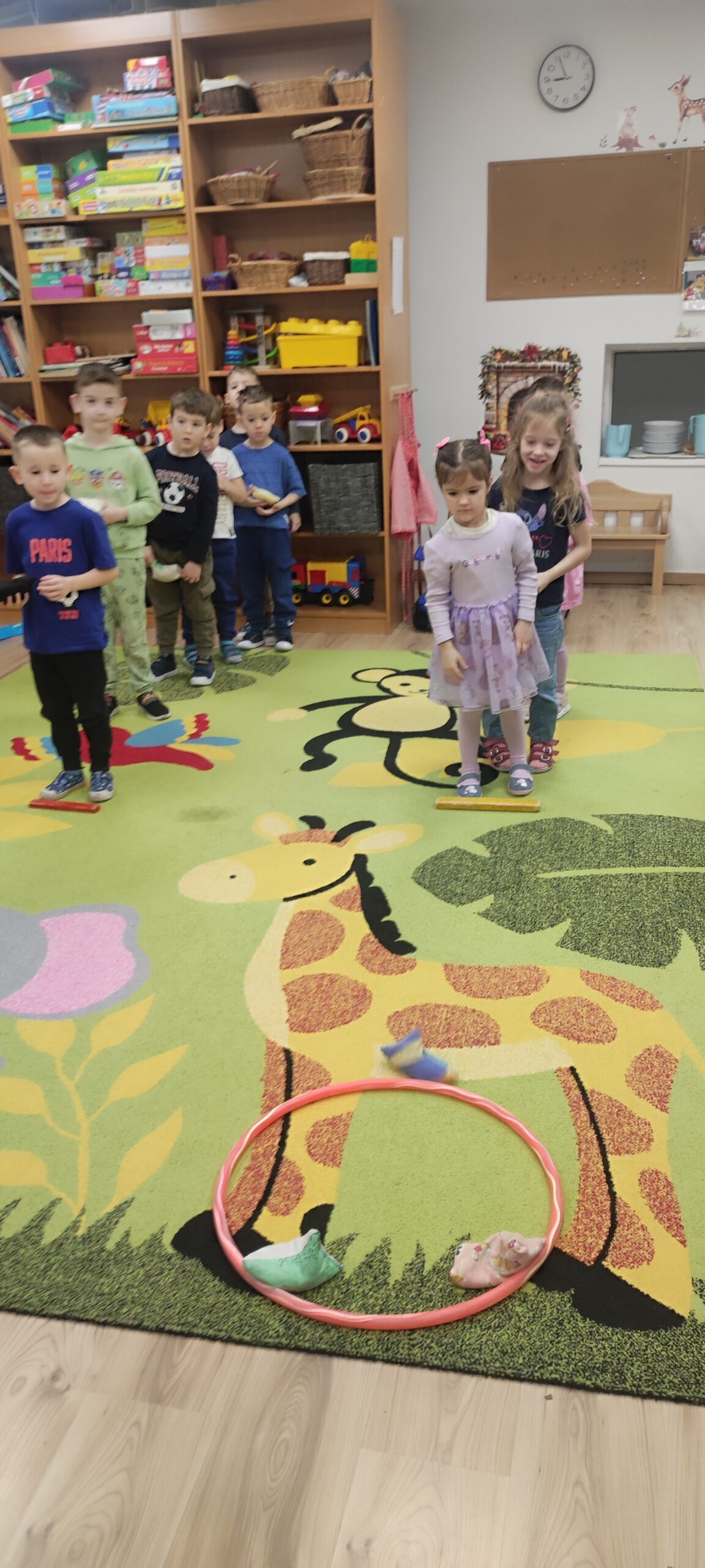 Két csapatot alkottunk,közösen kijelöltünk egy könnyen elérhető célt(karika),babzsákokkal célba dobtak.Átélhették mikor sikerül eltalálni a célt,és megtapasztalták hogy nem mindig sikerül elsőre.