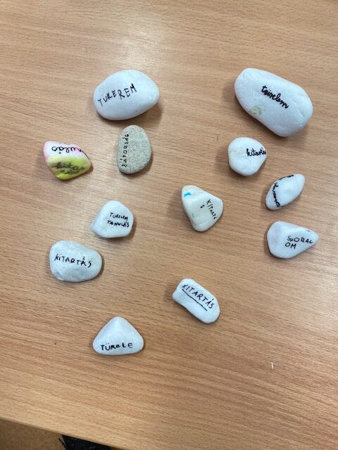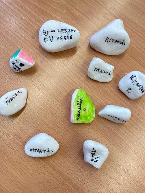 A gyerekek visszatekintettek az elmúlt időszakra. Az óra elején rövid relaxáció segítette a ráhangolódást és az önmagukra való figyelést. Beszélgetőkörben megoszthatták sikereiket, nehézségeiket, és azt, miben fejlődtek a félév során. Ezt követően a tanulók egyéni kézműves tevékenység során célkavicsot készítettek, amelyre egy olyan segítő szót írtak, amely emlékezteti őket a céljuk eléréséhez szükséges erőfeszítésre. A kavics elkészítése után minden tanuló borítékot kapott, amelybe egy lapon leírta saját, reálisan megfogalmazott célját és az ahhoz vezető lépéseket. A borítékokat lezárták, és megbeszéltük, hogy később, a félév végén újra elővesszük őket. A tevékenységek során hangsúlyt kapott a felelősségvállalás és a kitartás fontossága.
