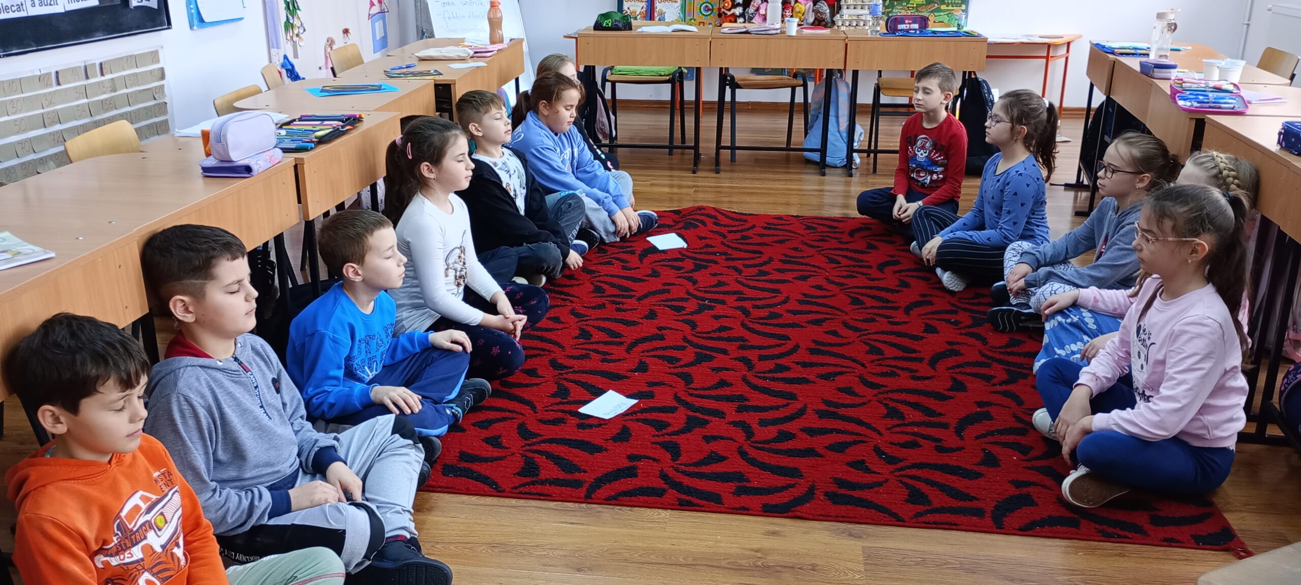 Az otthon befejezett célokat óra elején felolvasták, és megbeszéltük, hogy esetleg tudnak-e egymásnak segíteni egy-egy cél elérésében. Volt ajánlat segítségre, ami nagyon jó hatású volt. A mese meghallgatáása és megbeszélése után próbáltunk egy közös célt is kitalálni az osztálynak, azt pedig lebontani részcélokra csapatokban, de még dolgoznunk kell rajta. A meditáció mostanra egész jól működik, nagyon szereti mindenki. Erről teszek most be fotót.