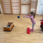 távolabbi célokat. A feladat zsámolyba dobás volt babzsákkal. Nagyon ügyesen próbálkoztak többször is egymás után a feladattal. Kedvesen megtapsolták egymást amikor célbataláltak.