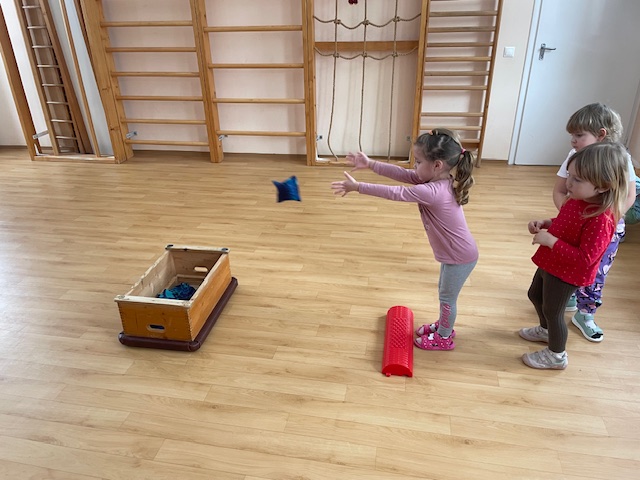 távolabbi célokat. A feladat zsámolyba dobás volt babzsákkal. Nagyon ügyesen próbálkoztak többször is egymás után a feladattal. Kedvesen megtapsolták egymást amikor célbataláltak.