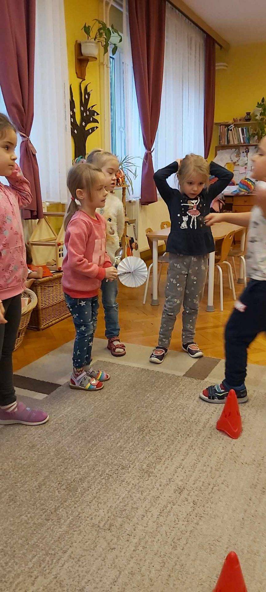 A boldogság óra havi feladatait mozgásos játékkal zártuk. Bólyákat helyeztem ki és az volt a cél, hogy a ping-pong labdákat kanállal a kézben egyensúlyozva végig vigyék a túloldalon álló társuknak. Jó kis izgalmas hangulat kerekedett, nem győztek drukkolni egymásnak. Megbeszéltük, hogy ezek a kis célok fognak bennünket a nagy céljaink elérésében is segíteni. Megdícsértem őket az aktív munkájukért és az egymásra oda figyelés miatt is.