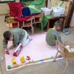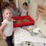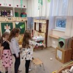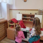 A foglalkozást a Van nekem egy álmom című Bagdi Bella zenével kezdtem. A gyerekek odajöttek a szőnyegre, aztán beszélgettünk, hogy kinem milyen álma, célja vannak. Sokfélét mondtak a gyerekek. Mivel Dínós projektben vagyunk, így ezzel kapcsolatban is mondtak ötleteket, célokat. Például legyen az a célunk, hogy építünk egy időgépet. Relaxációs gyakorlat következett (Lemegy a nap, lankad a kar…). Megépítettünk ezután egy kutatóállomást, időgépet, amivel visszautazhatunk a múltba, a dínók világába. Sokféle ötlet érkezett a gyerekektől, mit hová építsünk, és mivel készíthetjünk el, hogyan nézzen ki. Néhány lánynak az az ötlete támadt, hogy a babakonyhában egy dínókiállítást szerveznek. Mondták is, „az a cél, hogy sok dínót megismerjünk”. Az időgéppel elutaztunk a dínók világába. Meghallgattuk a „Repülj velem…” című Bagdi Bella zenét közben. Elvittük Boldog Dórát is magunkkal. Ahogy megérkeztünk képeket, könyveket nézegettünk, beszélgettünk, hogyan éltek, mit csináltak a dínók. Amikor visszérkeztünk az óvodába, megtekintettük a kiállítást. Ezután ásatást végeztünk, cél volt, hogy a dínónak a csontjait kiássák, és a helyére tegyék a táblán. Egy másik játékot is játszhattak a gyerekek (dínóetetés), ami a célbadobás volt. Majd a szőnyegre ültünk, és Boldog Dórával beszélgettünk az élményekről, illetve további célokat tűztünk ki magunk elé. Például: „mindig betartjuk a szabályokat az óvodában”, „az a célom, hogy megtanuljak cipőt kötni”…. Majd az 5. lépcsőfokra felragasztották a hónap jelét a gyerekek. Zárásként pedig lerajzolhatták az élményeiket.