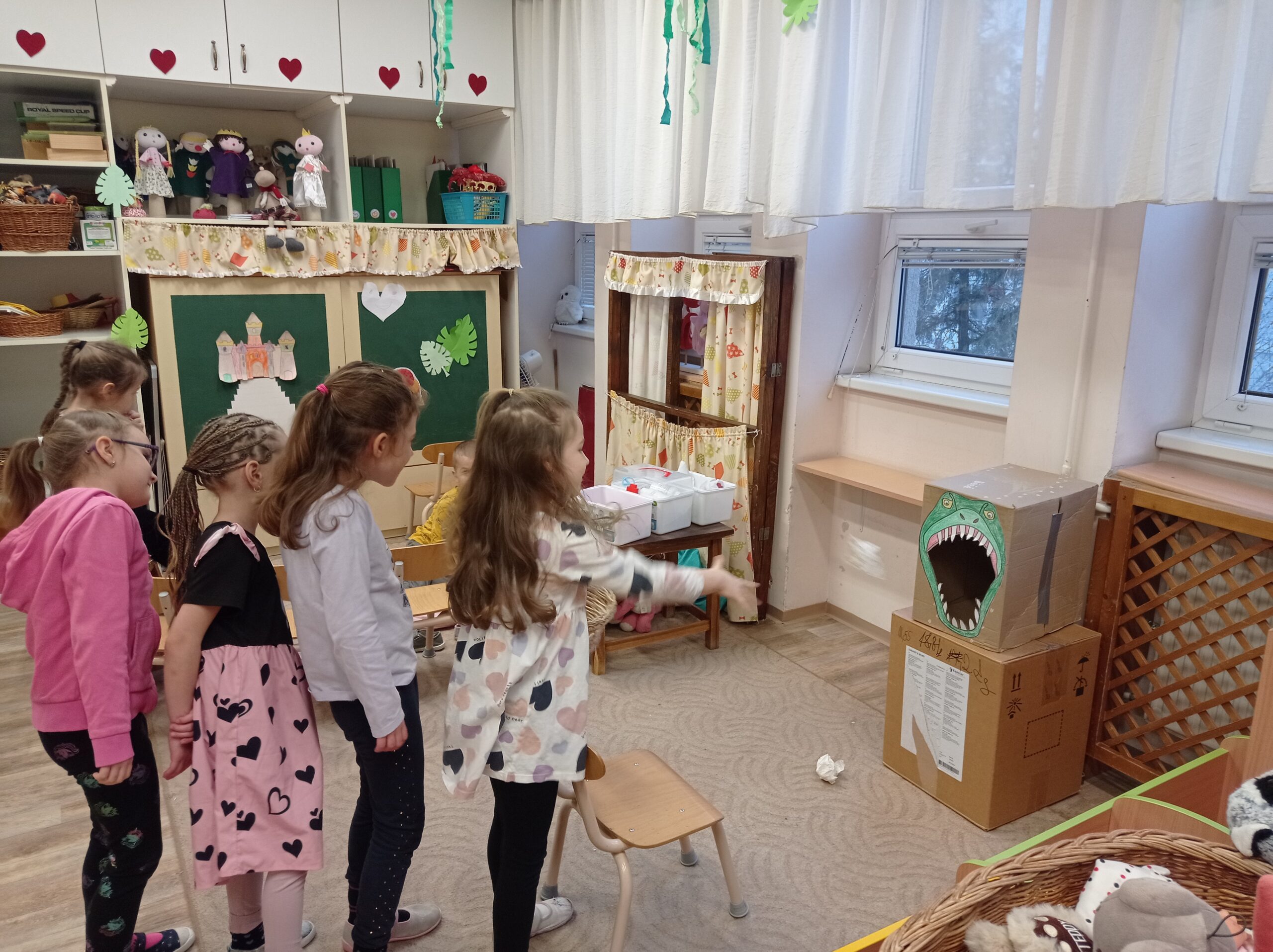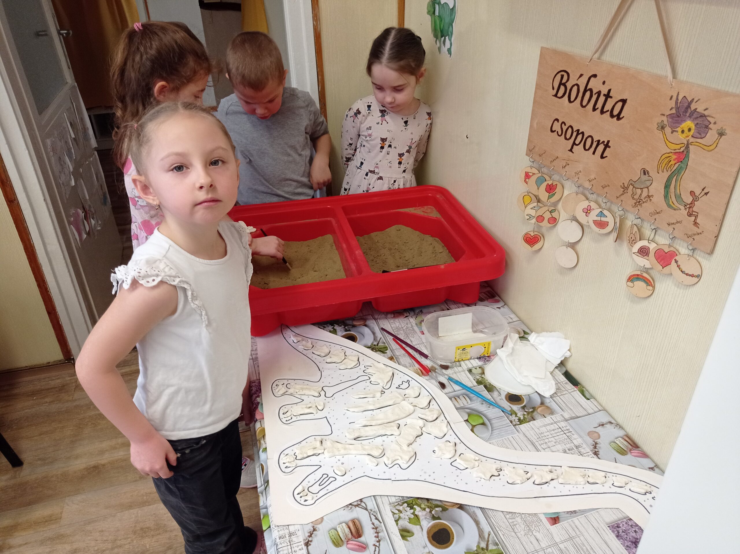 A foglalkozást a Van nekem egy álmom című Bagdi Bella zenével kezdtem. A gyerekek odajöttek a szőnyegre, aztán beszélgettünk, hogy kinem milyen álma, célja vannak. Sokfélét mondtak a gyerekek. Mivel Dínós projektben vagyunk, így ezzel kapcsolatban is mondtak ötleteket, célokat. Például legyen az a célunk, hogy építünk egy időgépet. Relaxációs gyakorlat következett (Lemegy a nap, lankad a kar…). Megépítettünk ezután egy kutatóállomást, időgépet, amivel visszautazhatunk a múltba, a dínók világába. Sokféle ötlet érkezett a gyerekektől, mit hová építsünk, és mivel készíthetjünk el, hogyan nézzen ki. Néhány lánynak az az ötlete támadt, hogy a babakonyhában egy dínókiállítást szerveznek. Mondták is, „az a cél, hogy sok dínót megismerjünk”. Az időgéppel elutaztunk a dínók világába. Meghallgattuk a „Repülj velem…” című Bagdi Bella zenét közben. Elvittük Boldog Dórát is magunkkal. Ahogy megérkeztünk képeket, könyveket nézegettünk, beszélgettünk, hogyan éltek, mit csináltak a dínók. Amikor visszérkeztünk az óvodába, megtekintettük a kiállítást. Ezután ásatást végeztünk, cél volt, hogy a dínónak a csontjait kiássák, és a helyére tegyék a táblán. Egy másik játékot is játszhattak a gyerekek (dínóetetés), ami a célbadobás volt. Majd a szőnyegre ültünk, és Boldog Dórával beszélgettünk az élményekről, illetve további célokat tűztünk ki magunk elé. Például: „mindig betartjuk a szabályokat az óvodában”, „az a célom, hogy megtanuljak cipőt kötni”…. Majd az 5. lépcsőfokra felragasztották a hónap jelét a gyerekek. Zárásként pedig lerajzolhatták az élményeiket.