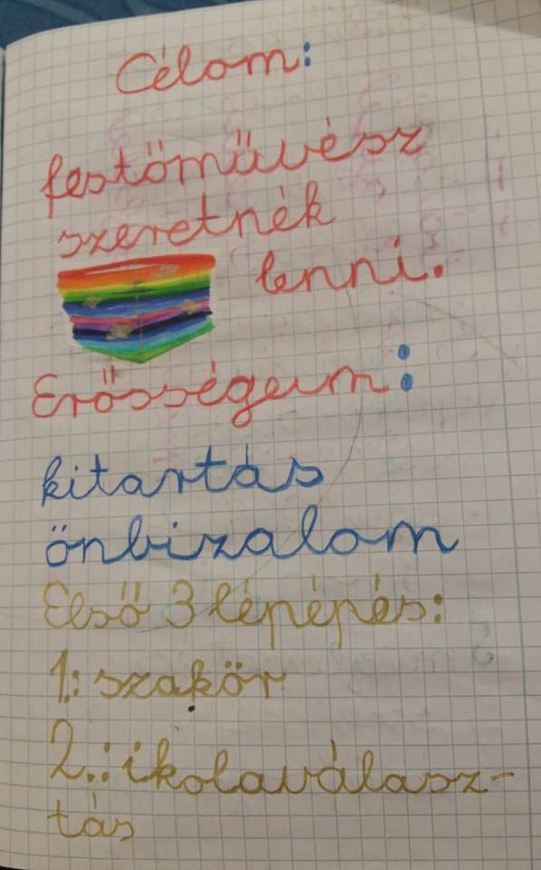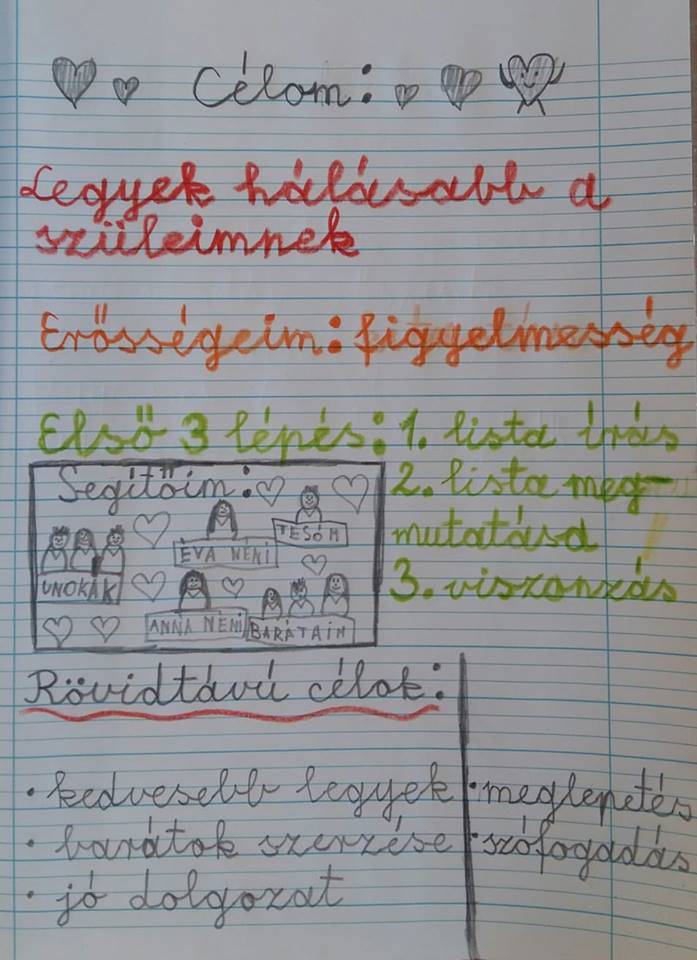 Ebben a hónapban a célok elérésének lépéseivel foglalkoztunk. Először számbavettük a gyerekek erősségeit, amire támaszkodhatnak a céljukhoz vezető úton. Aztán kerestünk reális célokat, rövid- és hosszútávúakat is. Ezeket részcélokra bontottuk, végiggondoltuk, milyen lépéseket tehetünk a megvalósulásuk érdekében. Végül örömmel fedeztük fel, hogy mindezekhez vannak segítőink, ill. az a plusztitok , hogy a célunkig vezető utat minél jobban élvezzük. 🙂