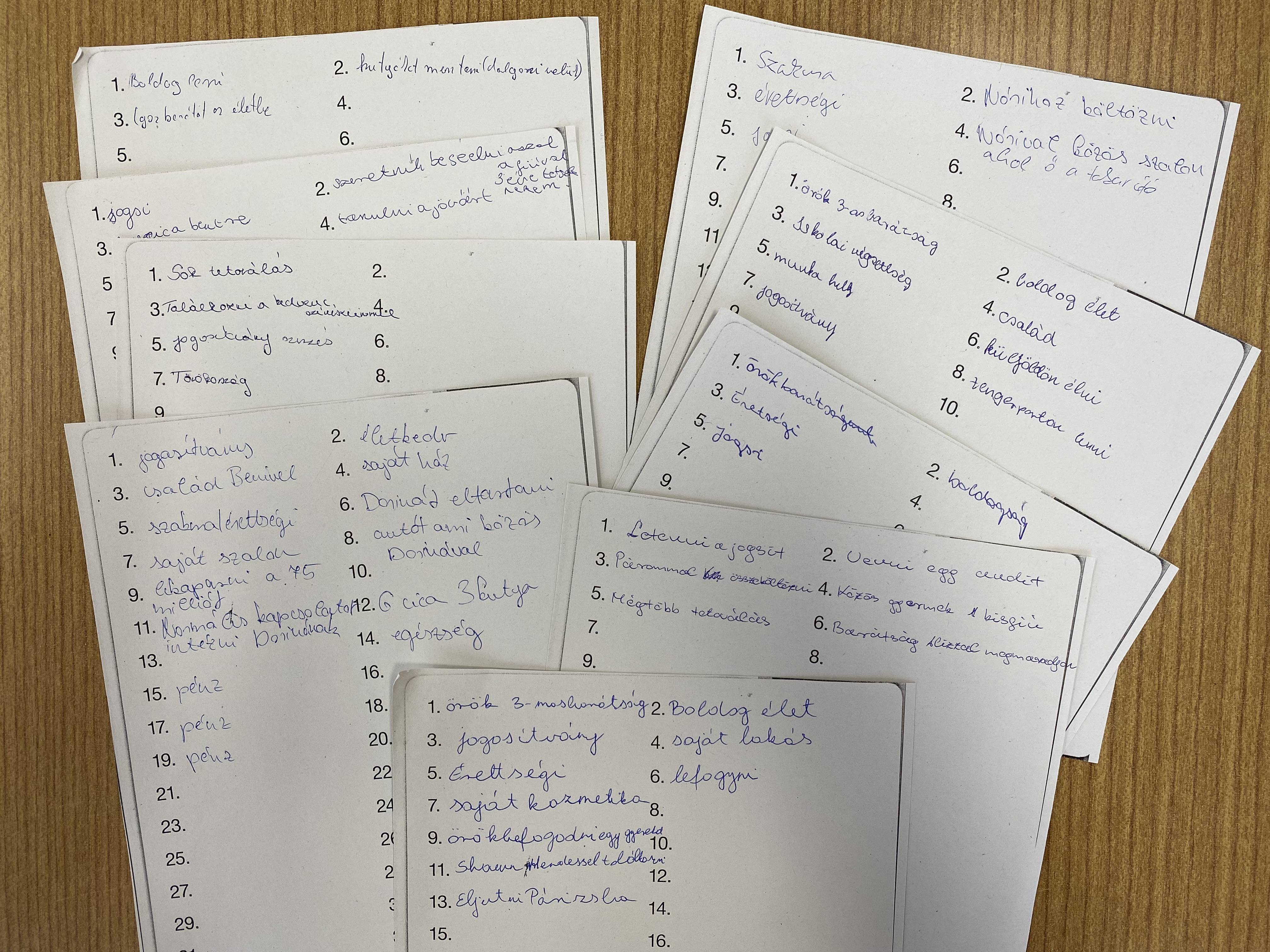A tanulók befejezik az alábbi mondatokat, úgy, hogy nem nagyon gondolkodnak rajta, majd megbeszéljük őket. (Életemben az a legfontosabb, hogy…, Tökéletesen boldog lennék, ha…., Ha több pénzem lenne….., Olyan ember szeretnék lenni, aki…, Életem értelme, hogy…., Amit a legjobban szeretnék elérni, az hogy… )