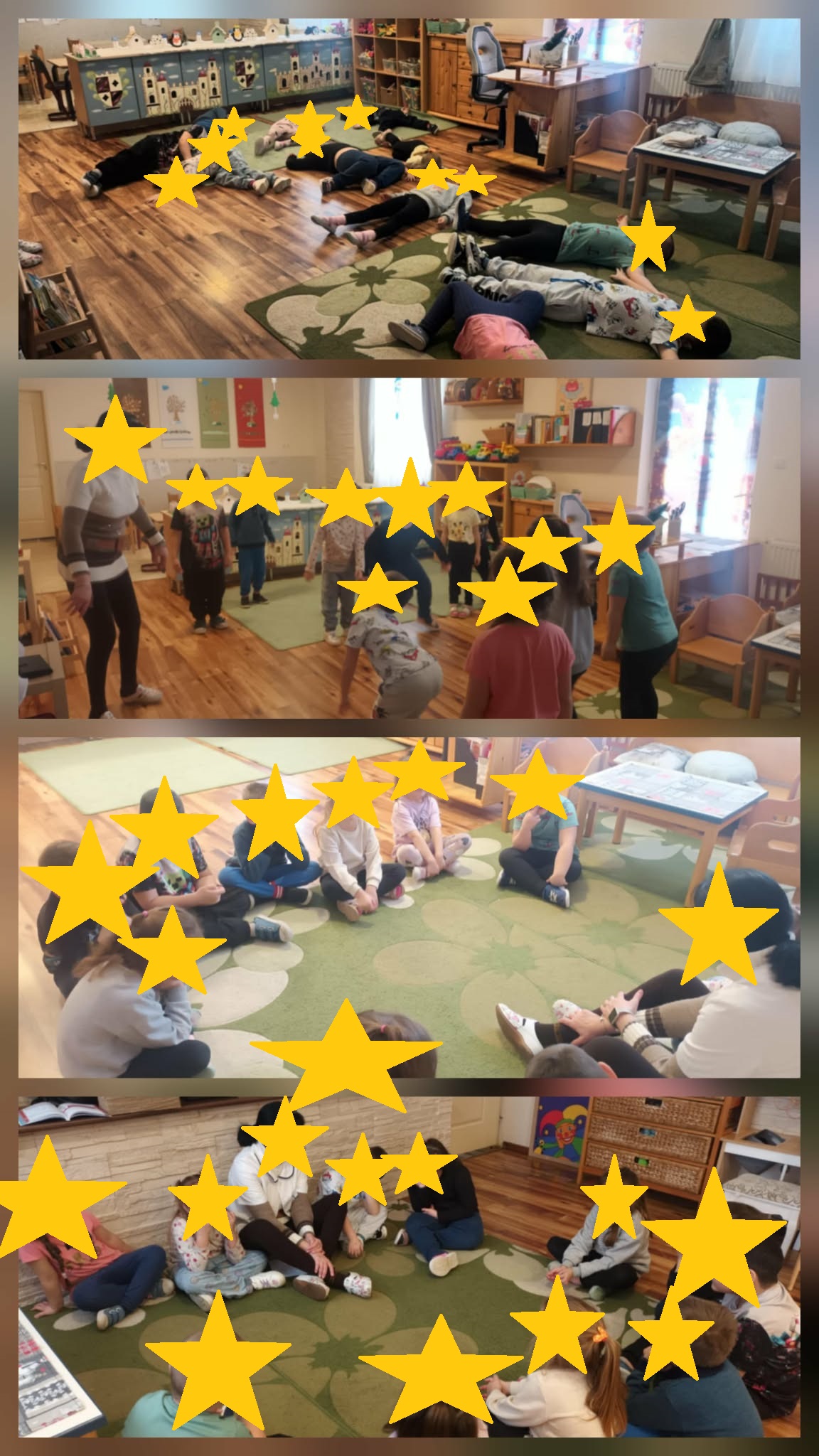A „Rongybabává válok” játék különösen tetszett nekik, hiszen játékosan tanultak meg pihenni. A szívecske körbeadása közben jól érzékelhető volt az egymásra figyelés és az érzelmi kapcsolódás erősödése. A mondóka közös elmondása során vidáman, mosolyogva ismételték a mozdulatokat.