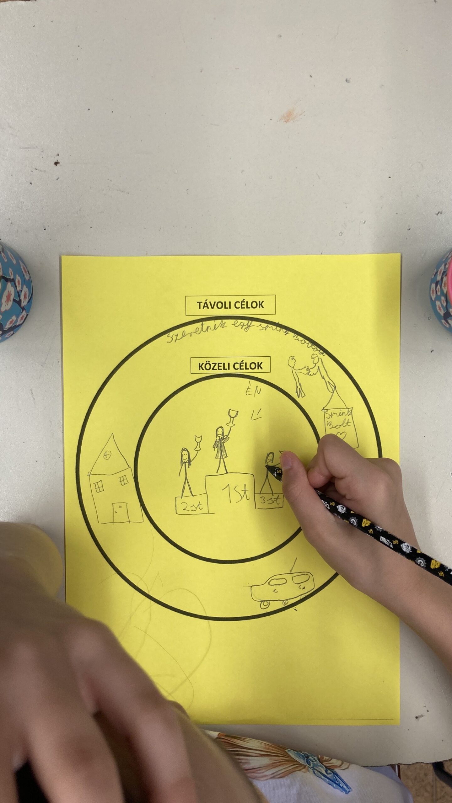A „Célok kitűzése és elérése” témájú boldogságóra 4. osztályban kiemelkedően sikeres volt, főként a vizuális megközelítésnek köszönhetően. A diákok rendkívül élvezték a rajzos feladatot, mely során kreatívan ábrázolták a távoli és közeli célok különbségét. Ez a vizualizáció segített abban, hogy a gyakran elvont fogalmak kézzelfoghatóvá váljanak számukra. A célok 5 területhez való megfogalmazása nagyfokú elmélyülést és önreflexiót igényelt, amit a gyermekek – meglepően éretten – teljesítettek. A foglalkozás végére mindenki egy egyedi, személyes „céltérképpel” gazdagodott, ami motivációs eszközként is szolgál majd. A célok írásbeli rögzítése megalapozta a későbbi tervezés fontosságának megértését.
