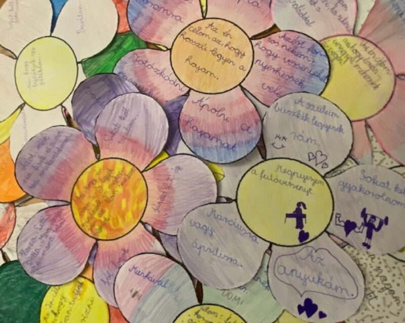 A januárban a célok megfogalmazására és megvalósítására összpontosítottunk. Elsőként arról beszélgettünk, mit jelent a gyerekek számára egy vágyott eredmény, és milyen terveket szoktak kitűzni maguk elé. Ezt egy játékos feladat követte: előbb mindenféle szándék nélkül dobták a labdát, majd a „Beletalálok!” szó kimondásával igyekeztek pontosan célba találni. A közös megbeszélés során arra kerestük a választ, hogyan segíti a sikeres megvalósítást, ha kimondjuk vagy elképzeljük, amit szeretnénk elérni. Ezután összegyűjtöttük, milyen ismérvekkel rendelkezik egy jól megfogalmazott cél: legyen világos, kisebb lépésekre bontható, reálisan teljesíthető és időben behatárolt. A gyerekek ezt követően elkészítették saját „célvirágukat”. A virág közepére mindenki egy kitűzött célját írta, a szirmokra pedig a kérdésekre adott válaszai kerültek: miért fontos számára, mit kell tennie érte, kitől kaphat segítséget, mikorra szeretné megvalósítani, és hogyan ünnepli majd a sikerét. A foglalkozást egy közös mini rituáléval zártuk: mindenki magasba emelte a célvirágát, és együtt, hangosan kimondtuk a megerősítő mondatot: „Képes vagyok elérni céljaimat!”