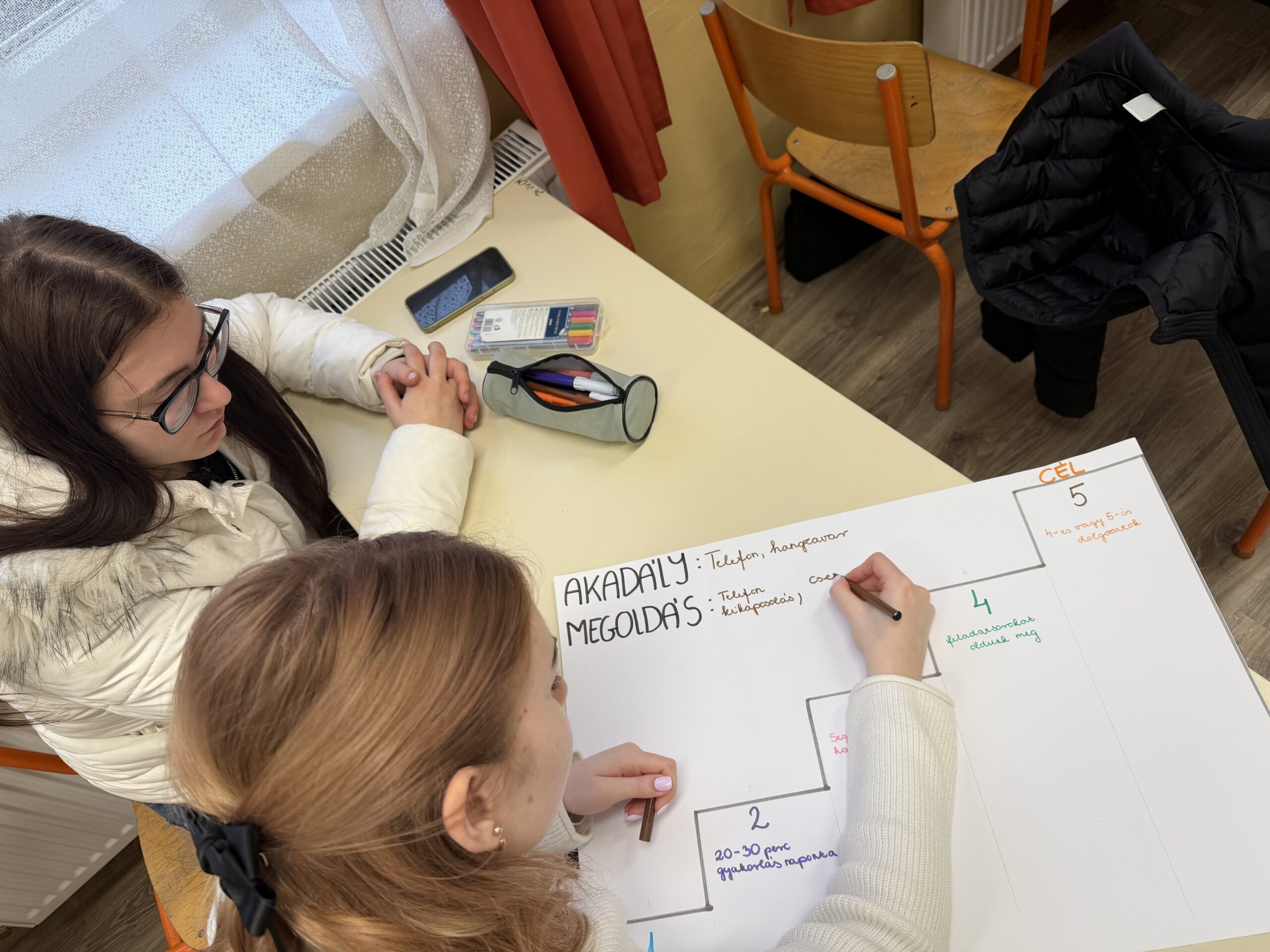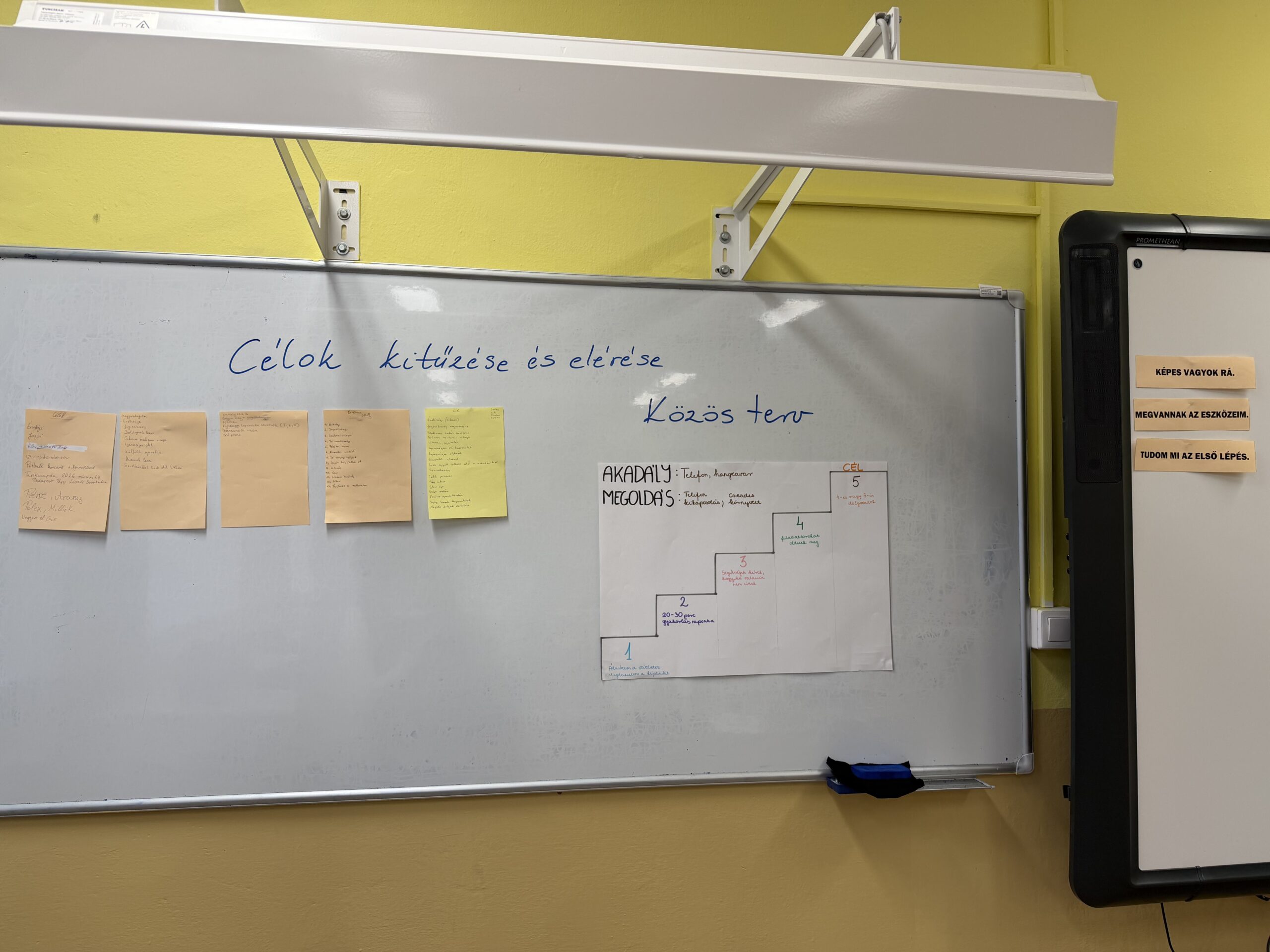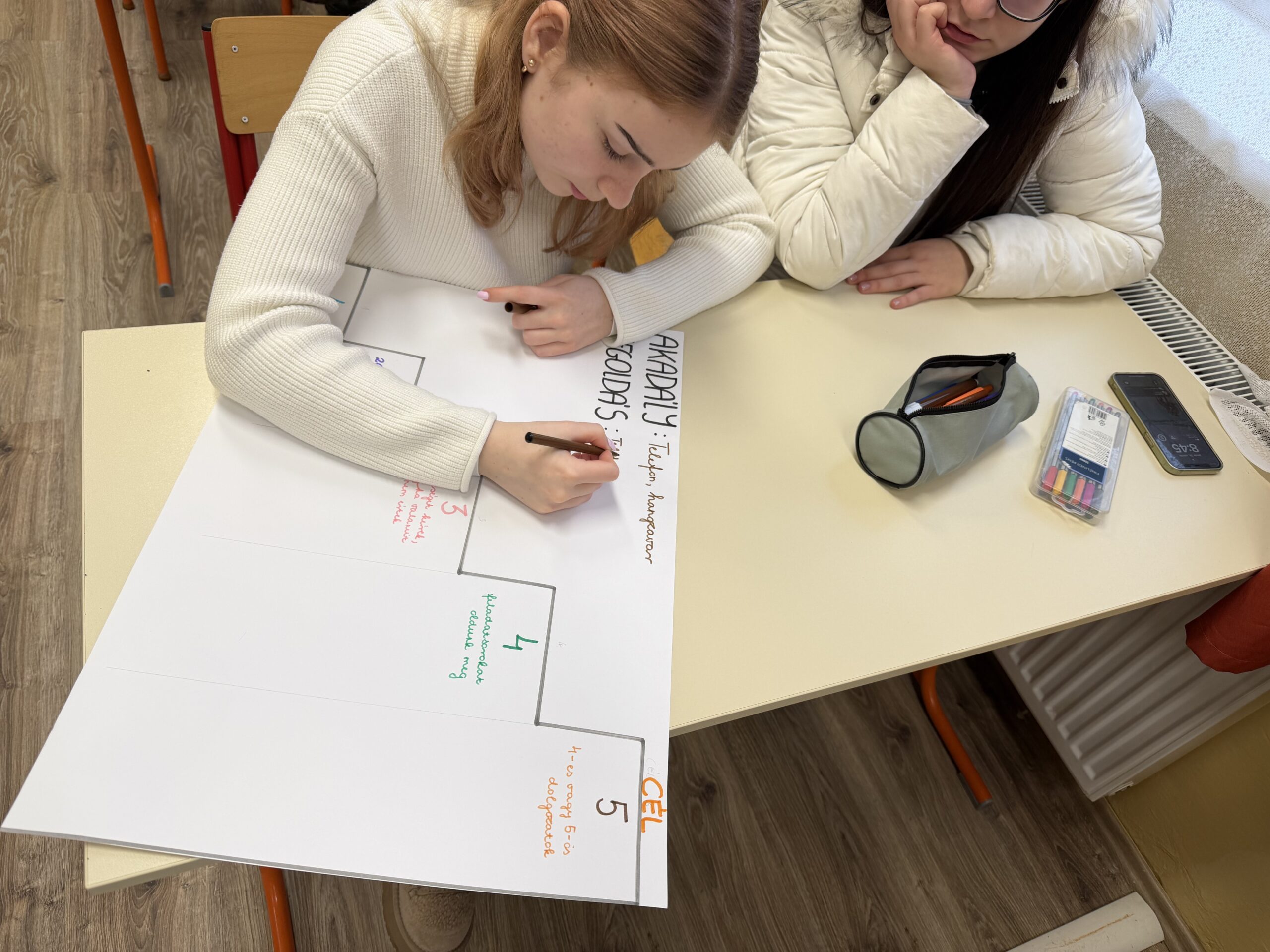 A tanulók kiválasztanak egy közös célt (pl. jobb jegy matekból, rendszeres sport). Majd rajzolnak egy kartonra egy 5 fokú lépcsőt, ahol a legfelső fok a cél. Az alatta lévő fokok a részfeladatok (pl. „beiratkozom edzésre”). A lépcső mellé írnak egy dolgot, ami hátráltathatja őket (pl. lustaság, telefonfüggőség), és egy módszert, amivel ezt legyőzik. Gondolatébresztő: Kell egy terv Tk.:134.