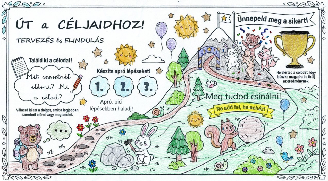 A januári boldogságórák alkalmával a célkitűzés és a célok megvalósításának folyamatát jártuk körül. A hónap dala (Van nekem egy álmom…) jó kiindulópontot adott ahhoz, hogy a gyerekek felismerjék: mindenkinek vannak álmai, amelyekért érdemes tenni. A foglalkozások során sokat beszélgettünk arról, milyen célokat érdemes választani, és hangsúlyt fektettünk arra is, hogy ezek reálisak legyenek, igazodjanak életkorunkhoz, testi adottságainkhoz és meglévő ismereteinkhez. Közösen átgondoltuk, milyen lépések vezethetnek a célok eléréséhez, valamint azt is, hogyan kezeljük a kudarcot: ha elsőre nem sikerül, nem adjuk fel, hanem újra próbálkozunk. Szó esett arról is, kik támogathatnak bennünket ezen az úton – családtagok, barátok, pedagógusok –, és arról, hogy a célokért tett erőfeszítések során nemcsak közelebb kerülünk álmainkhoz, hanem fejlődünk, tanulunk és erősödünk is.
