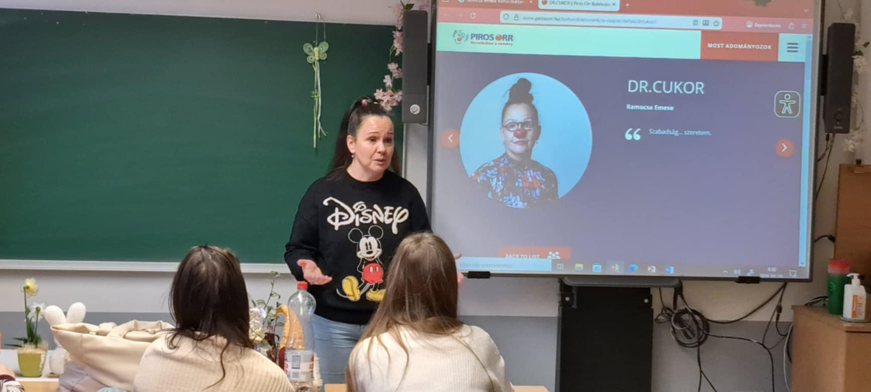 Meghívtam osztályunkba a Piros Orr Bohócdoktorok Alapítvány egyik bohócdoktorát, Dr. Cukrot (Ramocsa Emesét), aki a gyógyító nevetést viszi a betegekhez.