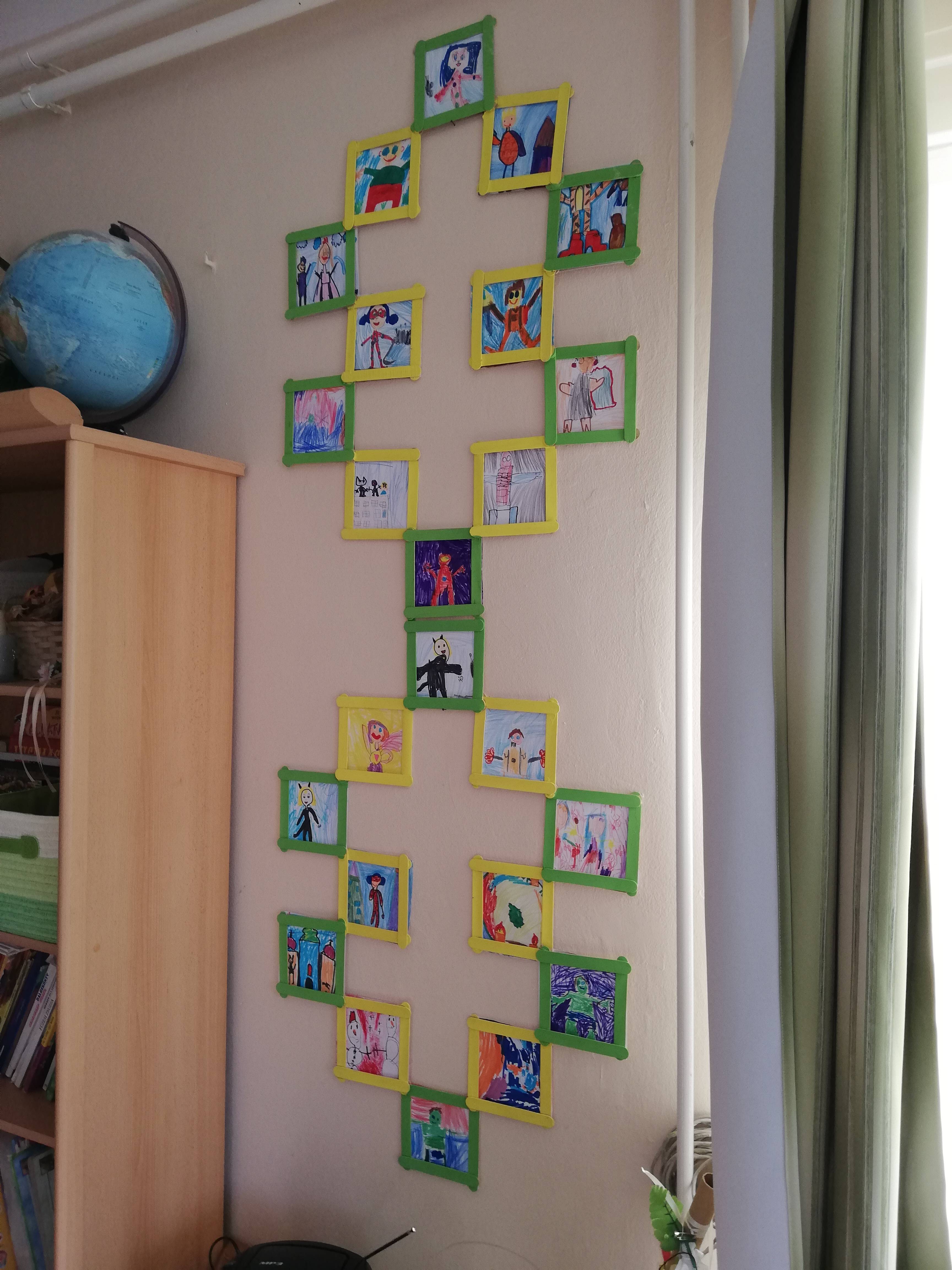 A boldogságóra program 6. hónapjának a megküzdési stratégák. Kihívásokkal, megküzdésekkel foglalkozunk ebben a hónapban. Kedvenc játékunk a bátorság próba volt. Építettünk a szőnyegen egy akadályokkal teli pályát, aki ezen áthaladt elérte célt és egy piros almát kapott ajándékba. Öröm volt nézni, ahogy a gyerekek biztatták egymást és kitörő örömmel fogadták, ha minden akadályt le tudott a társuk. Ez a játék igazán összekovácsolta a gyermekeket. Bemutattuk, a gyermekeknek, hogy hogyan sikerült Róza királylánynak megváltoznia. Igyekeztünk olyan meséket bemutatni, ahol a hősnek akadályokkal kell megküzdeni, hogy ebből is merítsenek energiát. Azután lerajzoltuk hogy ki mivel tud küzdeni ahozz, hogy a célját elérje. Táblát készítettünk amelyben olyan hősök szerepelnek, akik példát adhatnak a megküzdésből.