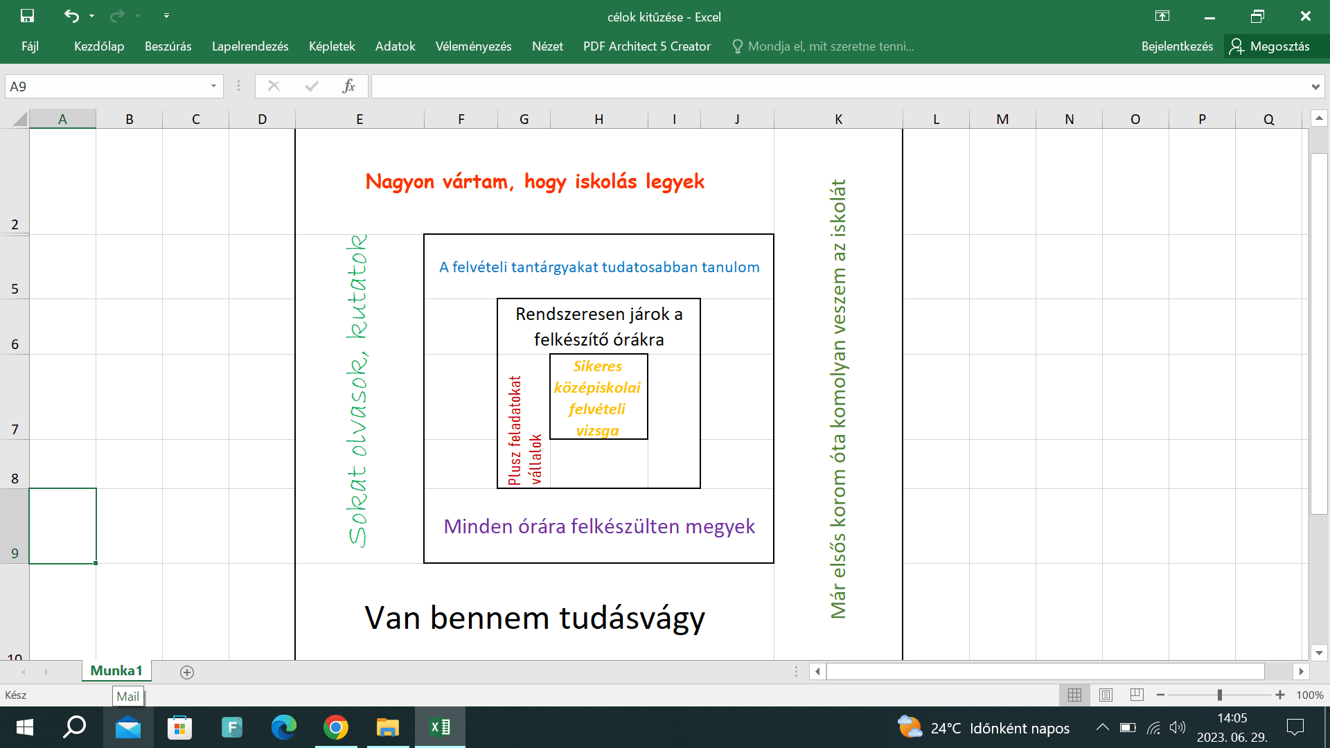 Különleges módon különleges céltáblát készítettünk. Először meghatároztuk a fő célunkat: sikeres középiskolai felvételi megírása. Ezután összegyűjtöttük azokat az apró feladatokat (célokat), amelyeket teljesíteni kell ahhoz, hogy a nagy cél megvalósuljon. Gondolatainkat egy excel táblázatban rendszereztük, így tanulhatták, gyakorolhatták az excel használatát is. Az eredménnyel elégedettek voltunk.