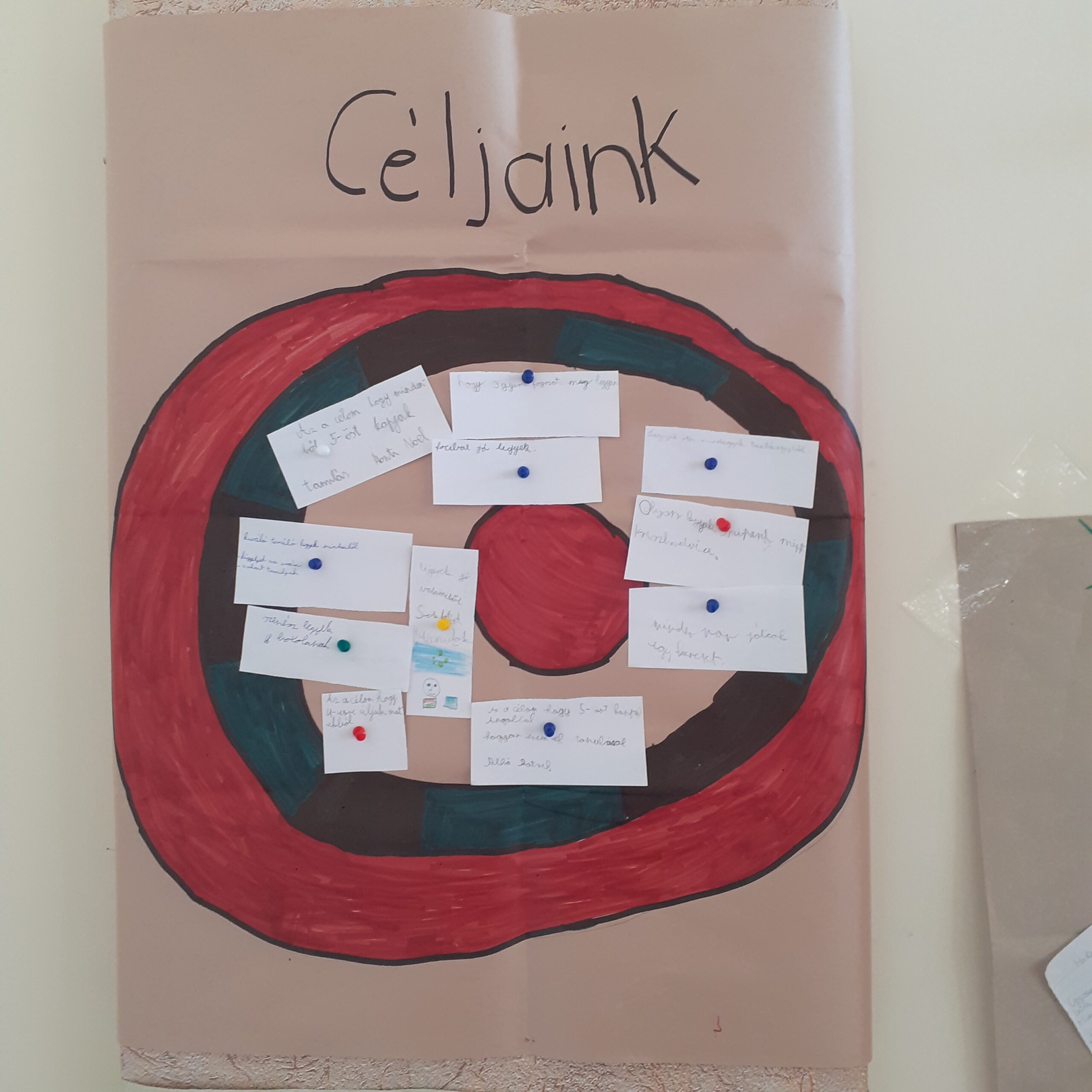A tanulókkal beszélgettünk egyéni és közös célokról. A félévi tanulmányi eredményükhöz kapcsolódóan értékelték teljesítményüket, majd minden tanuló kitűzött egy tanulásukhoz vagy magánéletükhöz kapcsolódó célt. Egy-egy cetlire felírták a céljukat, a papírok hátuljára pedig két-két lépést, amit annak eléréséhez szükséges megtenniük. A tanulók egy csoportja vállalta a céltábla megrajzolását, amire a célokat feltűztük.