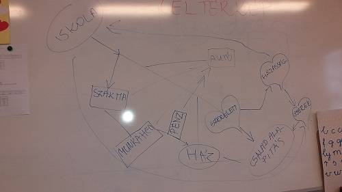 A tanulókkal megbeszéltük mi az a cél, hogyan, milyen úton és akadályokat leküzdve érhetjük el azokat. Érdekes volt, hogy minden diák a családot, a házat és a munkahelyet tűzte ki célul. Levezettük azokat az állomásokat – kisebb célokat – amelyek megvalósításával tudjuk elérni a végső, legnagyobb célt. Nagyon aranyosak voltak. Sajnos, nem volt önálló elképzelésük a tanulóknak, ezért a táblára rajzoltunk egy „céltérképet”, amit lemásoltak a tanulók!