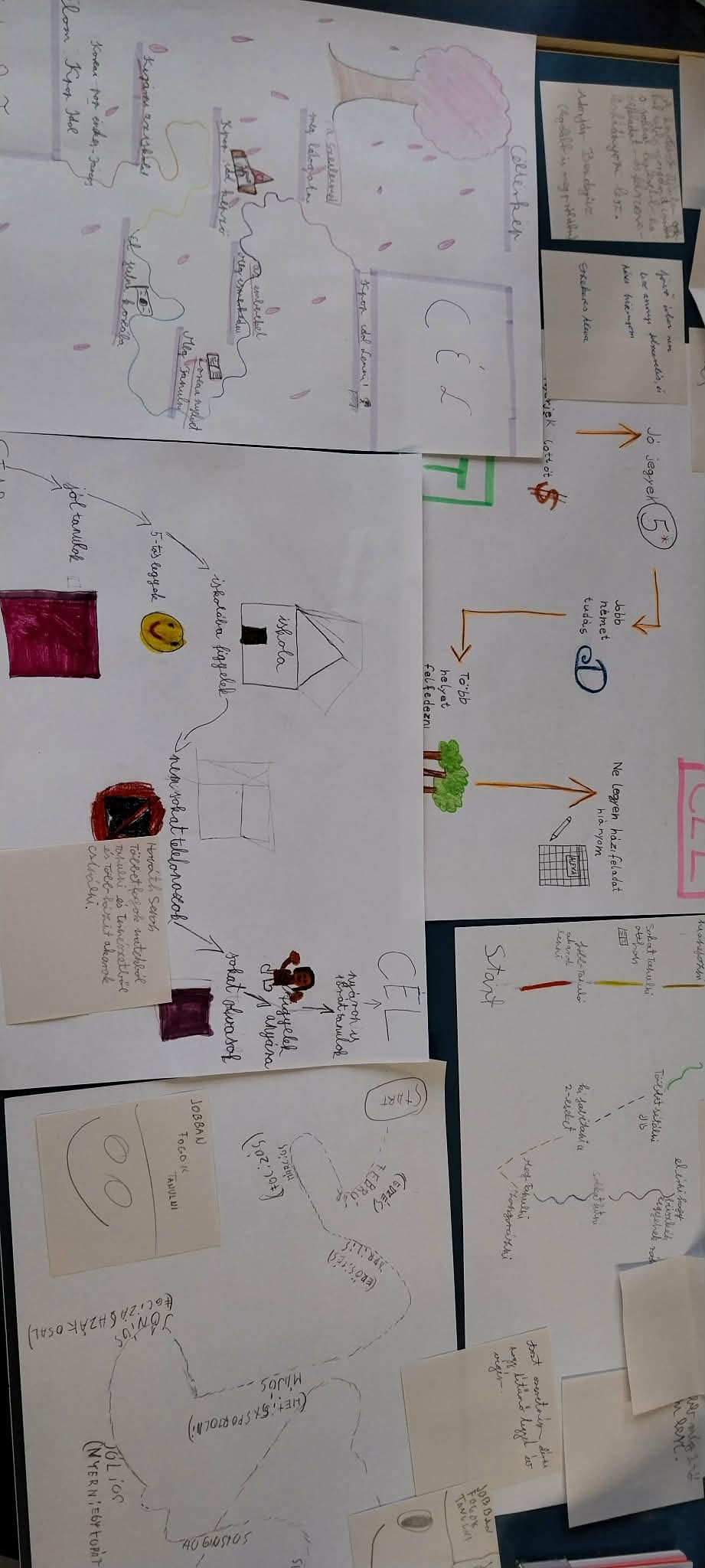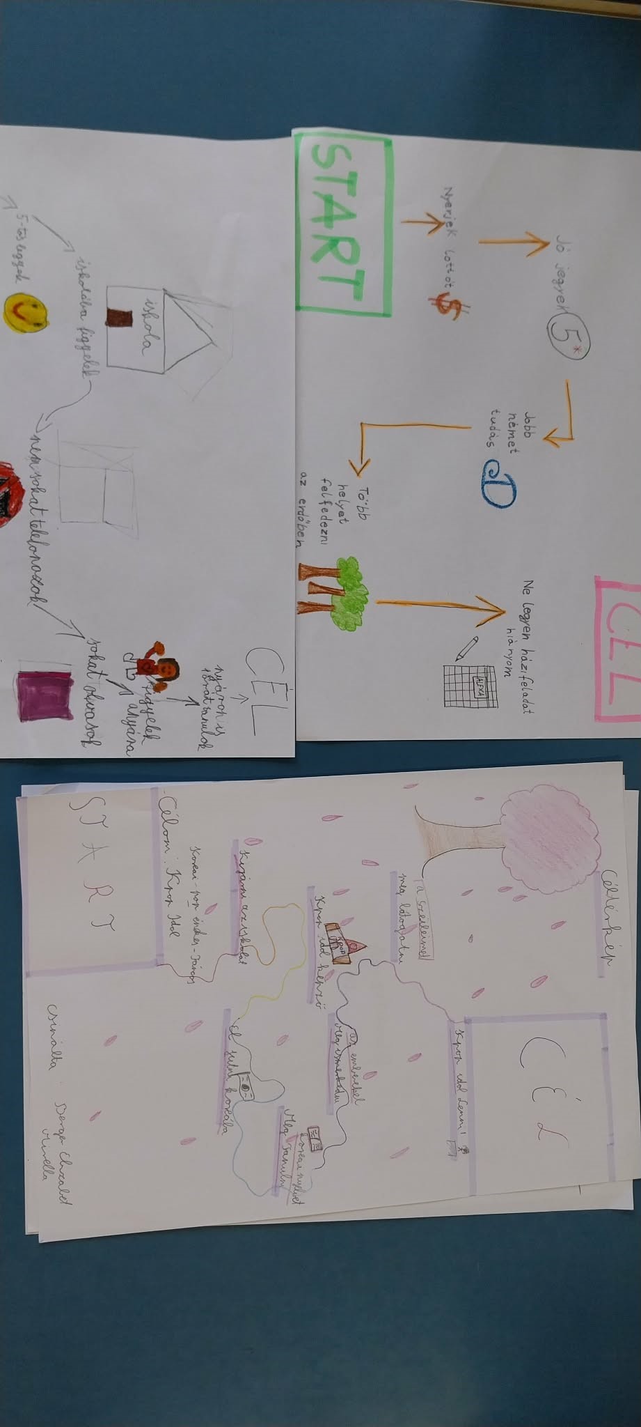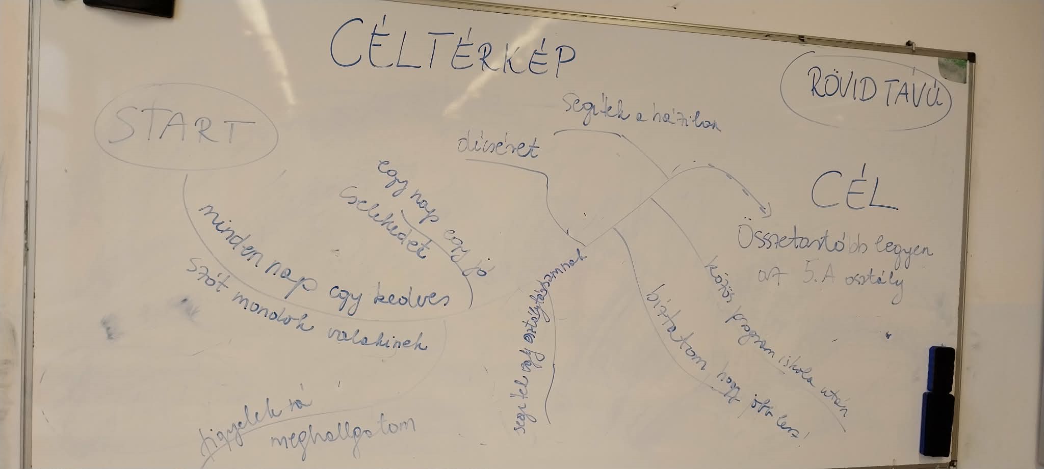 5.A Az osztállyal a rövid és hosszú távú célokról beszéltünk. Milyen a jó célkitűzés. Legyen konkrét, és tűzünk ki határidőt! Az első félév kapcsán kis papírokra tanulással, eredménnyel kapcsolatos célokat fogalmaztak meg a gyerekek. Ezután rövid és hosszú távú célokkal céltérképet rajzoltunk.