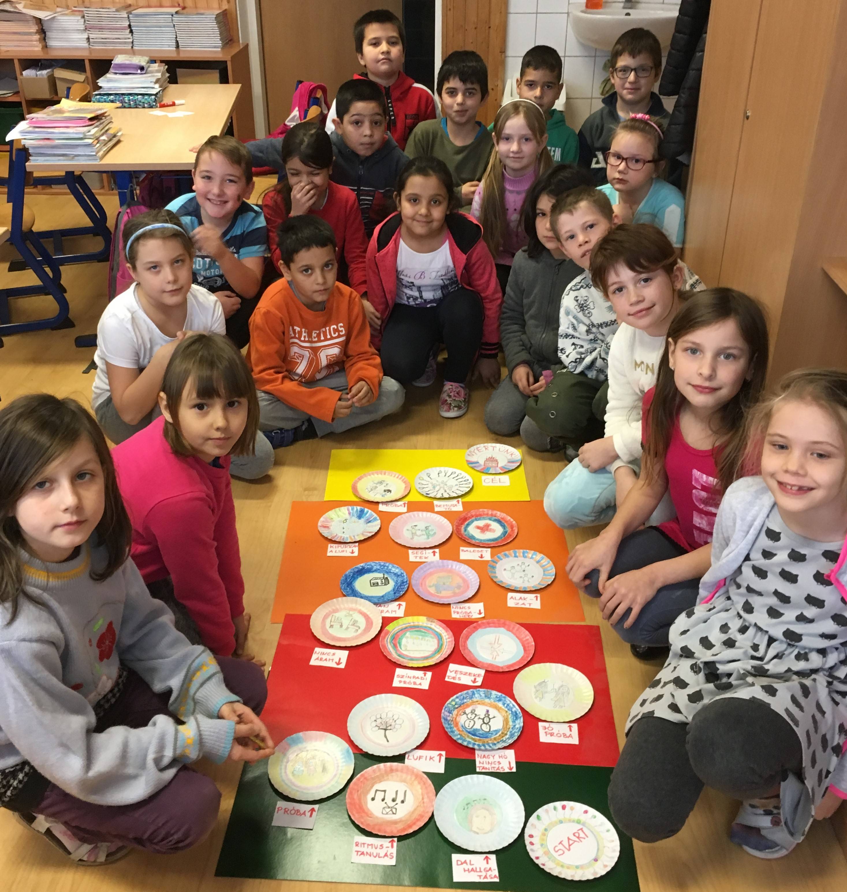 Az órán a Kisbence titkai vers után beszélgettünk az álmokról célokról. Majd a saját célok meghallgatása után kerestünk egy közös célt, amit a közeljövőben az osztály el akar érni, s sikeres akar lenni benne. Ez a cél az elkövetkező farsangon való közös táncos fellépés, illetve jó szereplés lett. Megbeszéltük, mi kell ahhoz hogy sikeresek legyünk, mit kell tennünk lépésekre bontva, illetve hogy milyen nehézségek jöhetnek közbe. Mindezt megjelenítették a rajzukon, majd egy társasjáték formátumban leraktuk egy torta alakzatra, hisz a célunk, hogy a szereplésért az elsőnek járó tortát megkapjuk.