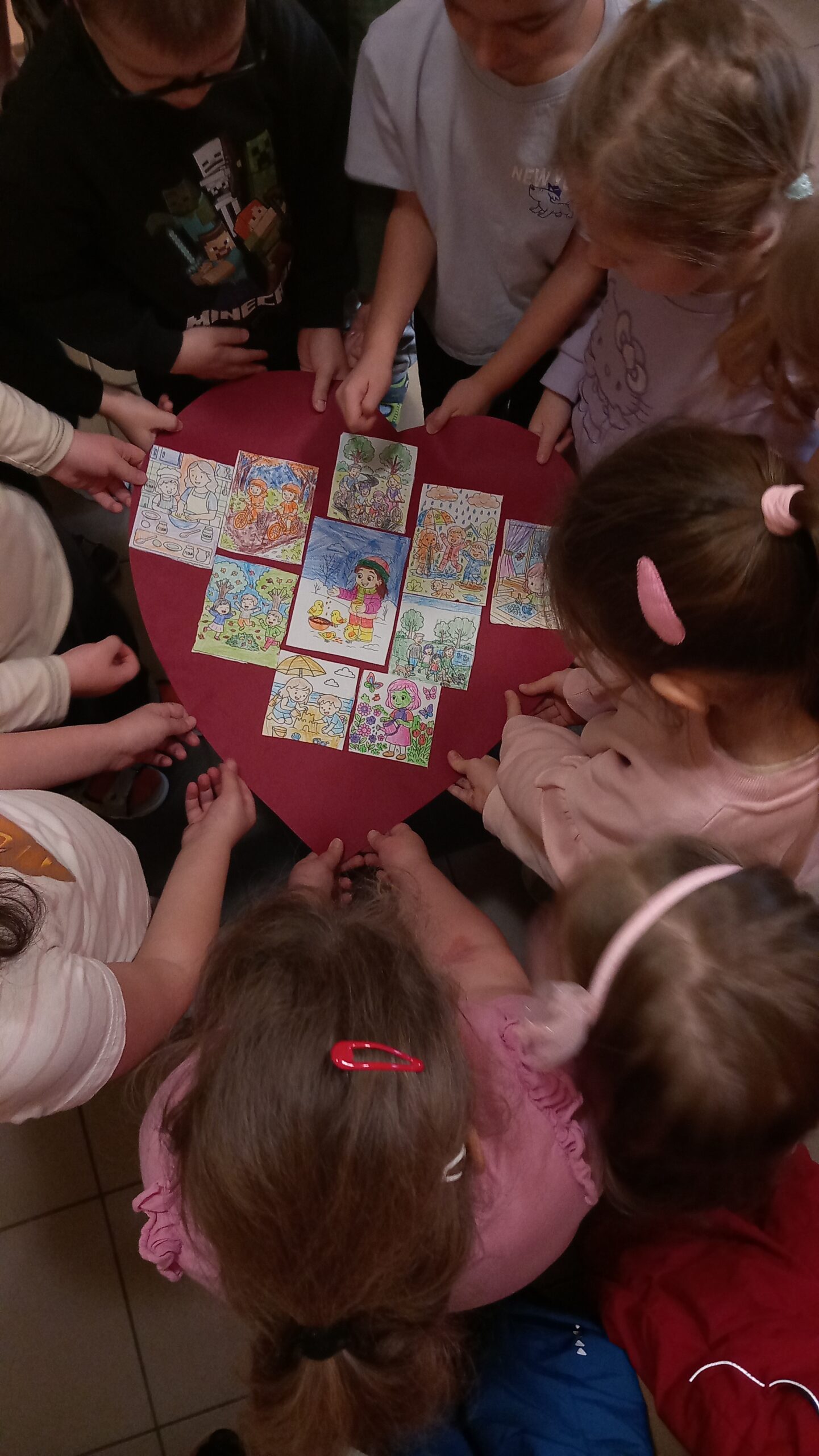 Eszközök: 1 nagy bordó színű karton, ollók, színesceruzák, ragasztók, kis méretű kinyomtatott, cselekvéseket ábrázoló kifestők.
