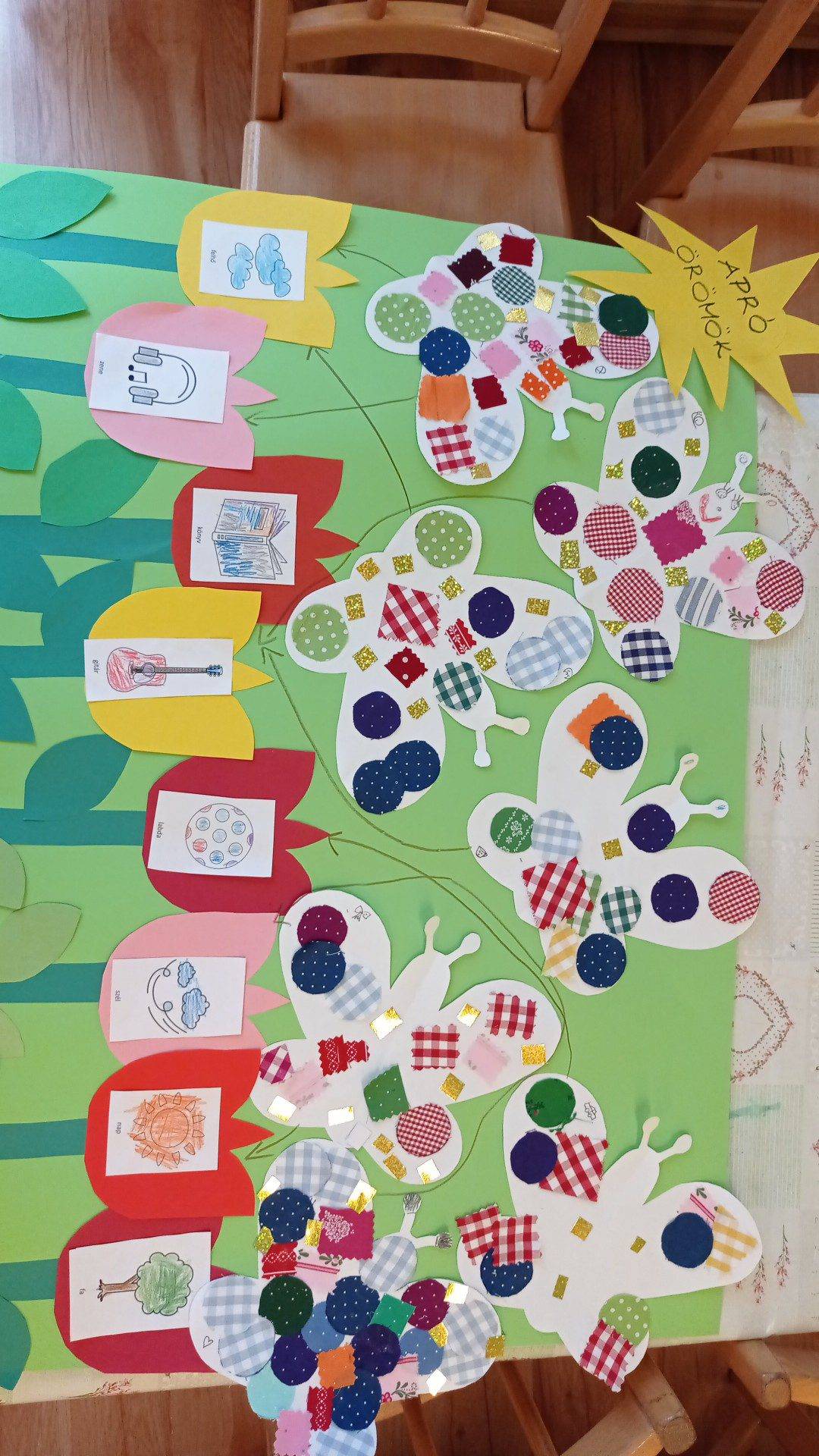 Ennél a témánál nem volt nehéz dolgom, csak meg kellett láttatni azokat a dolgokat amik körül vesznek minket. A téma feldolgozásához pillangókat készítettünk, textil formák ragasztásával. és minden pillangó arra a „virágra” szállhatott(többre is), ami örömöt jelent számára a hétköznapok során.