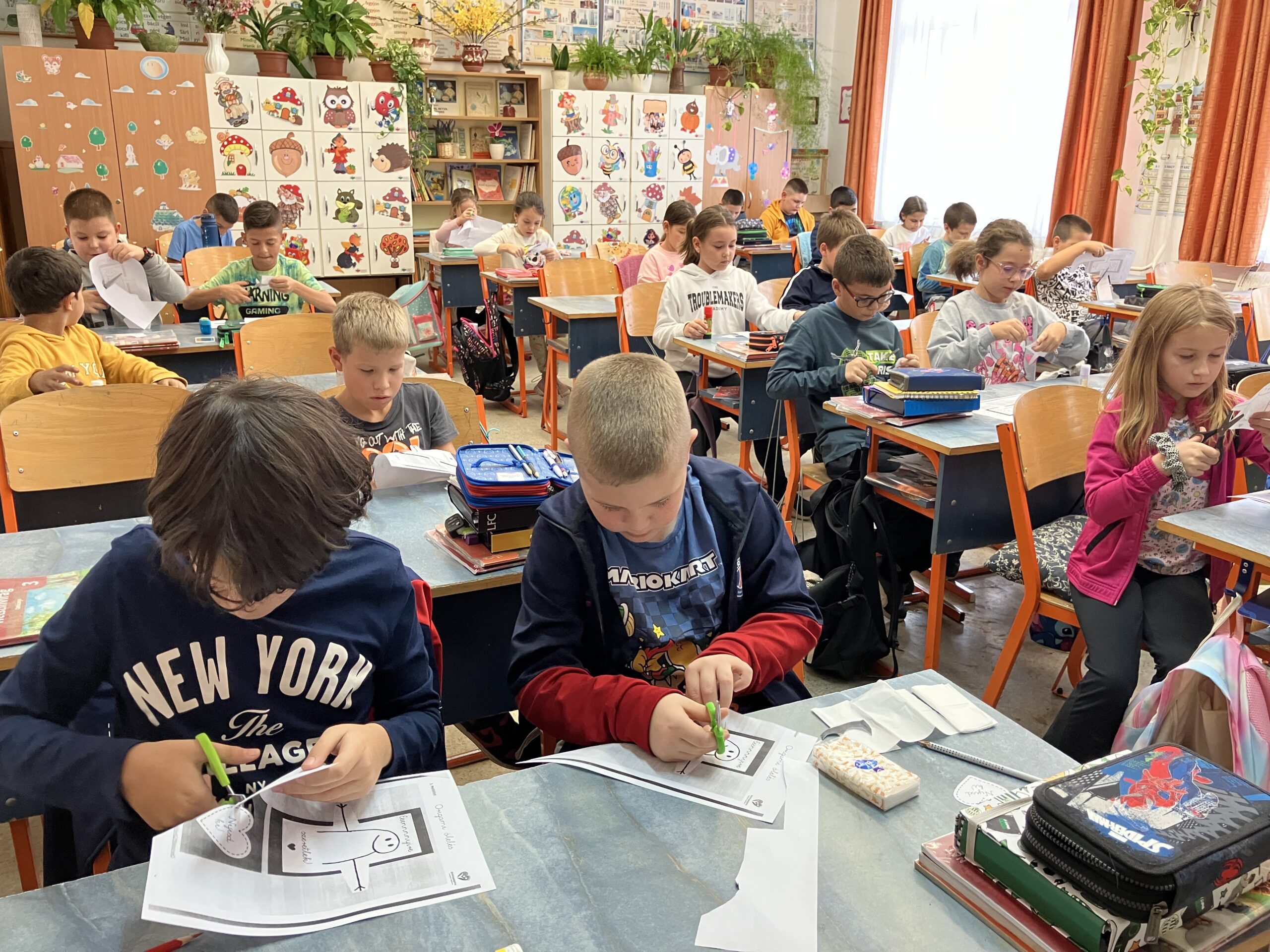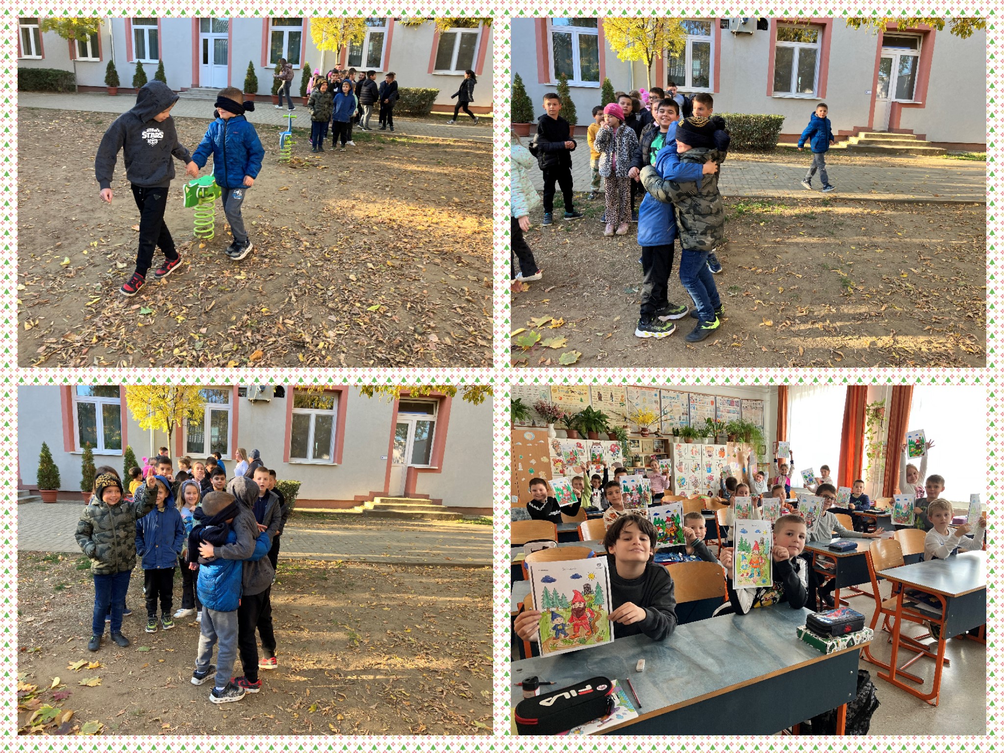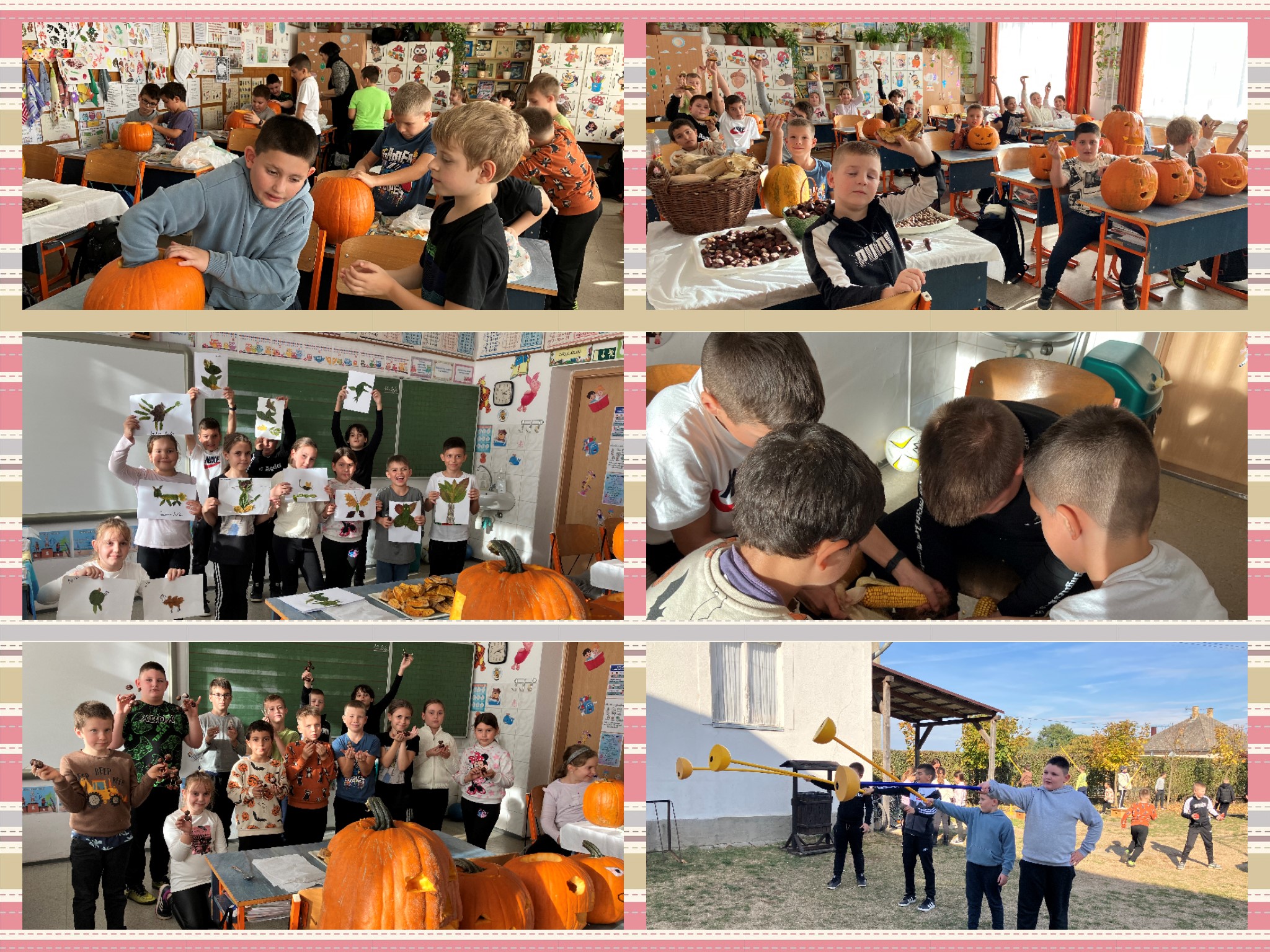 Az októberi boldogságórákon Az optimizmus gyakorlásáról beszélgettünk, tisztáztuk a szó jelentését is. Megállapítottuk, hogy az optimista ember minden helyzetben a legjobbat keresi, mindig van megoldás. Olyan eseteket, példákat soroltak, amikor pozitív hozzáállással saját maguk vagy felnőtt segítségével kitartottak a kihívások során, ezáltal sikeresen legyőzték az akadályokat. Ezek a korlátok nem akadályozhatják meg céljaik elérésében és ezeket kihívásként kell felfogni. Minden órát azzal kezdtük és zártuk, hogy megkérdeztem őket arról, hogy milyen napjuk volt, és hogy az órák végén hogyan érezték magukat, sőt arckifejezésükkel is érzékeltették. Az állatok világnapja alkalmából lerajzolták kedvenc állataikat, illetve az iskolai felhívásba bekapcsolódva érdekes állatfotókat küldtek be. Megnéztük közösen az Oscar-díjas kisfilmet Piperről, a kis szalonkáról, majd beszélgettünk arról, hogy kinek mit jelent az optimizmus. Ezt követően a testi-lelki egészséggel kapcsolatos szólásokat, közmondásokat is gyűjtöttünk. Megismerkedtünk az Ugysemegy és Debizony c. mesével, majd feldolgoztuk a mesefeldolgozó kérdések segítségével. Gyalogló túránk során a településünk látványosságait is érintettük. A vakok és gyengénlátók napjára emlékezve az udvaron akádálypályán párban az egyik bekötött szemű társat kellett végigvezetniük és a végén öleléssel köszönték meg egymásnak a segítséget. Ölelős figurát is hajtogattak papírból szeretteiknek. Az őszi szünetet megelőző nap Tök jó délutánt tartottunk. Barkácsoltunk, kézműveskedtünk (tökfaragás- festés, gesztenye és makkfigurák, levélképek, kukoricamorzsolás, napraforgó bugázása), népi játékok kipróbálása az udvaron. Ezeket a pillanatokat sok nevetés, mozgás és vidám versengés kísérte, sőt sült sütőtököt is kóstolhattak a gyerekek.