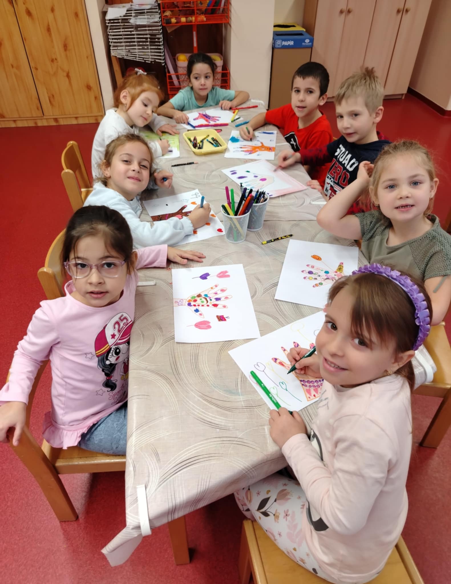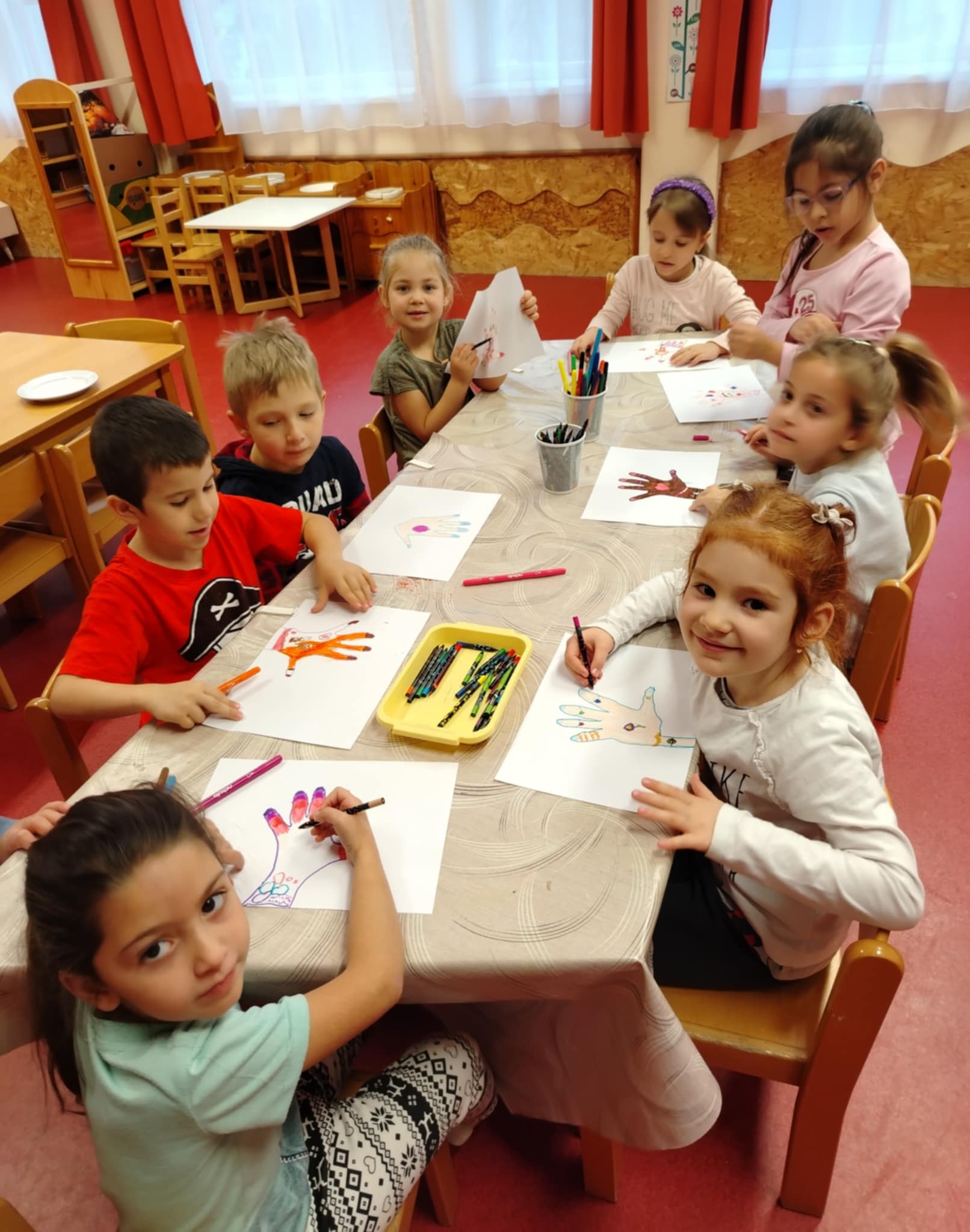 A társas intelligencia témakörből a „Bátorító tenyér” – játékot választottam. A gyermekek nagy örömmel készítették el saját tenyérnyomatukat és kreatívan, szárnyaló fantáziával rajzolták bele azt, ami számukra bátorító és jó kedvűek lesznek tőle.