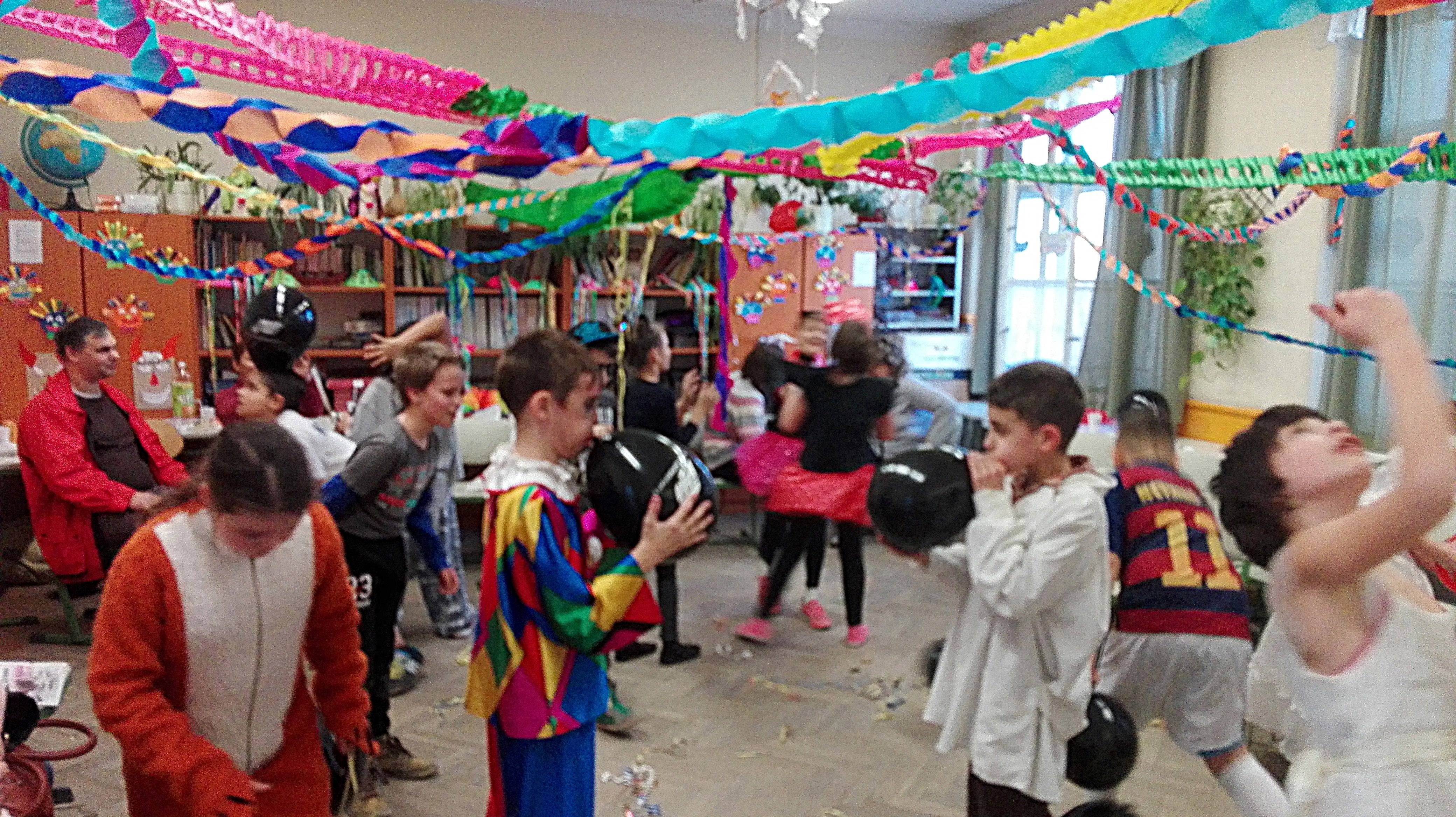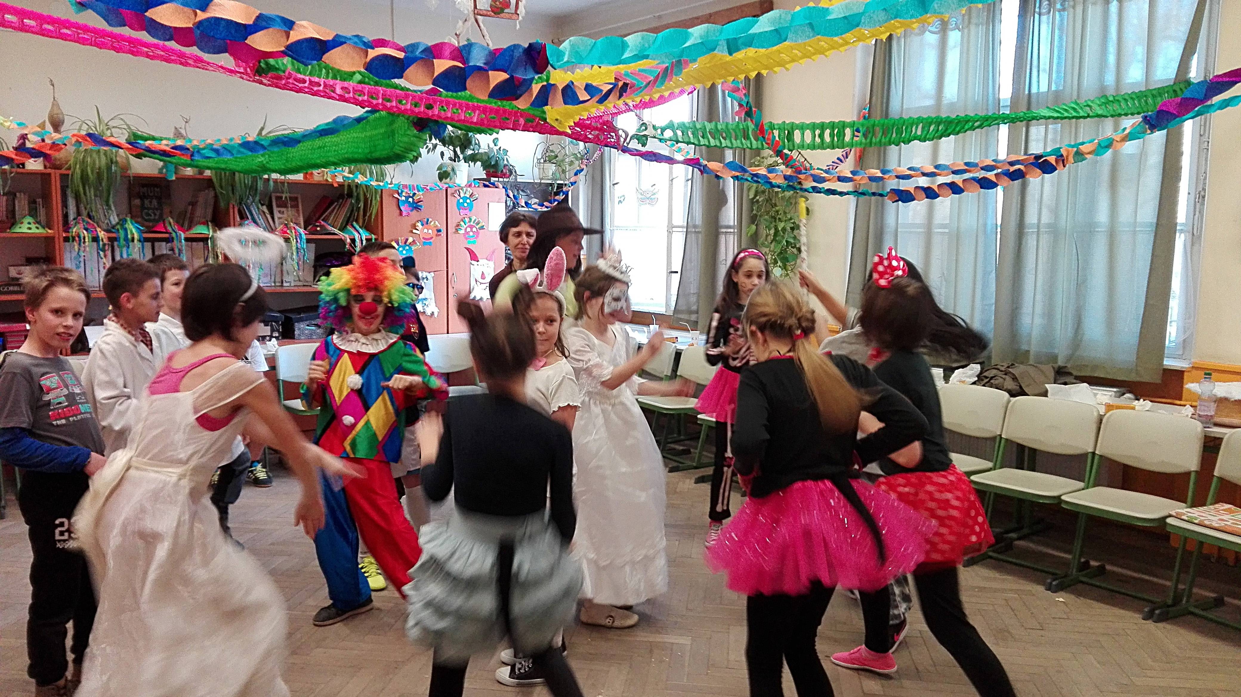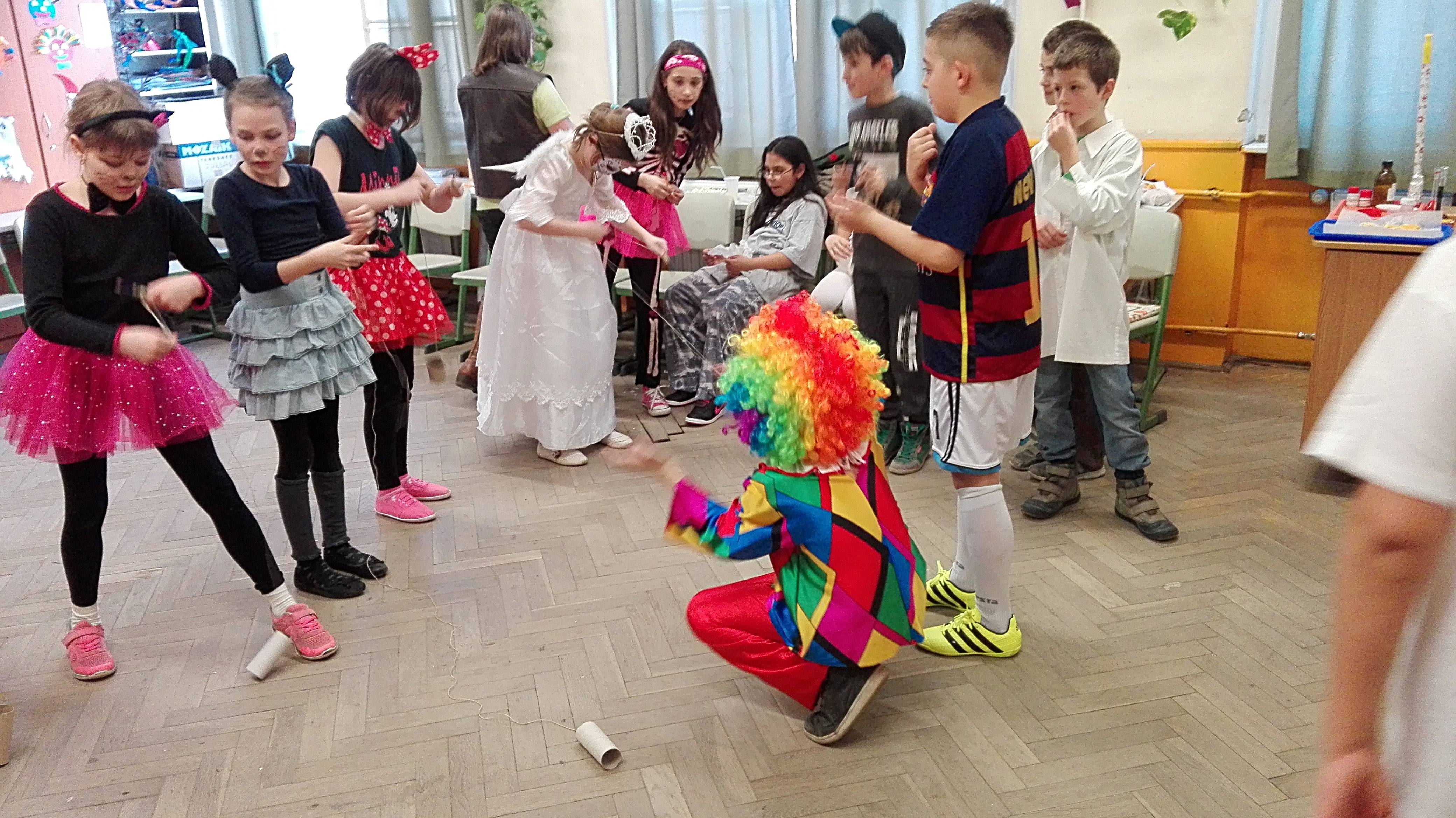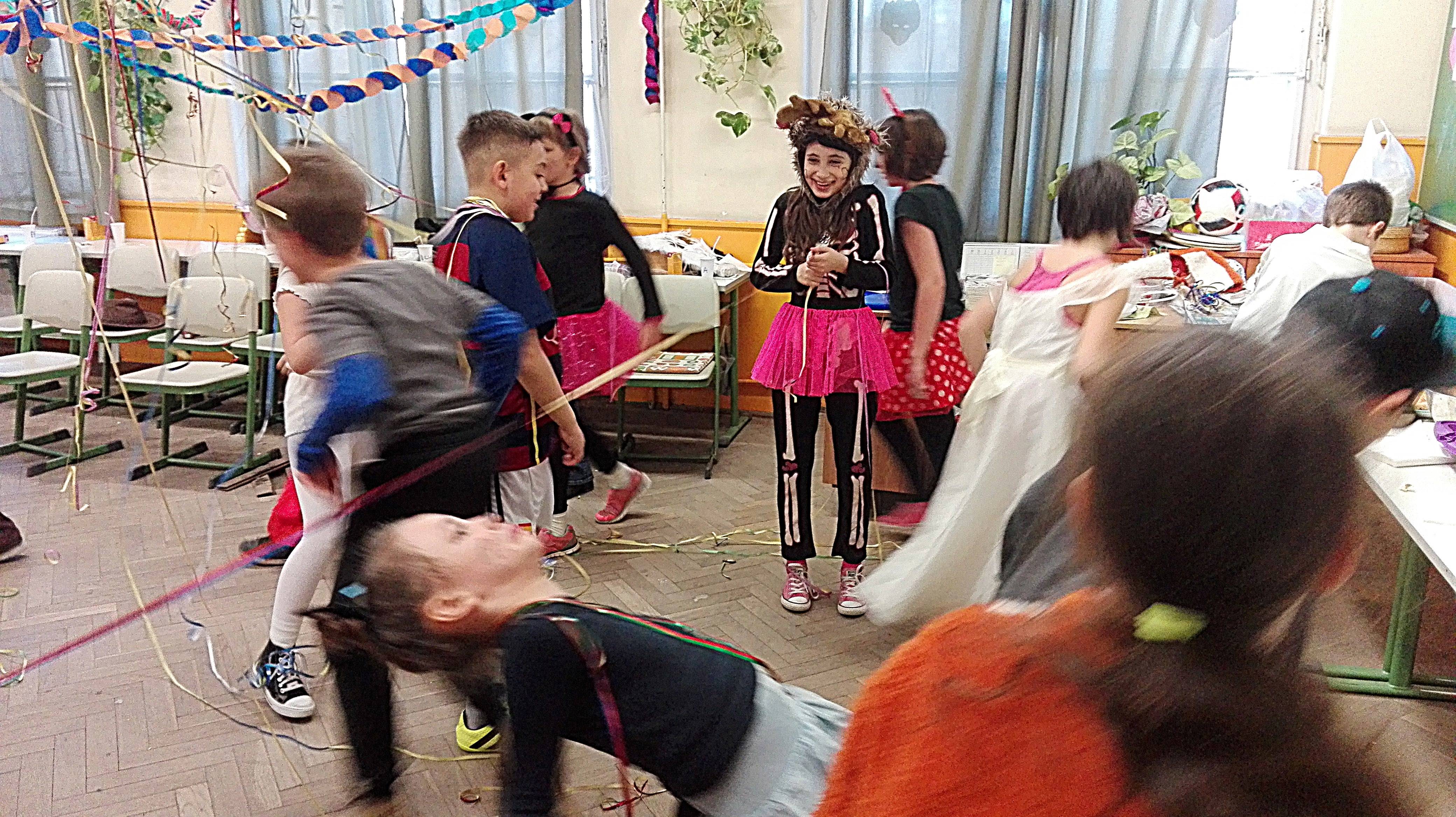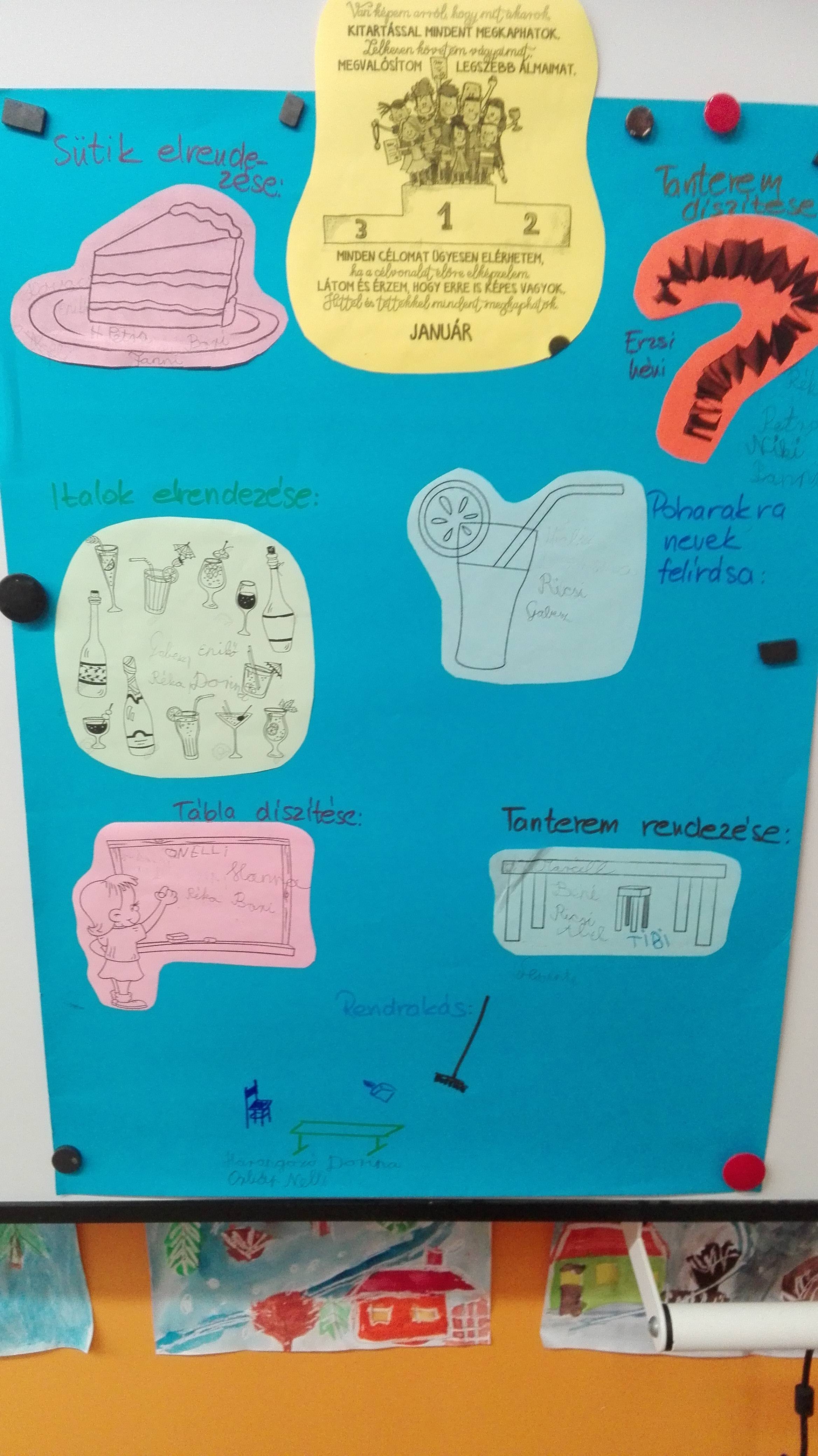 A célkitűzések keresésekor minduntalan a farsangba „botlottunk”, hiszen február elején tartottuk. Minden kisgyerek esze ott járt, hogy ki mibe öltozik be, milyen lesz, stb. Hát, ha ennyire ezen jár az eszetek, akkor szervezzük meg magunknak. És elindult az ötletelés. Rengeteg jó ötletet mondtak ők is, milyennek szeretnék a bulit. Így hát készítettünk egy menetrendet, felosztottuk a feladatokat. A szülők, akik aznap délután belátogattak hozzánk 20 izgatott, de szorgalmasan dolgozó gyereket látott. Nekünk a kolléganővel arra kellett ügyelnünk, hogy ne legyünk láb alatt. És negyed óra múlva el volt minden rendezve, sütik, innivalók, poharak elkészítve. És 20 csillogó szempár kérdezte, hogy akkor indulhat az átöltözés és indulthat a buli!!! Hát indult!!! És nagyszerüen éreztük magunkat. Még a visszapakolásra is voltak szorgos kezecskék. Hétfőn az élménybeszámolókor azt is megemlítették, hogy milyen jó volt, hogy ők csináltal mindent!